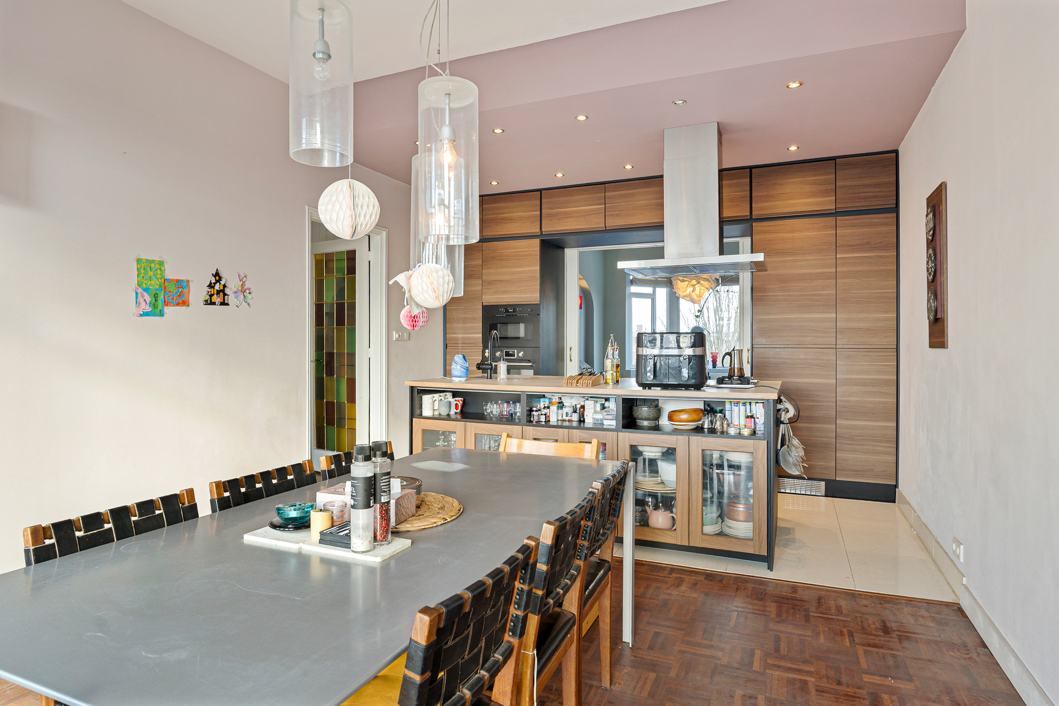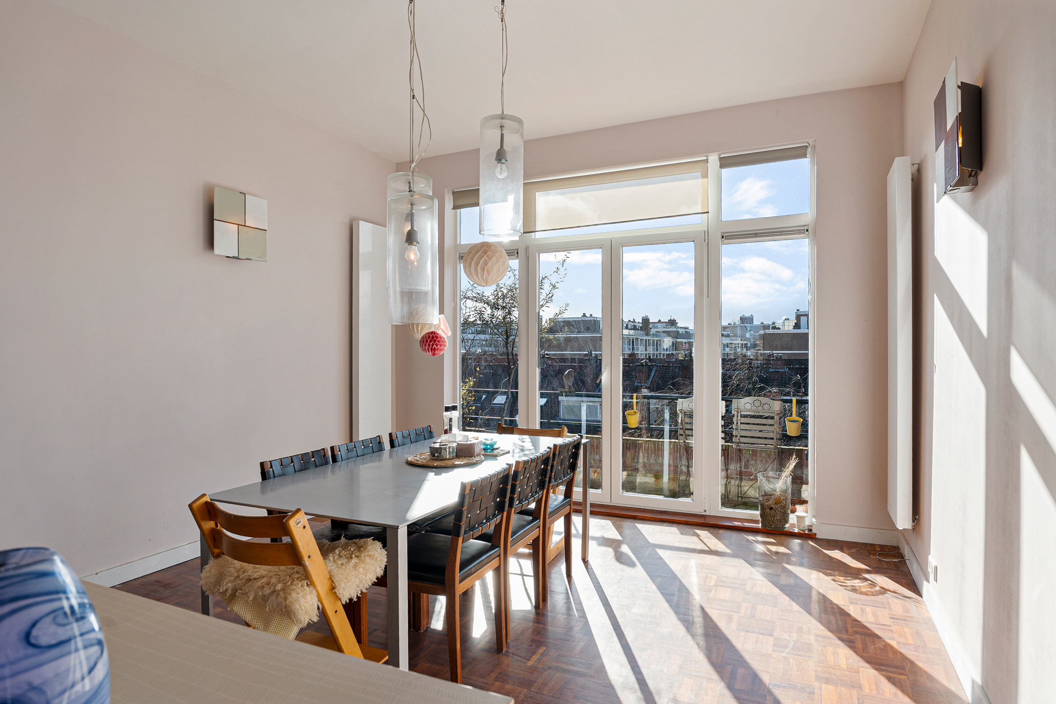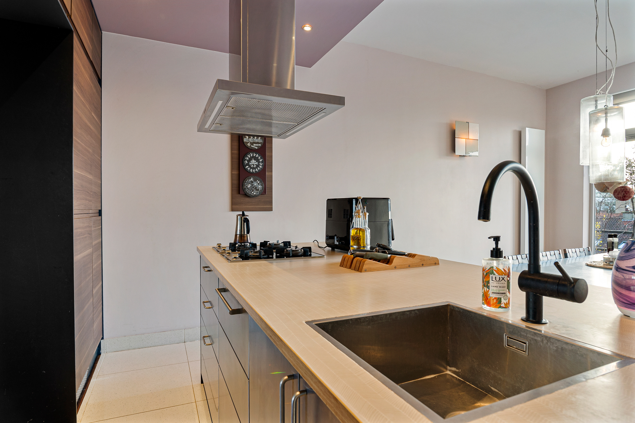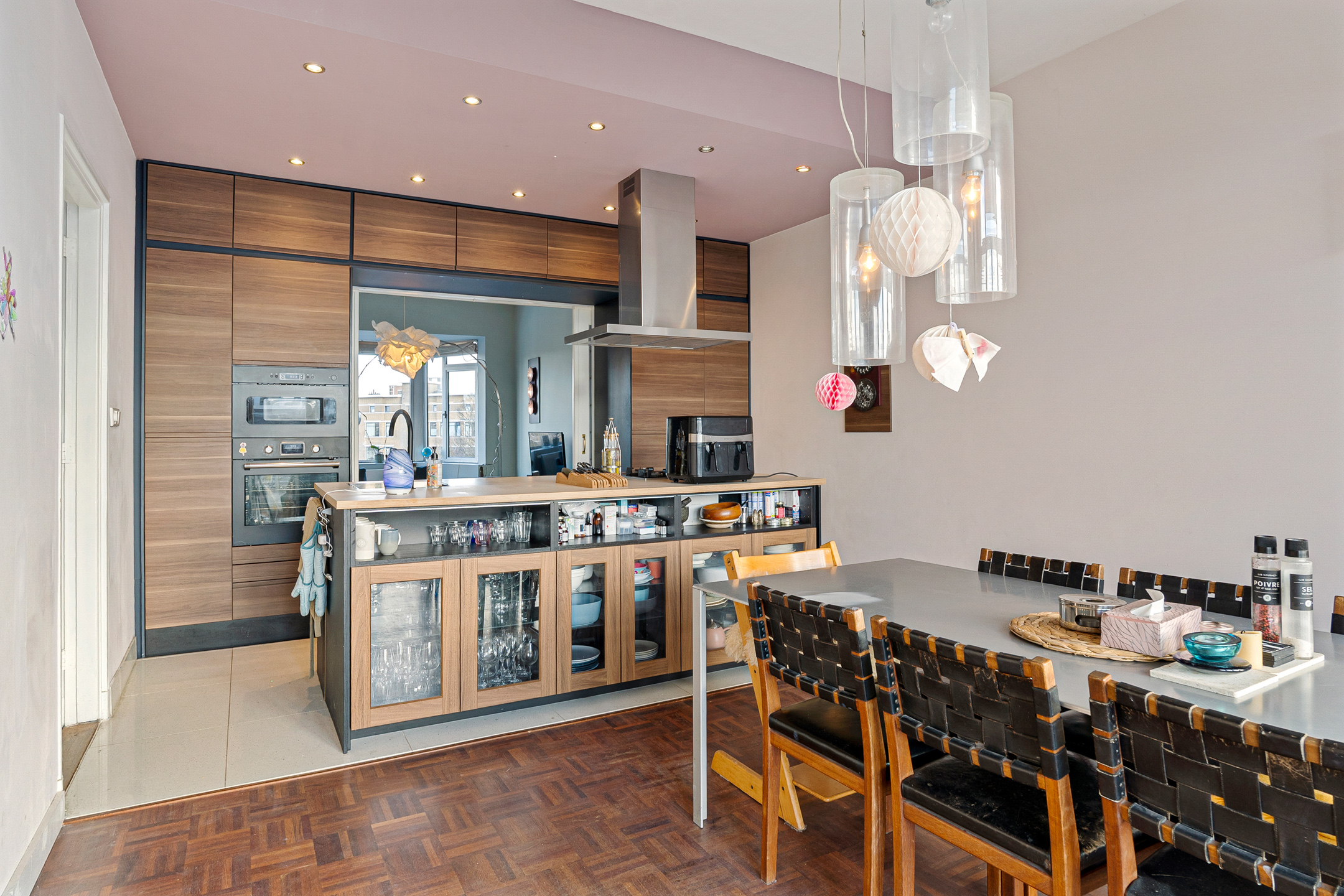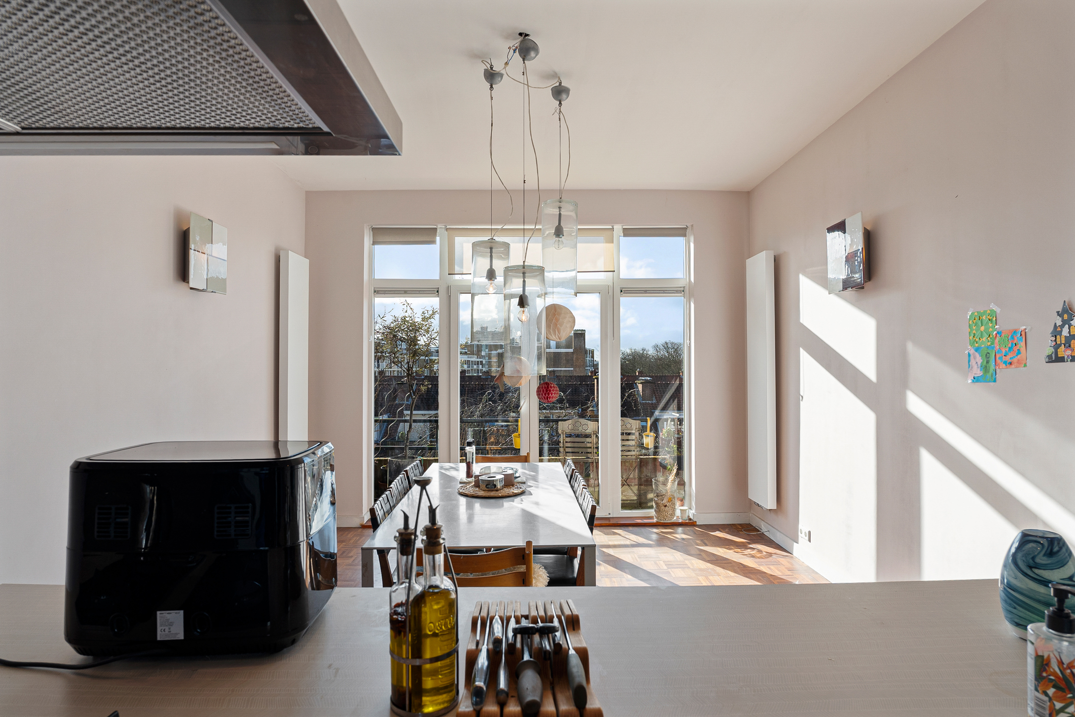 Aan de achterzijde bevindt zich de royale woonkeuken met een gezellig eetgedeelte. De keuken is voorzien van alle benodigde inbouwapparatuur en voldoende kastruimte. Via openslaande deuren is er toegang tot het zonnige balkon, dat over de volledige breedte van de woning loopt en op het zuiden is gelegen. Een perfect plekje om de dag af te sluiten!