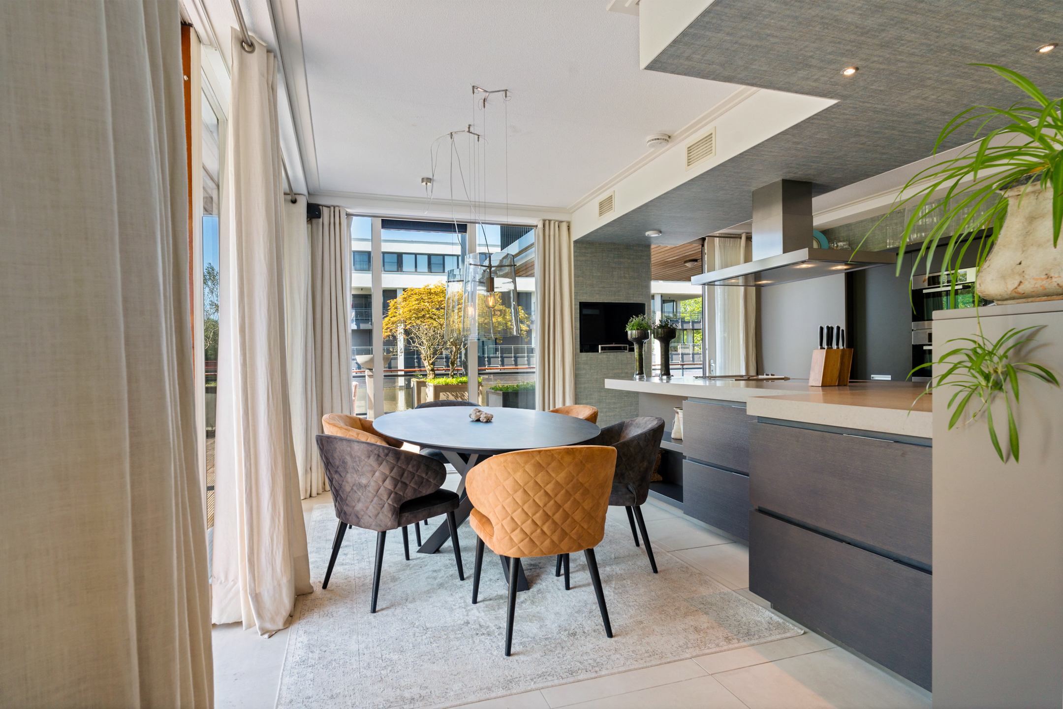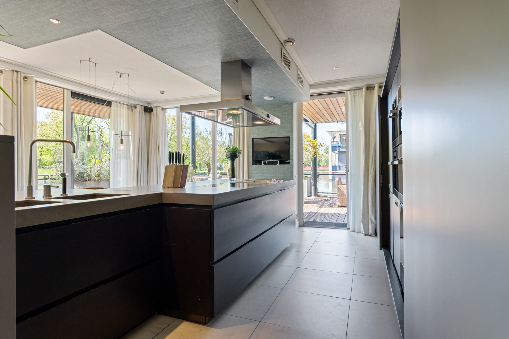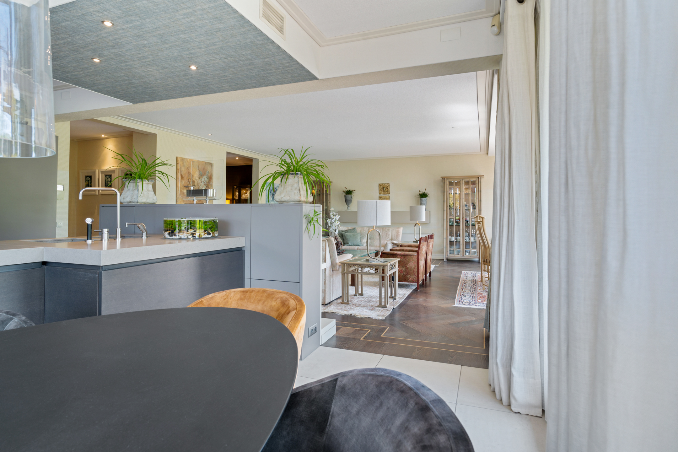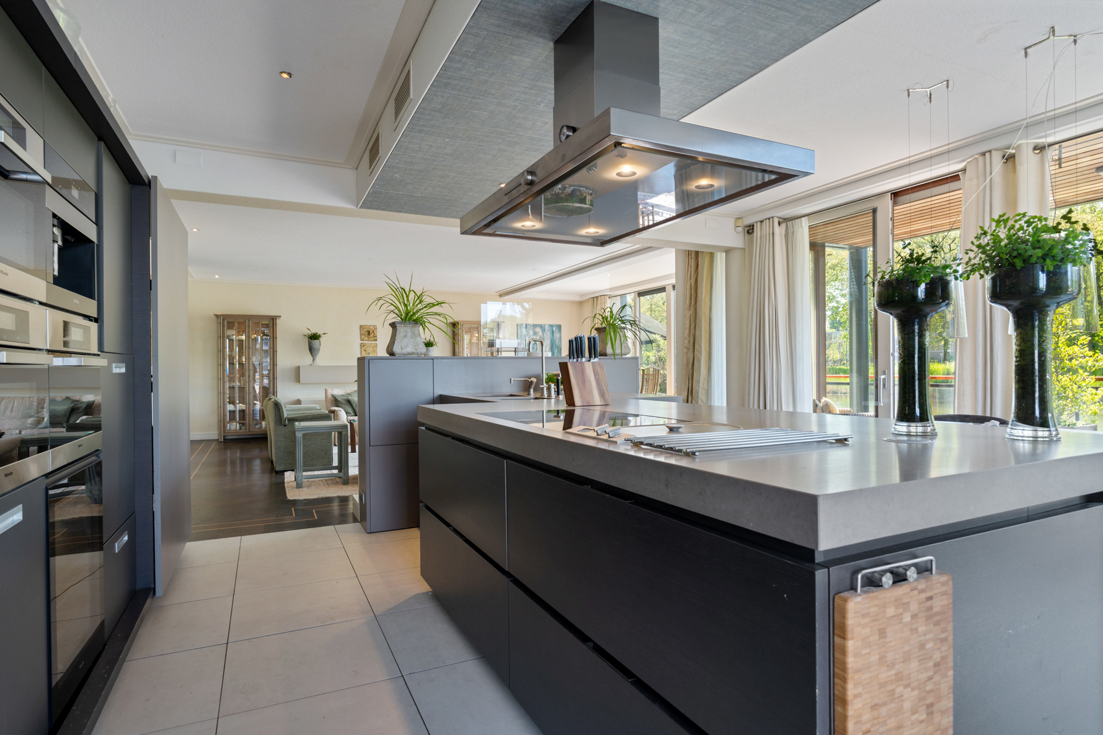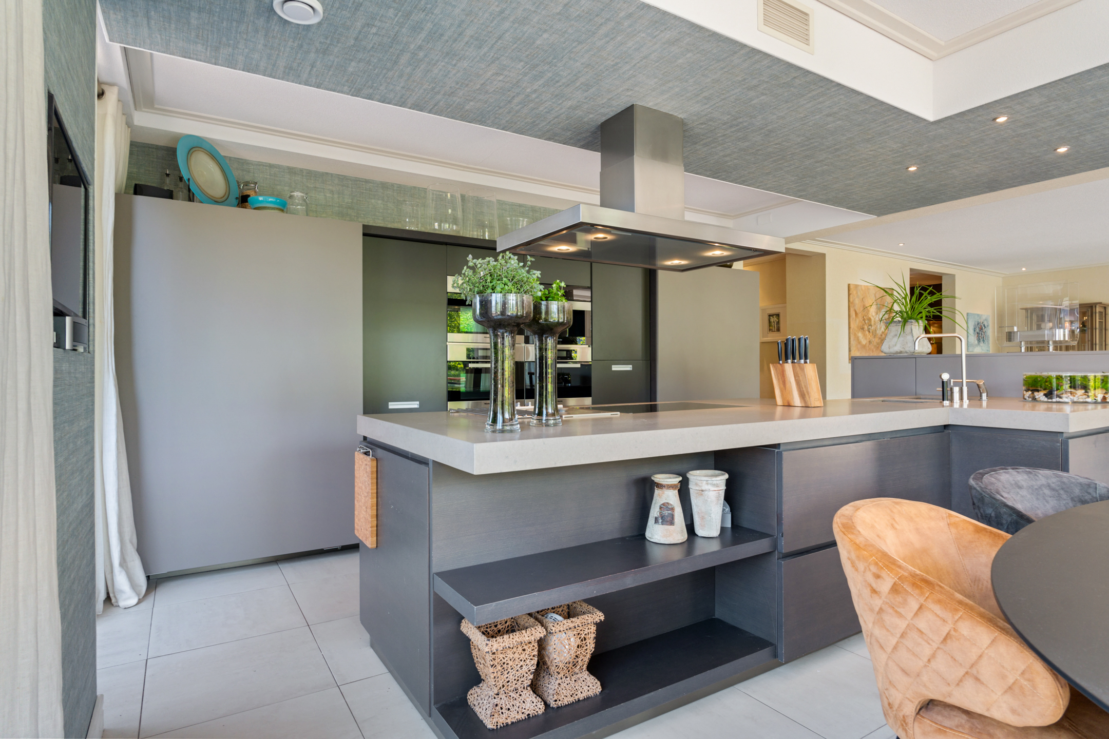 De open keuken is volledig op maat ontworpen en vormt het hart van de woning. Het ruime kookeiland en de hoogwaardige inbouwapparatuur – waaronder een inductiekookplaat, friteuse, Quooker, RVS-afzuigkap, stoomoven, twee ovens, twee koel-/vriescombinaties, wijnklimaatkast en inbouwkoffiemachine – maken deze keuken een droom voor elke kookliefhebber.