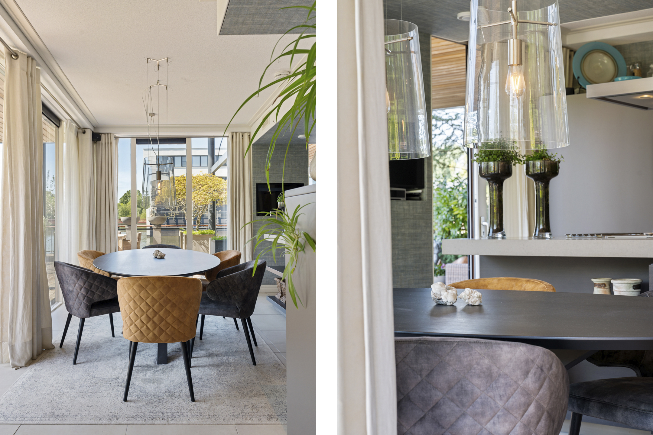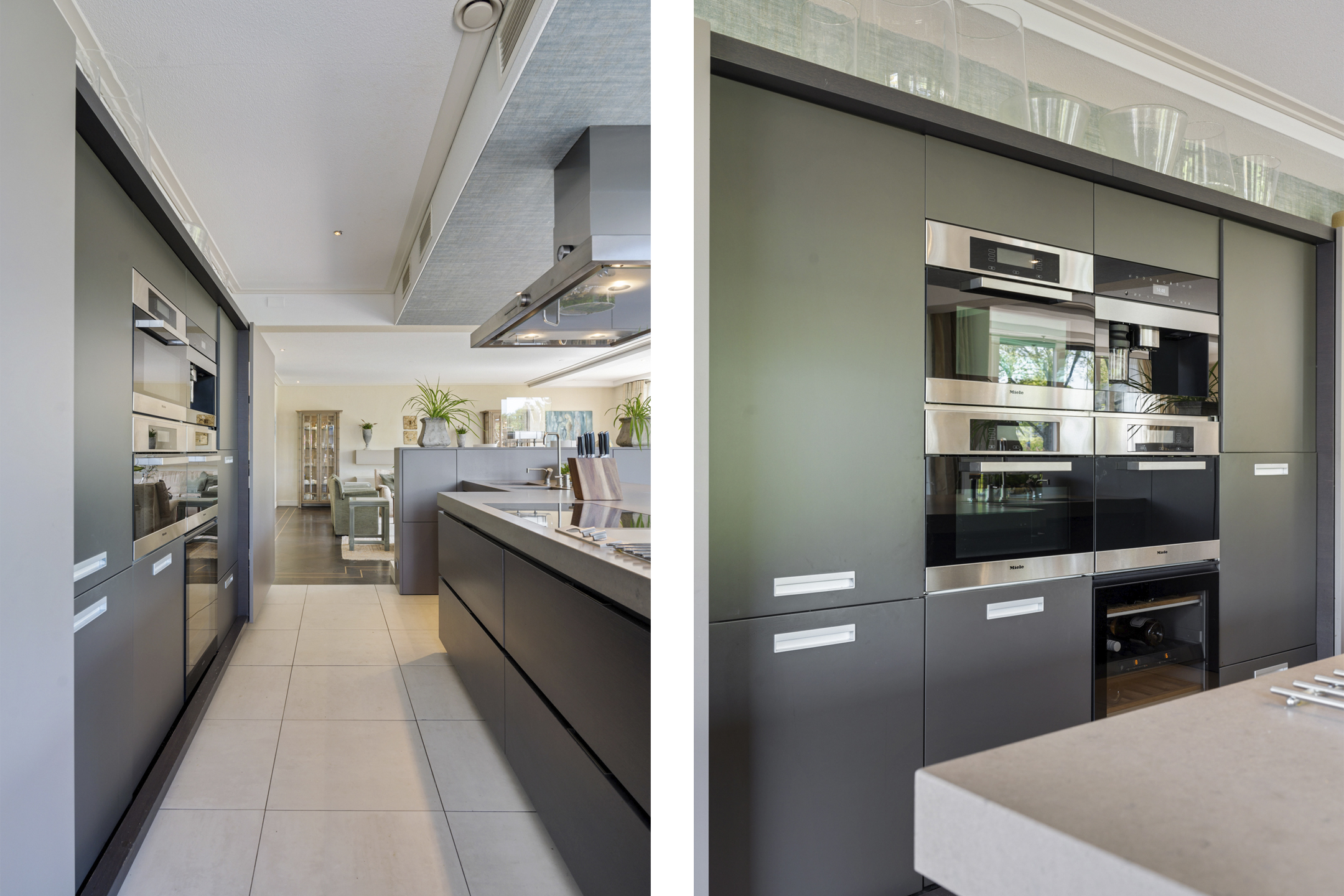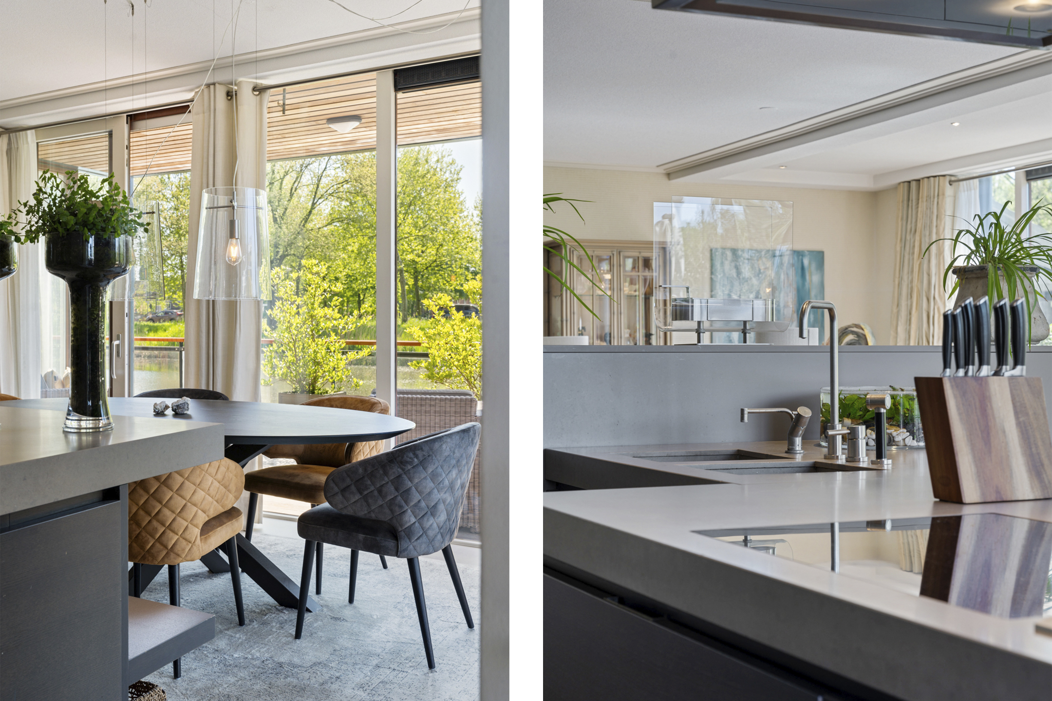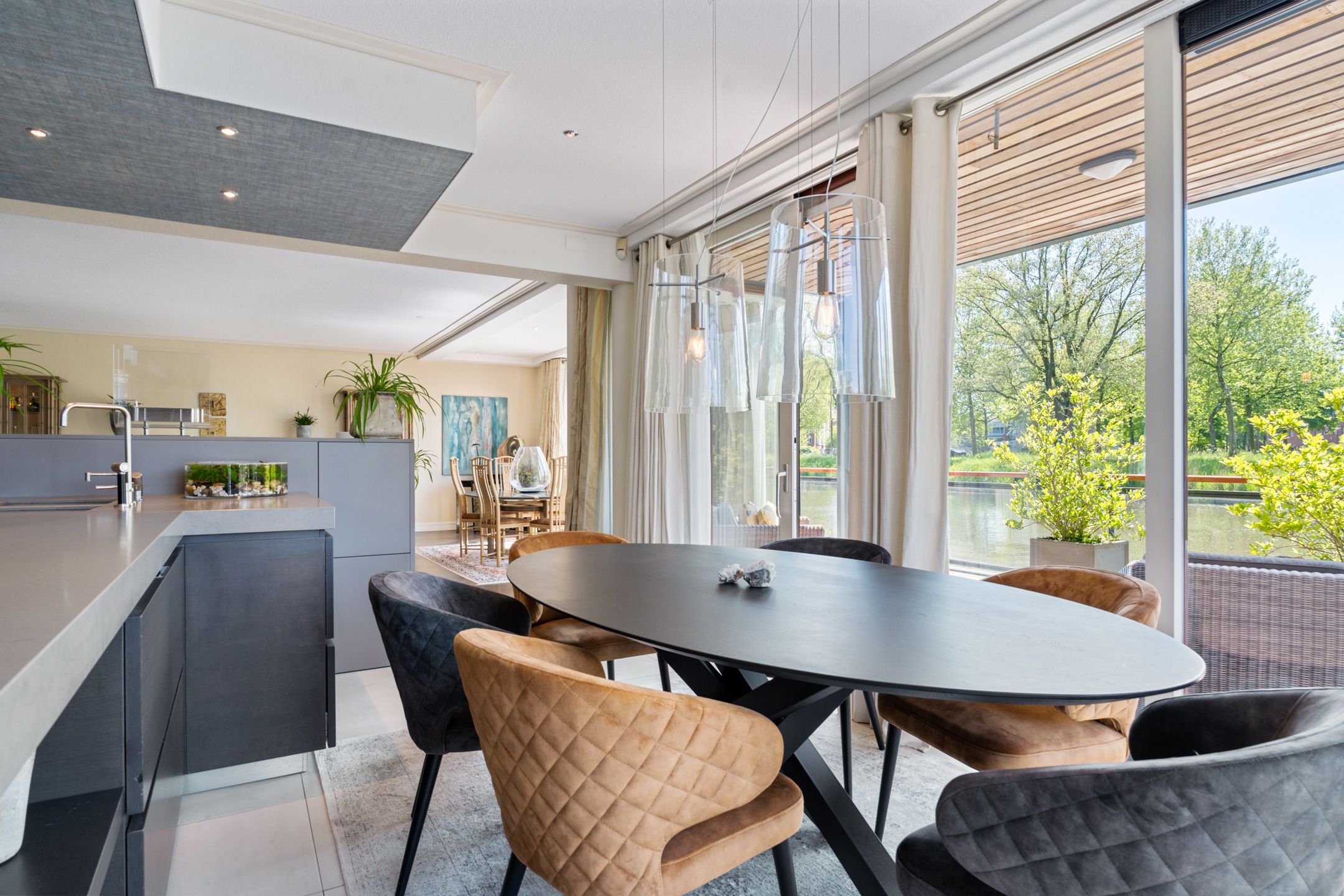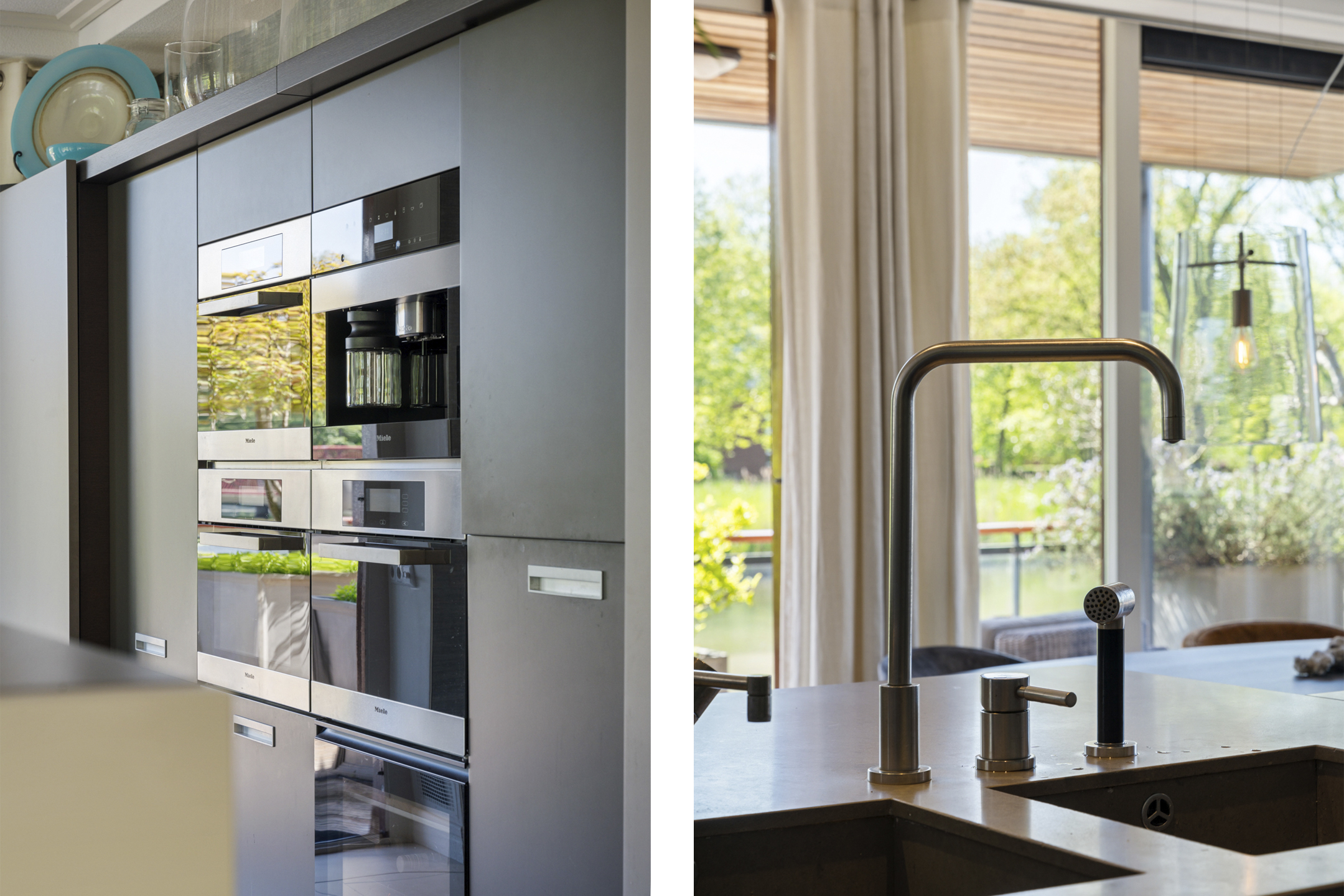 De open keuken is volledig op maat ontworpen en vormt het hart van de woning. Het ruime kookeiland en de hoogwaardige inbouwapparatuur – waaronder een inductiekookplaat, friteuse, Quooker, RVS-afzuigkap, stoomoven, twee ovens, twee koel-/vriescombinaties, wijnklimaatkast en inbouwkoffiemachine – maken deze keuken een droom voor elke kookliefhebber.