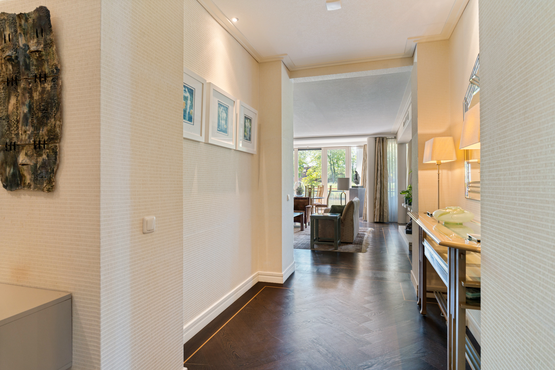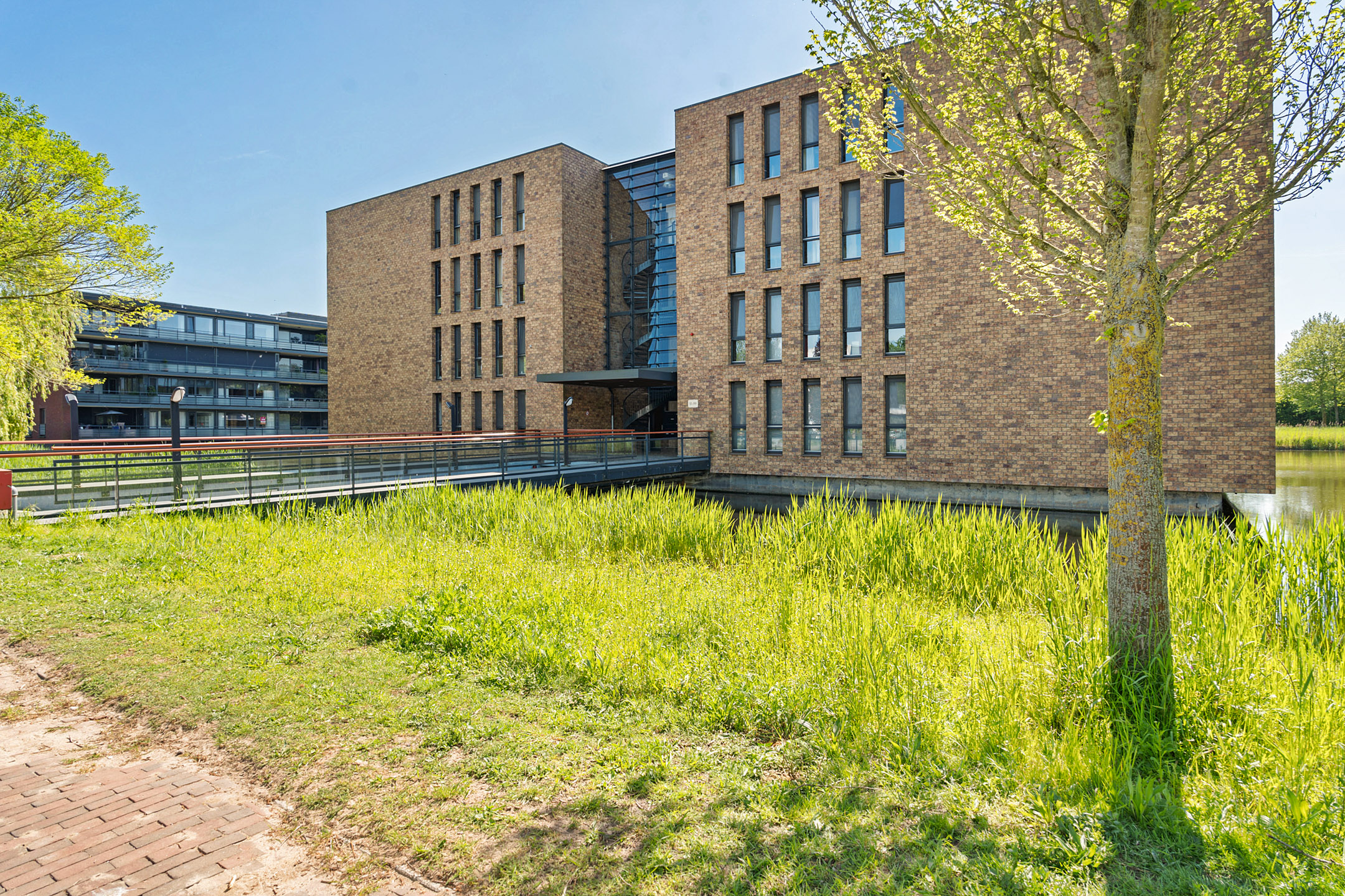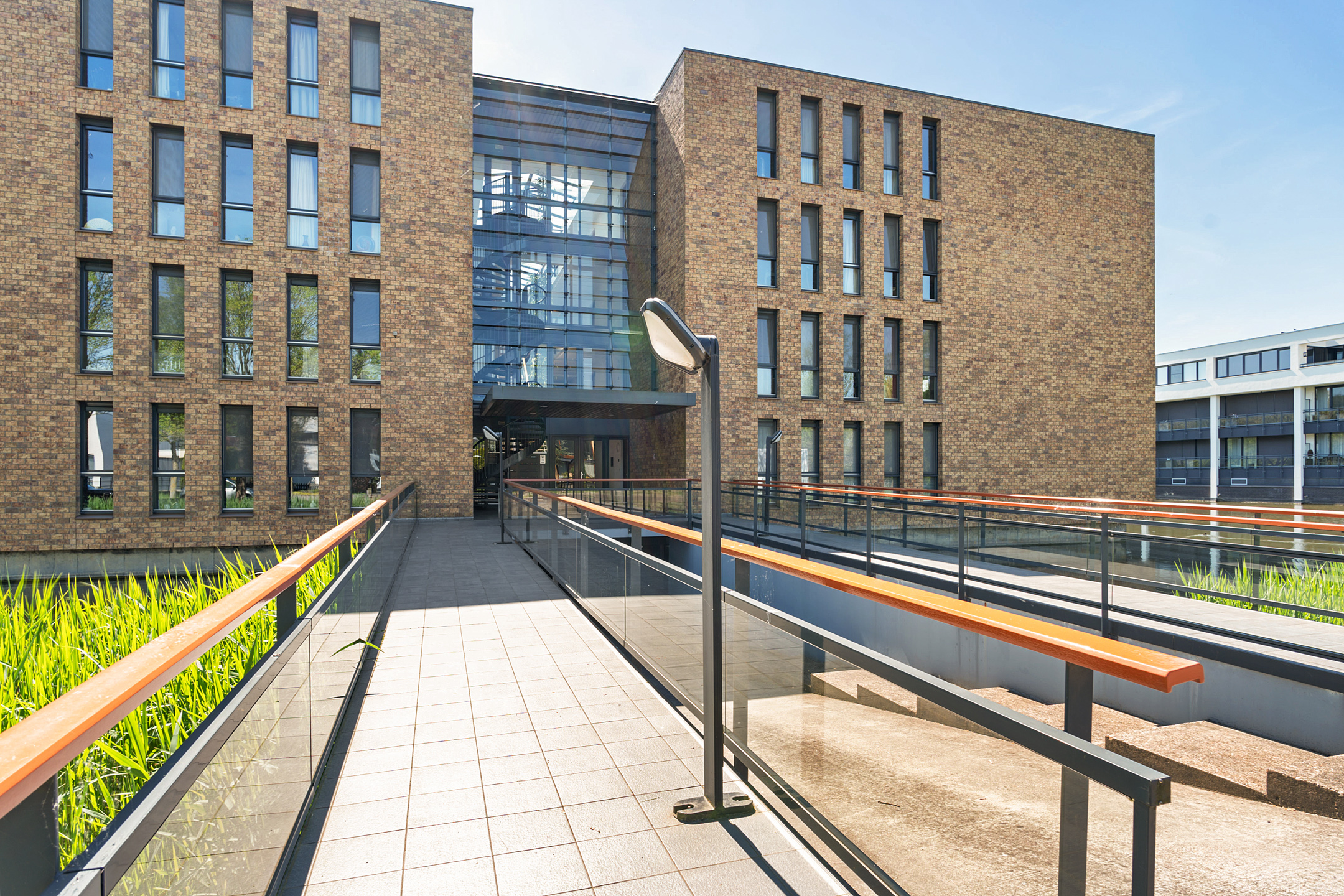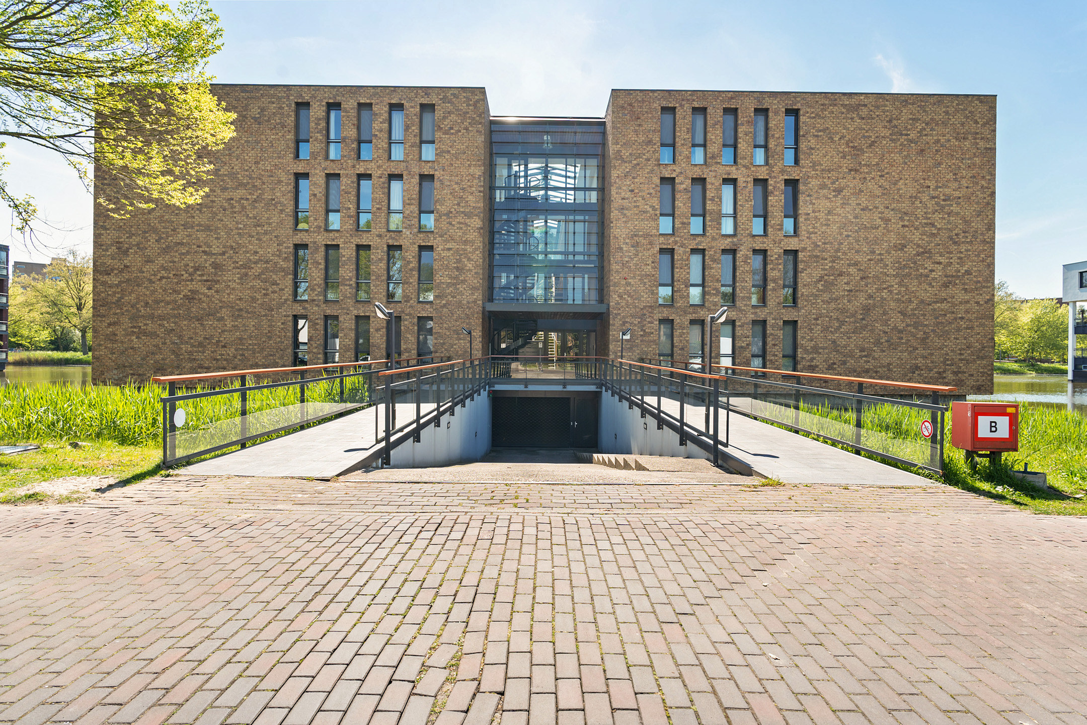 Je betreedt het luxe complex via een stijlvolle loopbrug, omgeven door water voor optimale privacy. De ruime entree met statige trapopgang en automatische deuropening geven direct een gevoel van luxe en comfort. Vanuit de ondergrondse parkeergarage heb je direct toegang tot het appartement.