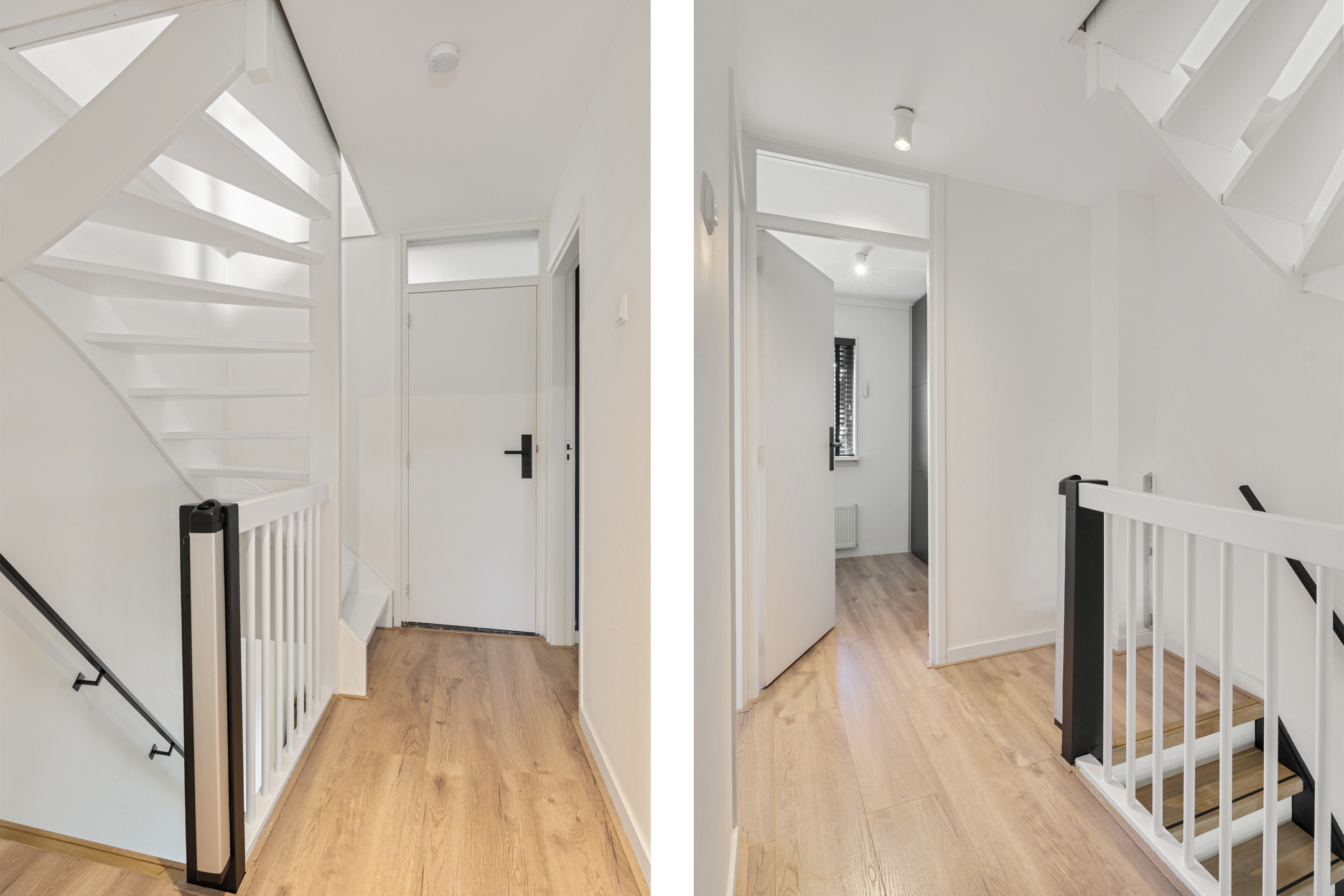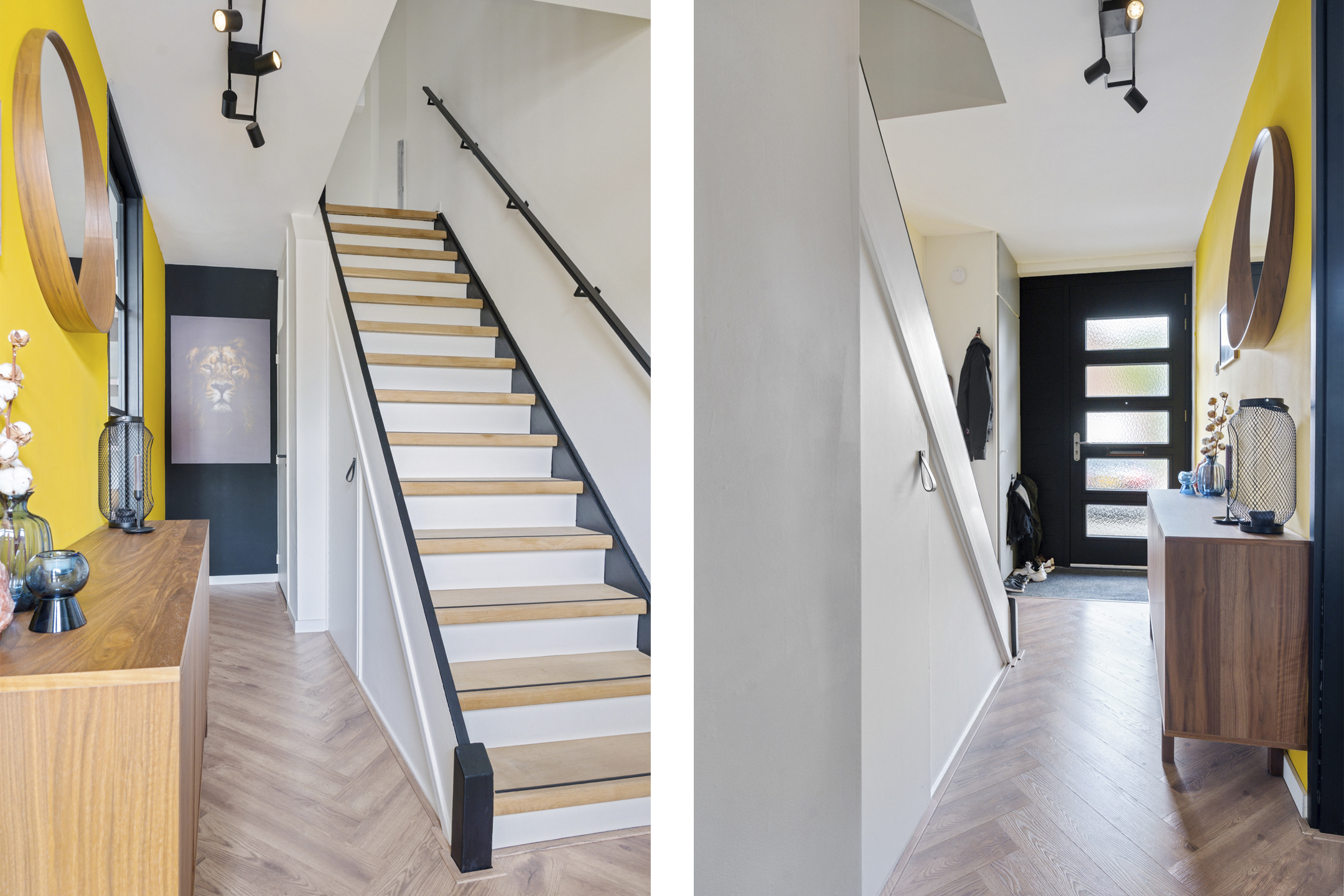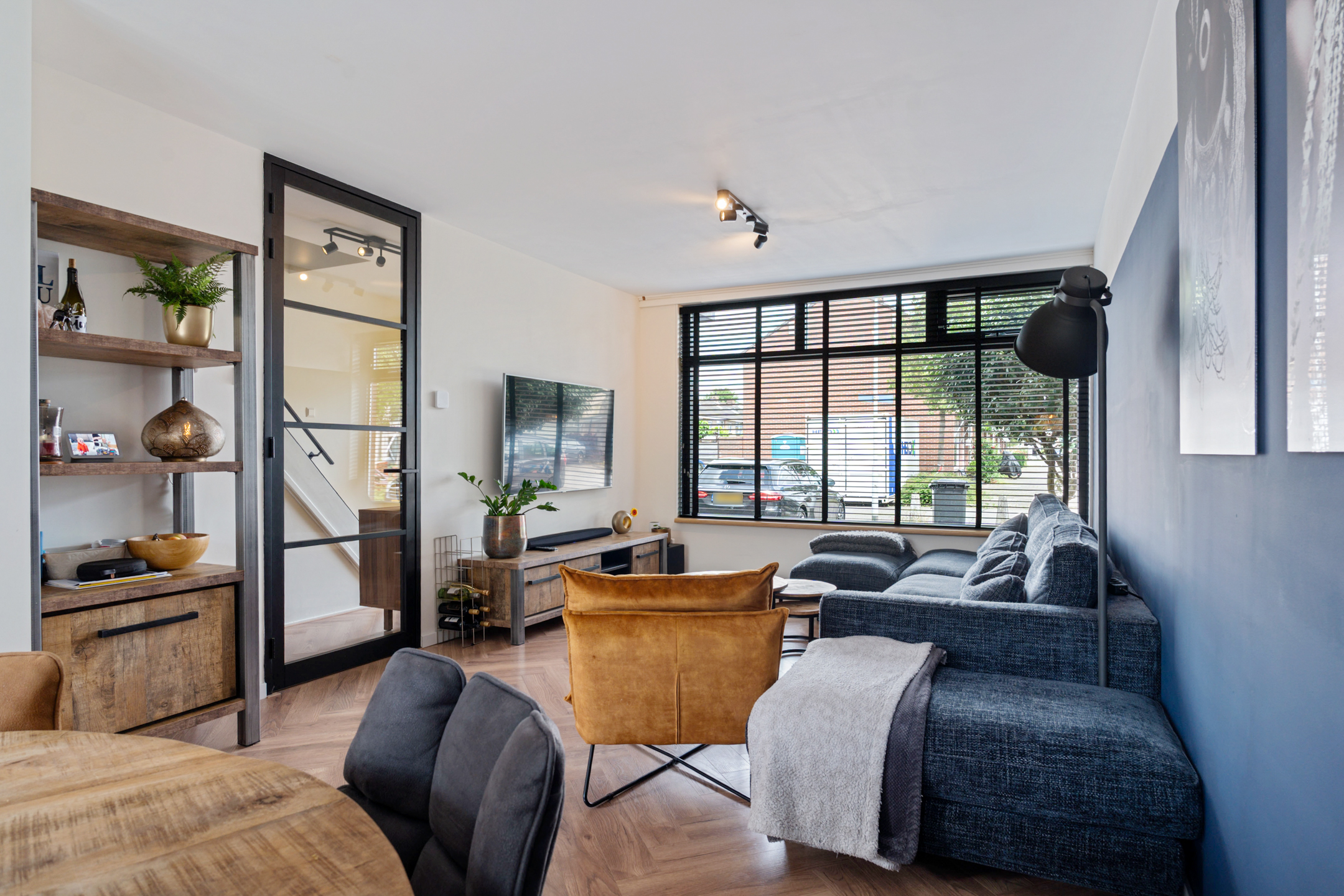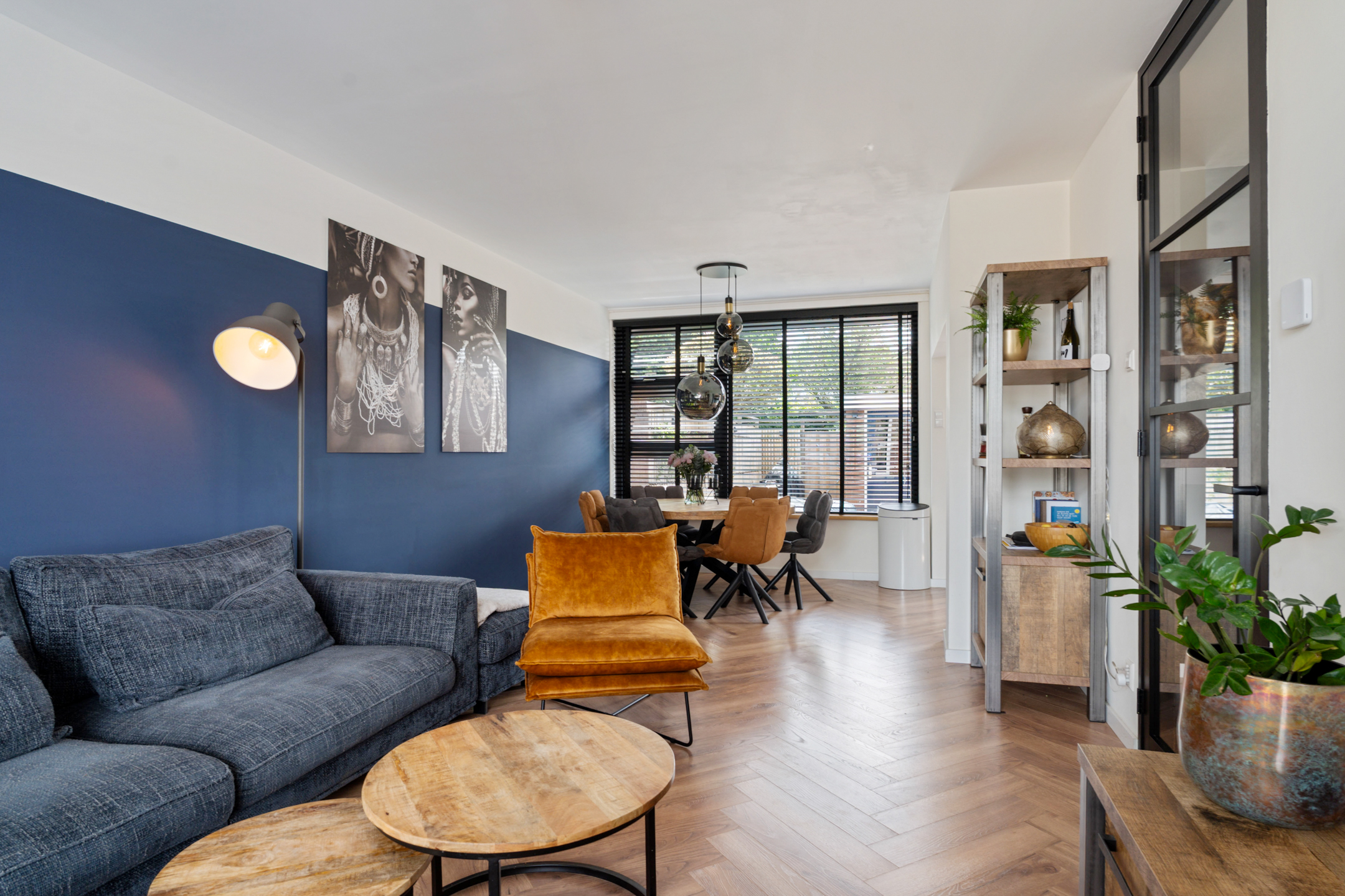 Via de nette voortuin stap je binnen in een ruime hal met trapopgang, trapkast en modern toilet. De glazen taatsdeur vormt een prachtige overgang naar de doorzonwoonkamer, waar het licht van beide kanten royaal naar binnen valt. De visgraatvloer met vloerverwarming, strak gestuukte wanden en warme kleuren zorgen voor een luxe en sfeervolle uitstraling.