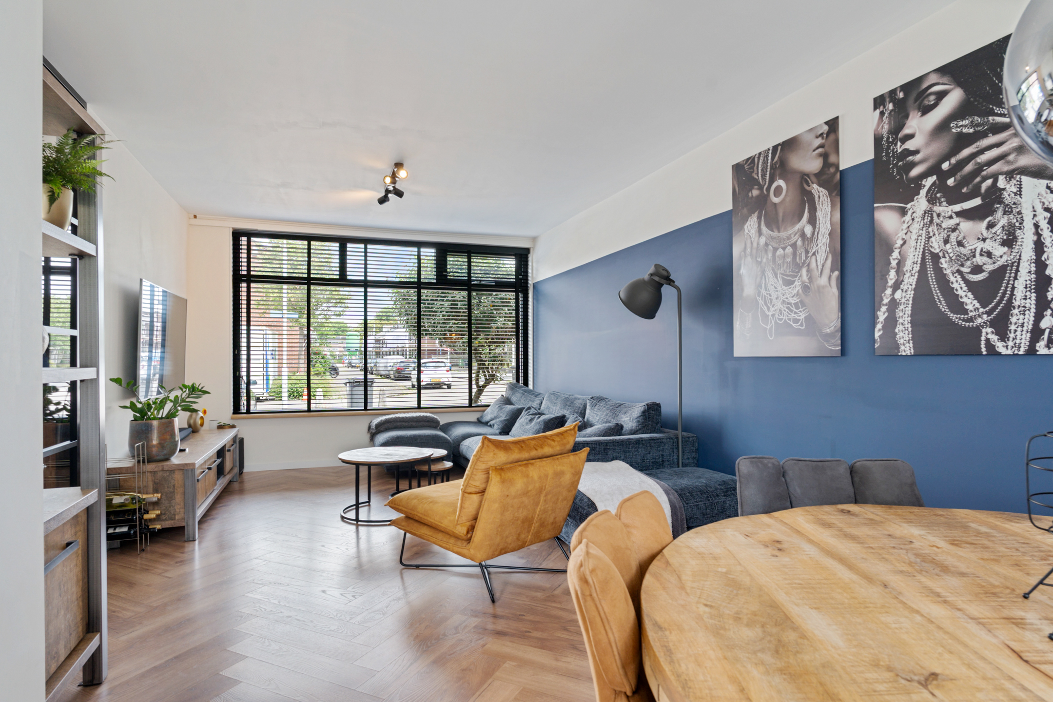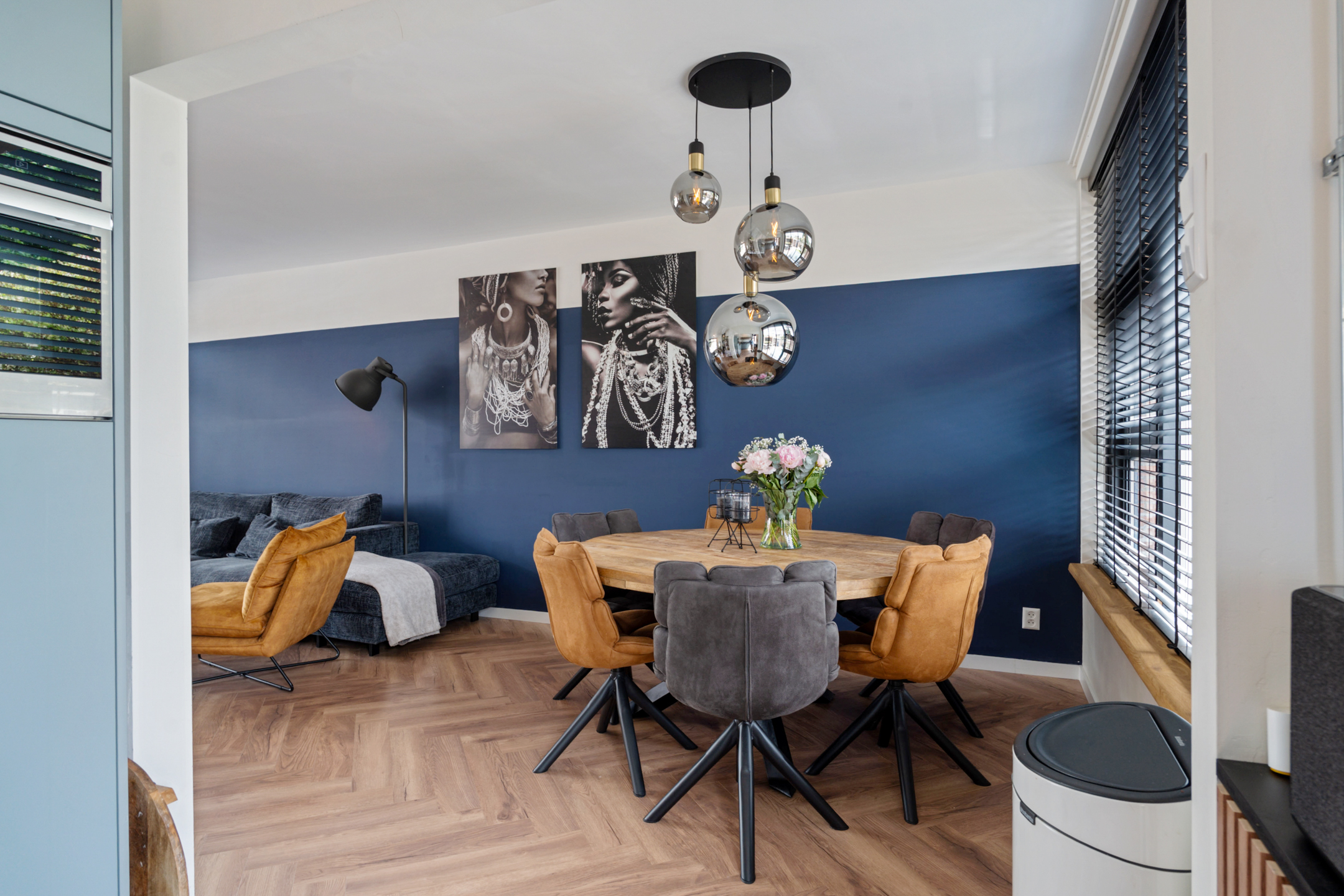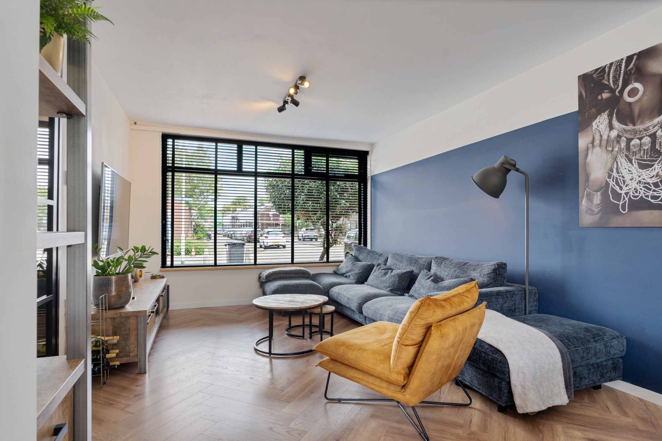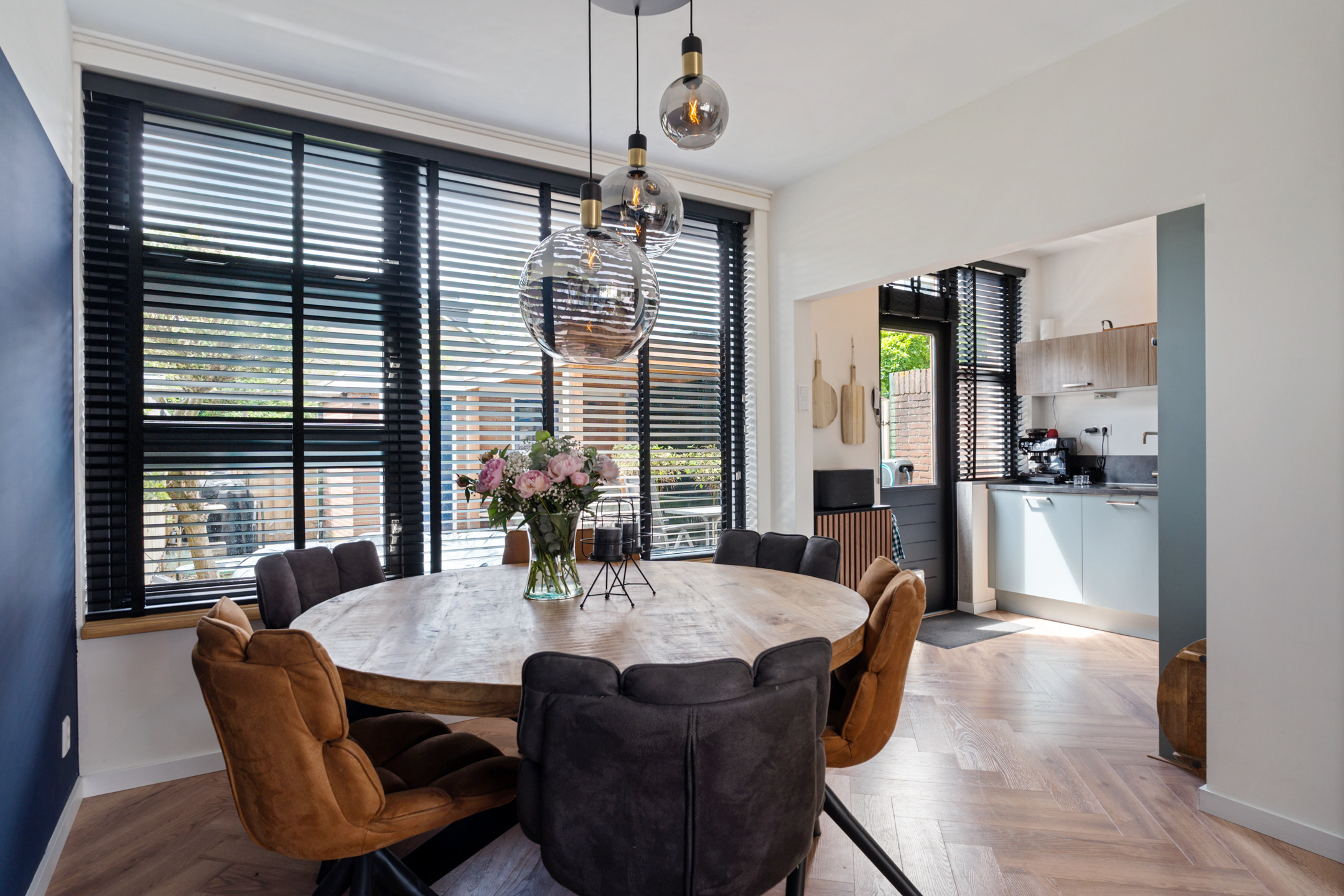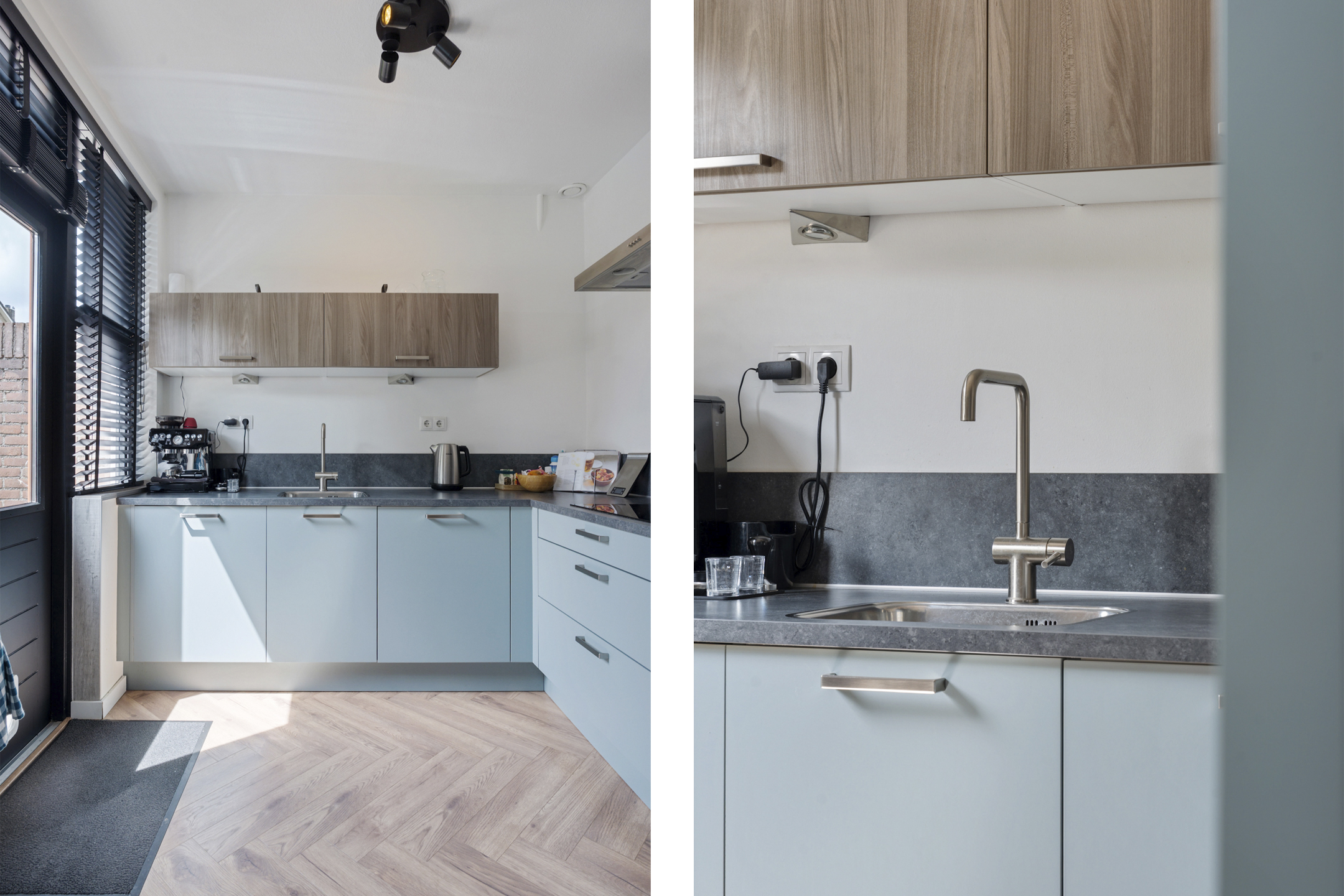 Via de nette voortuin stap je binnen in een ruime hal met trapopgang, trapkast en modern toilet. De glazen taatsdeur vormt een prachtige overgang naar de doorzonwoonkamer, waar het licht van beide kanten royaal naar binnen valt. De visgraatvloer met vloerverwarming, strak gestuukte wanden en warme kleuren zorgen voor een luxe en sfeervolle uitstraling.