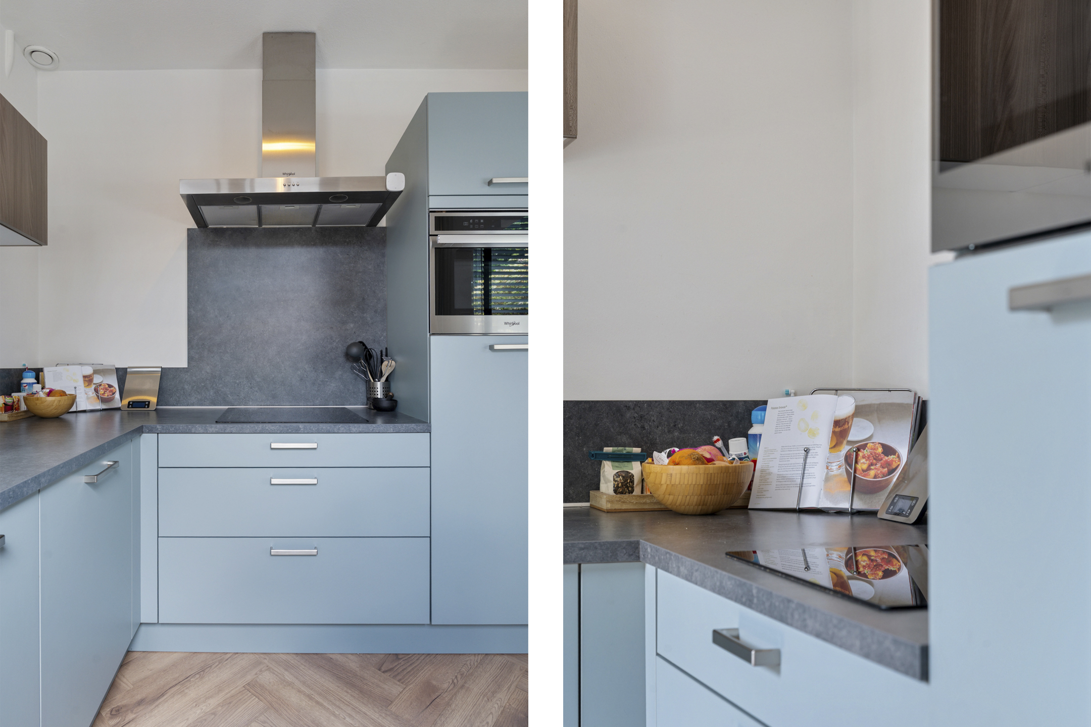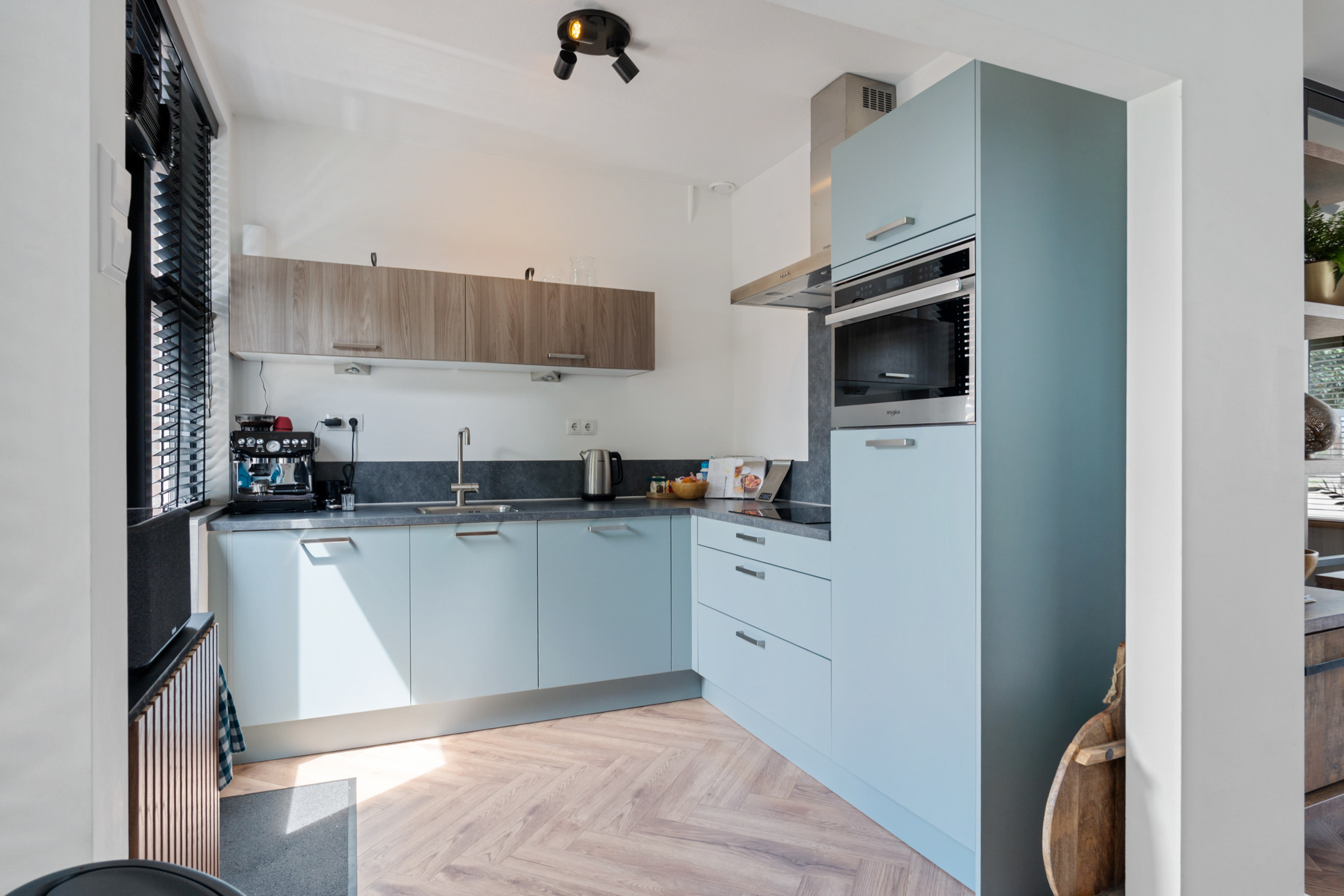 De open keuken in L-opstelling sluit hier naadloos op aan. Dankzij de slimme indeling en hoogwaardige afwerking wordt koken hier een plezier. De keuken is voorzien van een inductiekookplaat, combi-oven, koelkast met vriesvak, vaatwasser en volop kastruimte.