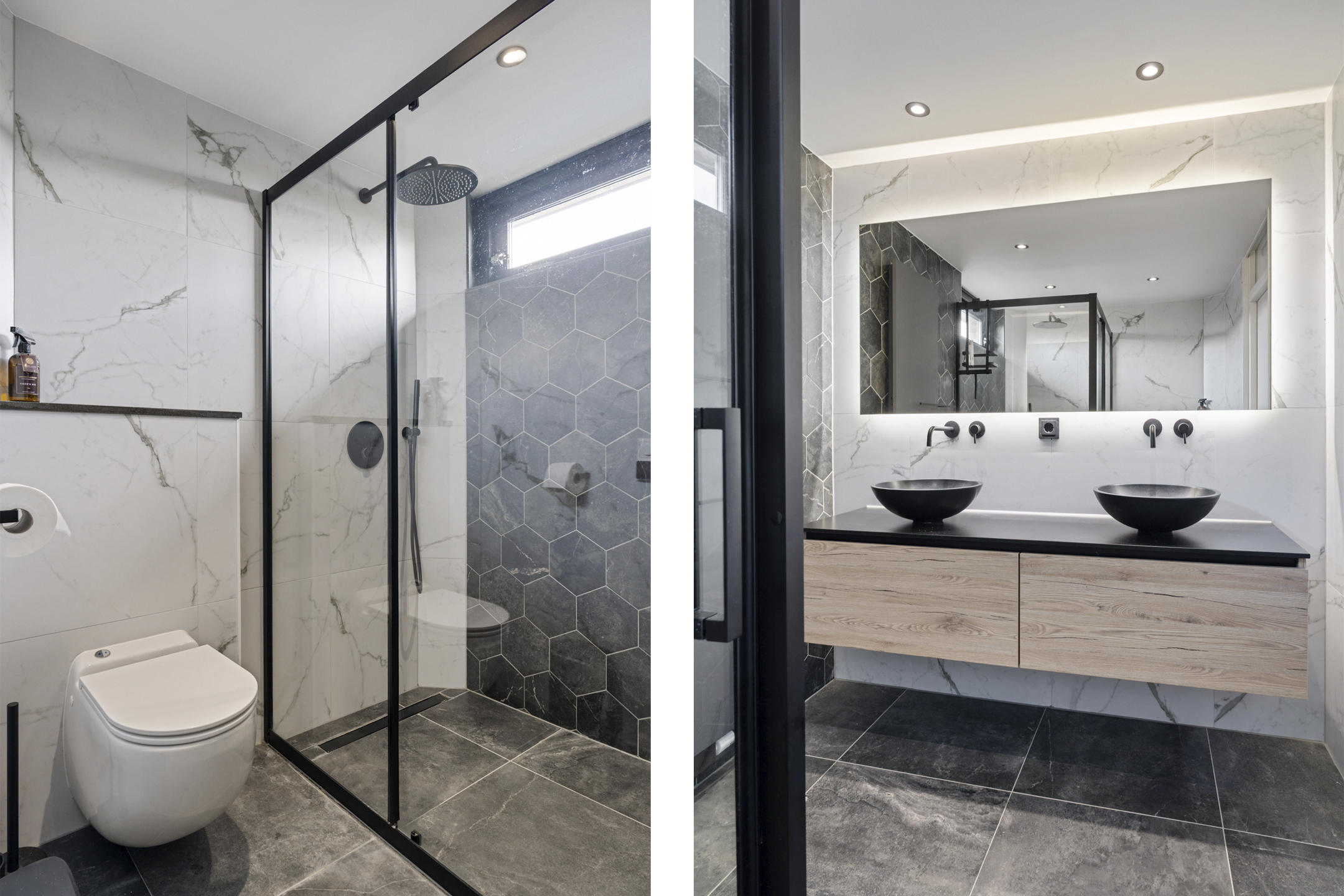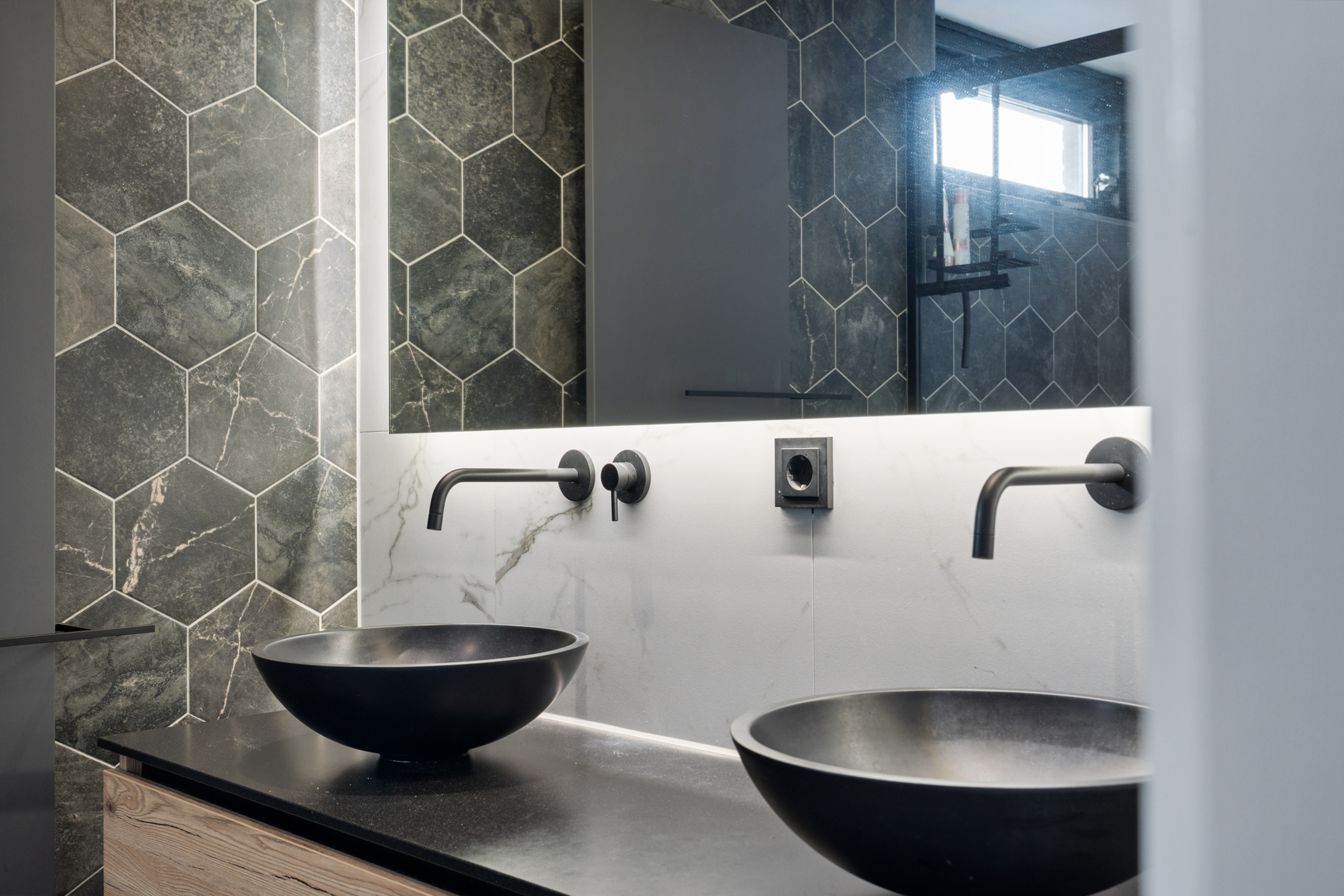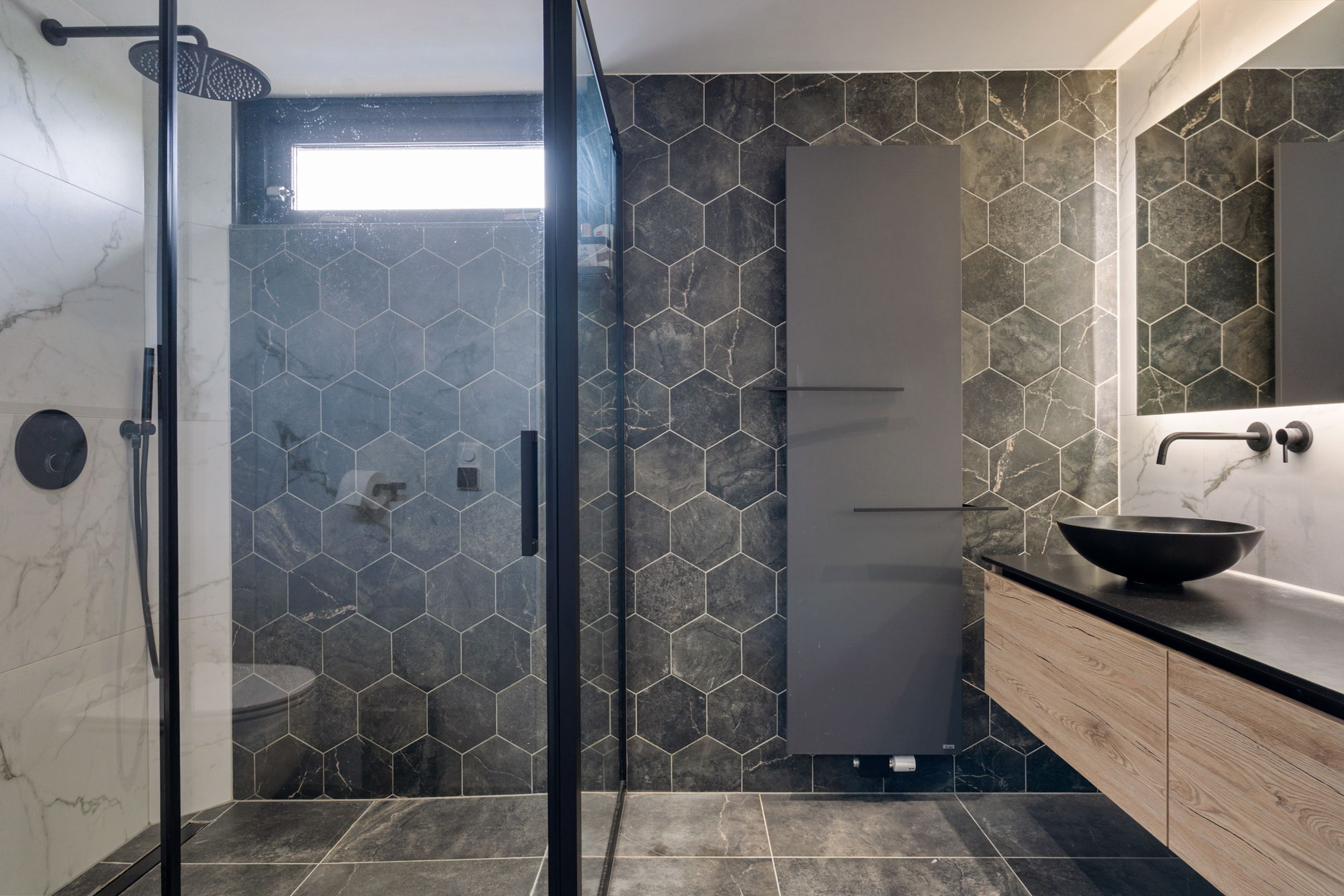 De badkamer is een echte eyecatcher. Met twee moderne vrijstaande wastafels met inbouwkranen, elektrische vloerverwarming en een verwarmde spiegel inclusief verlichting, een royale regendouche, wandcloset, designradiator en smaakvolle verlichting is deze ruimte tot in detail afgewerkt. Comfort en stijl komen hier prachtig samen.