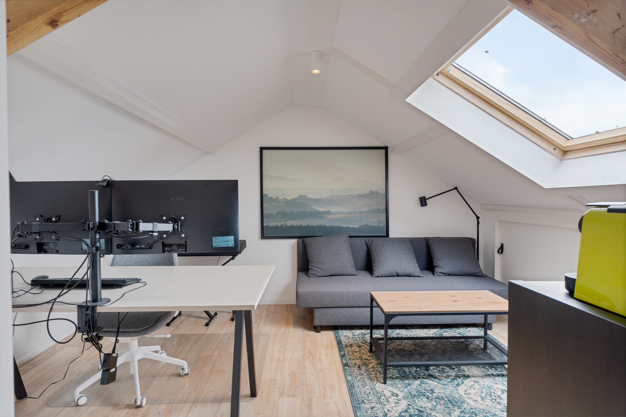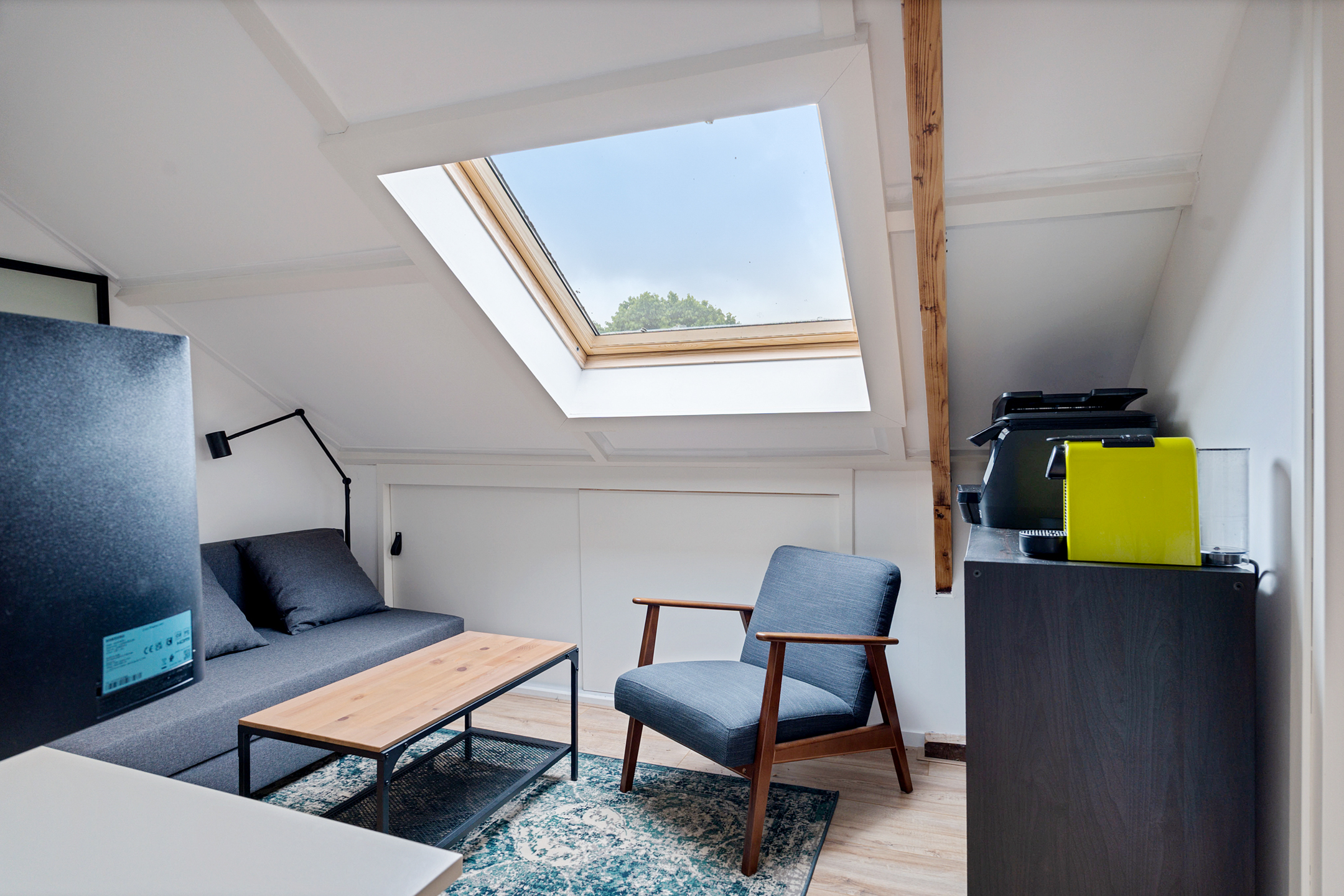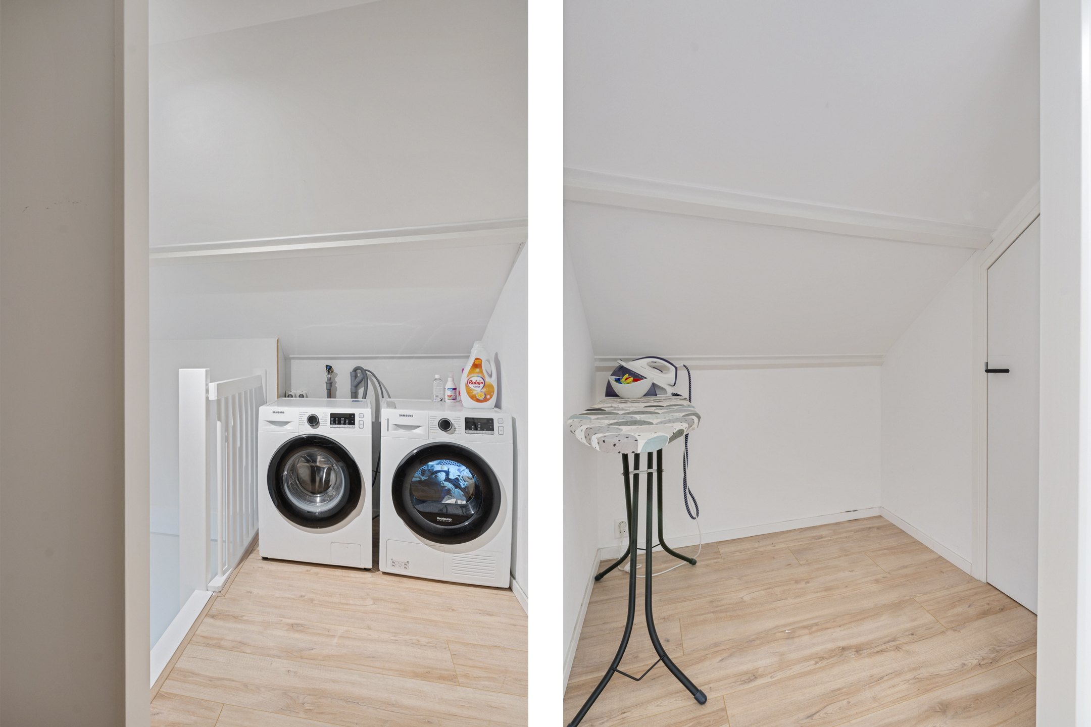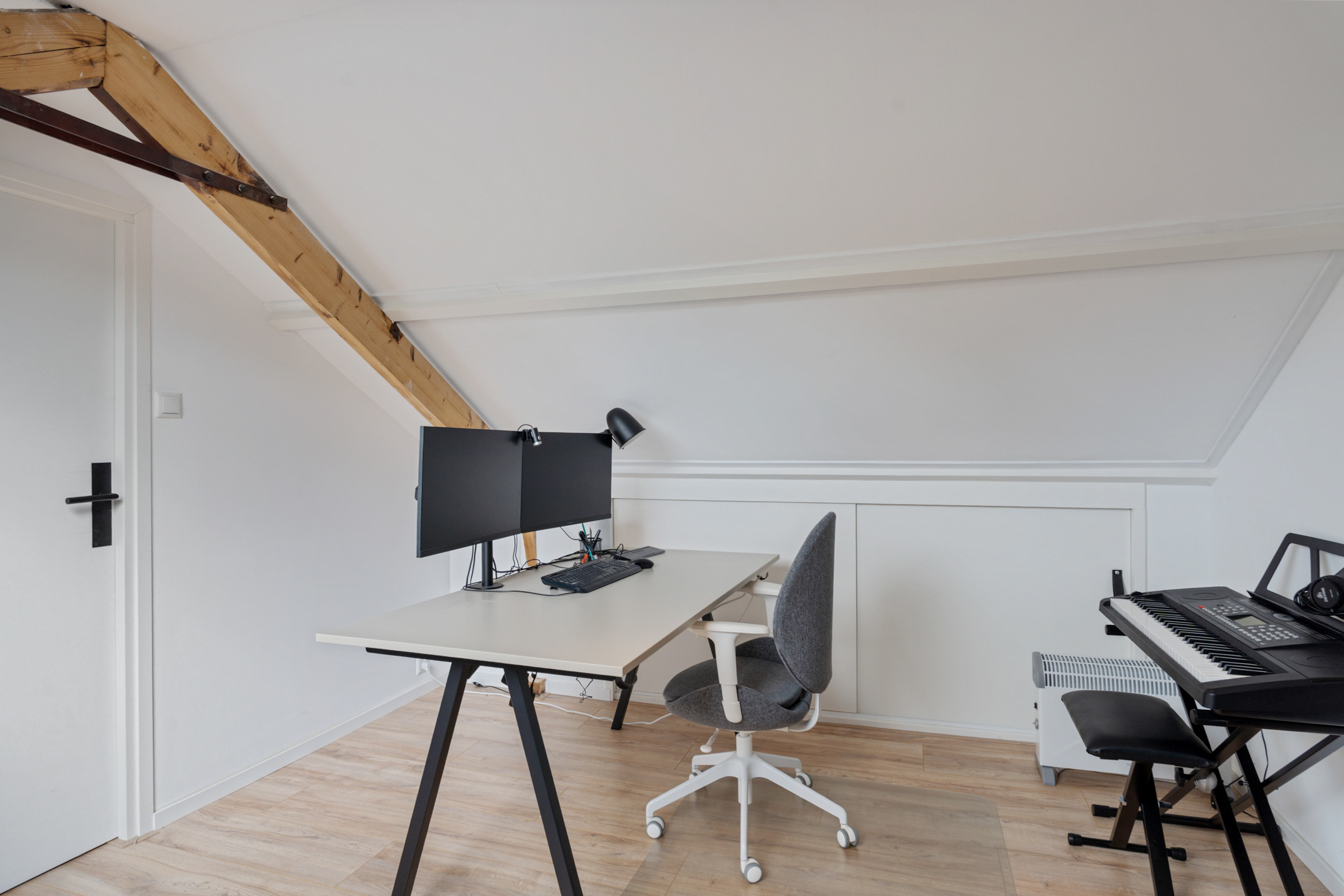 De zolder biedt volop mogelijkheden. Op de overloop is ruimte voor je wasmachine en droger, en de zolderkamer is momenteel in gebruik als werkkamer. Dankzij het dakraam en de knieschotten is dit een praktische, lichte ruimte die je ook kunt inrichten als logeer- of speelkamer.