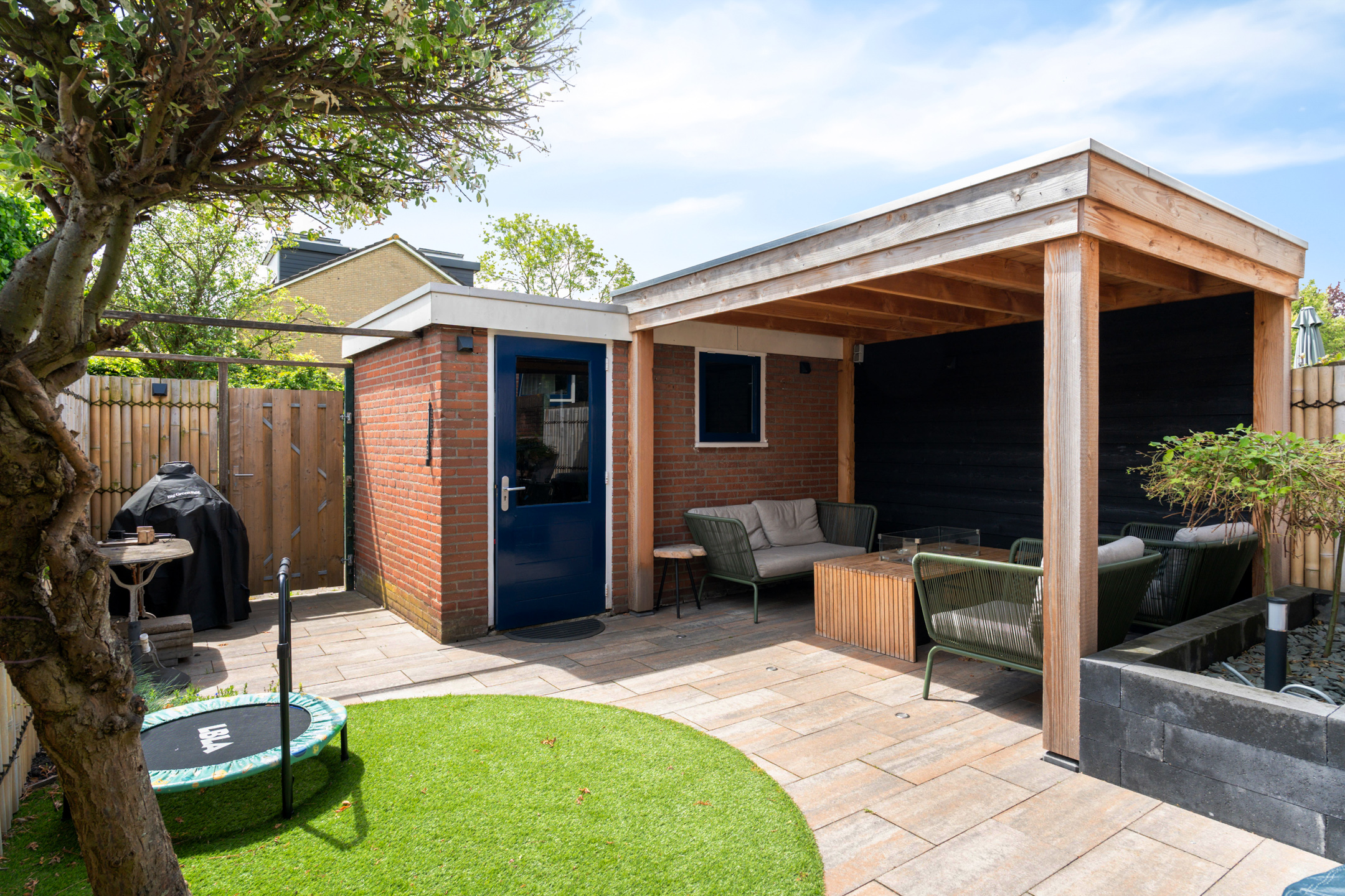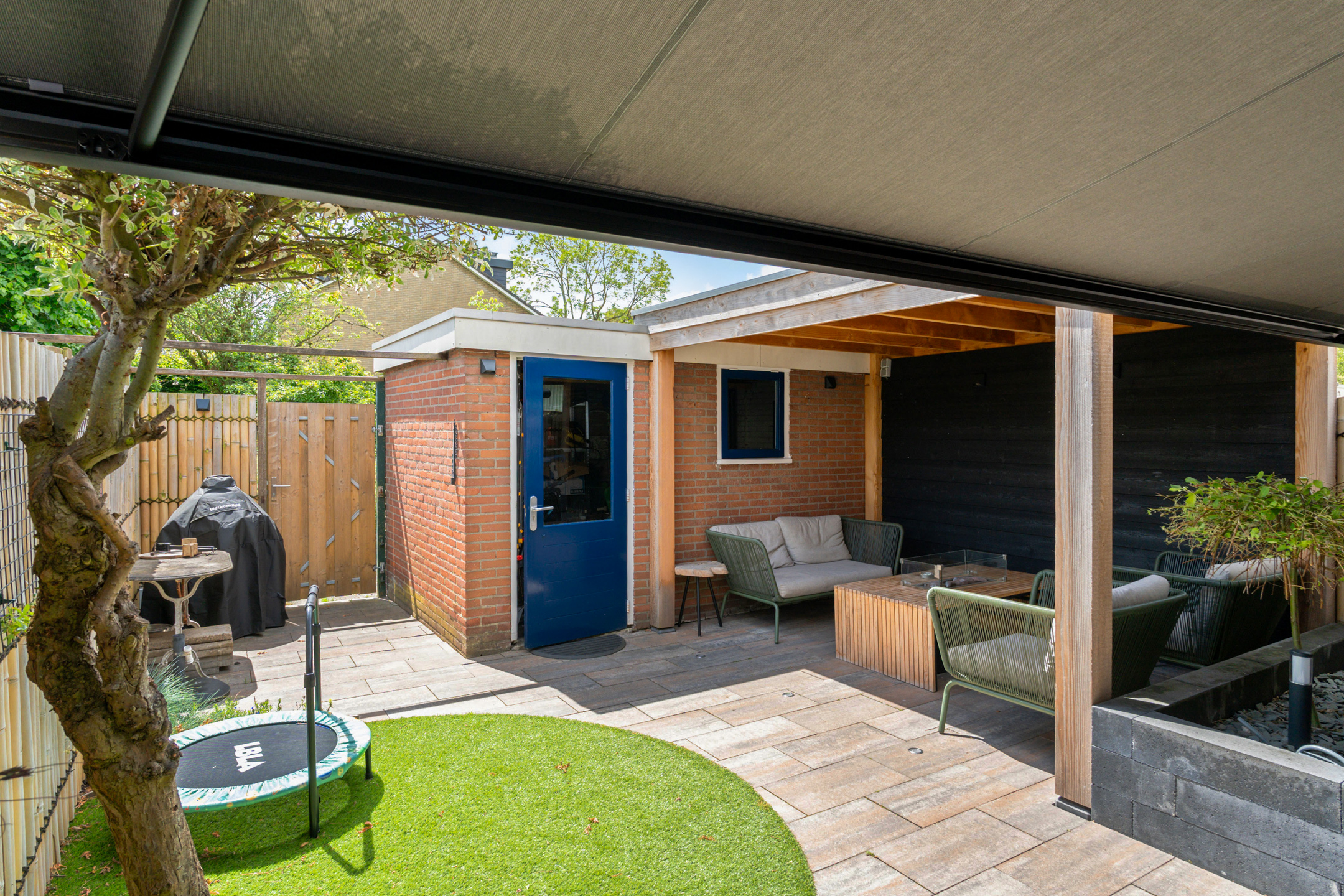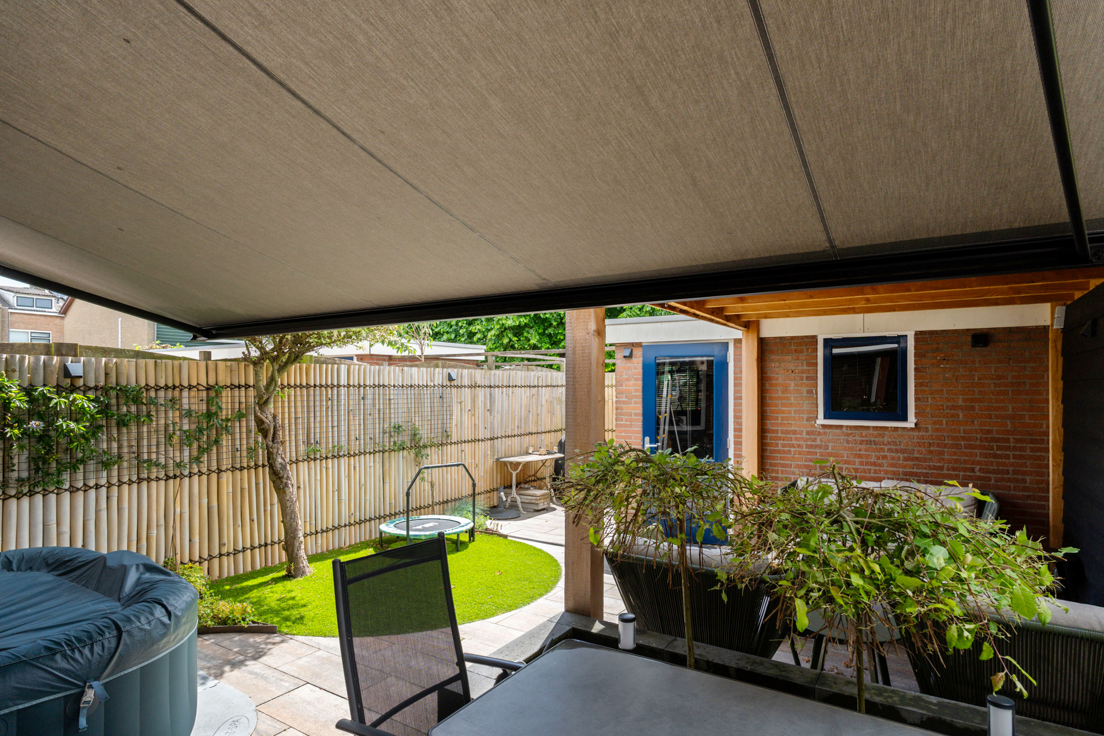 Via de keuken loop je zo de achtertuin in: modern aangelegd met kunstgras, nette bestrating, grondspots en een gezellige overkapping voor lange avonden. De ligging op het zuiden betekent volop zon — het elektrisch zonnescherm zorgt op warme dagen voor welkome schaduw.
