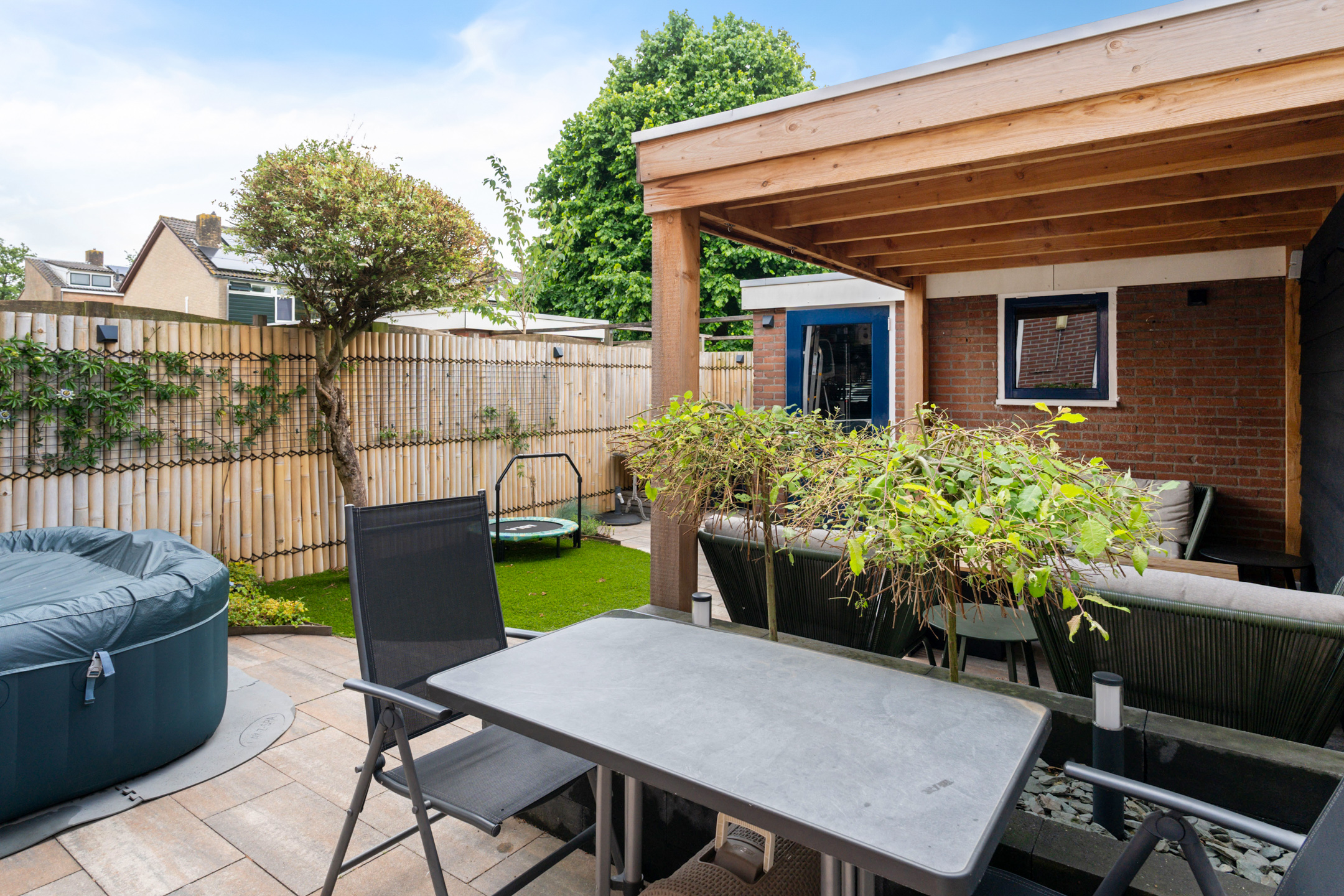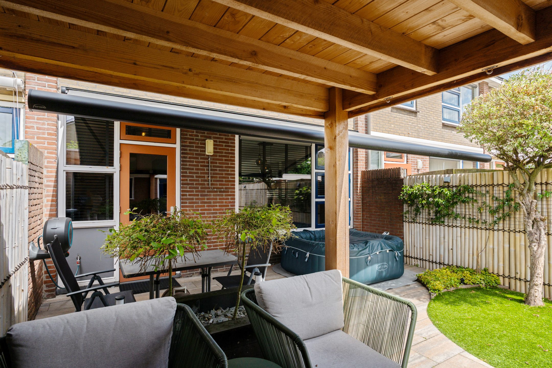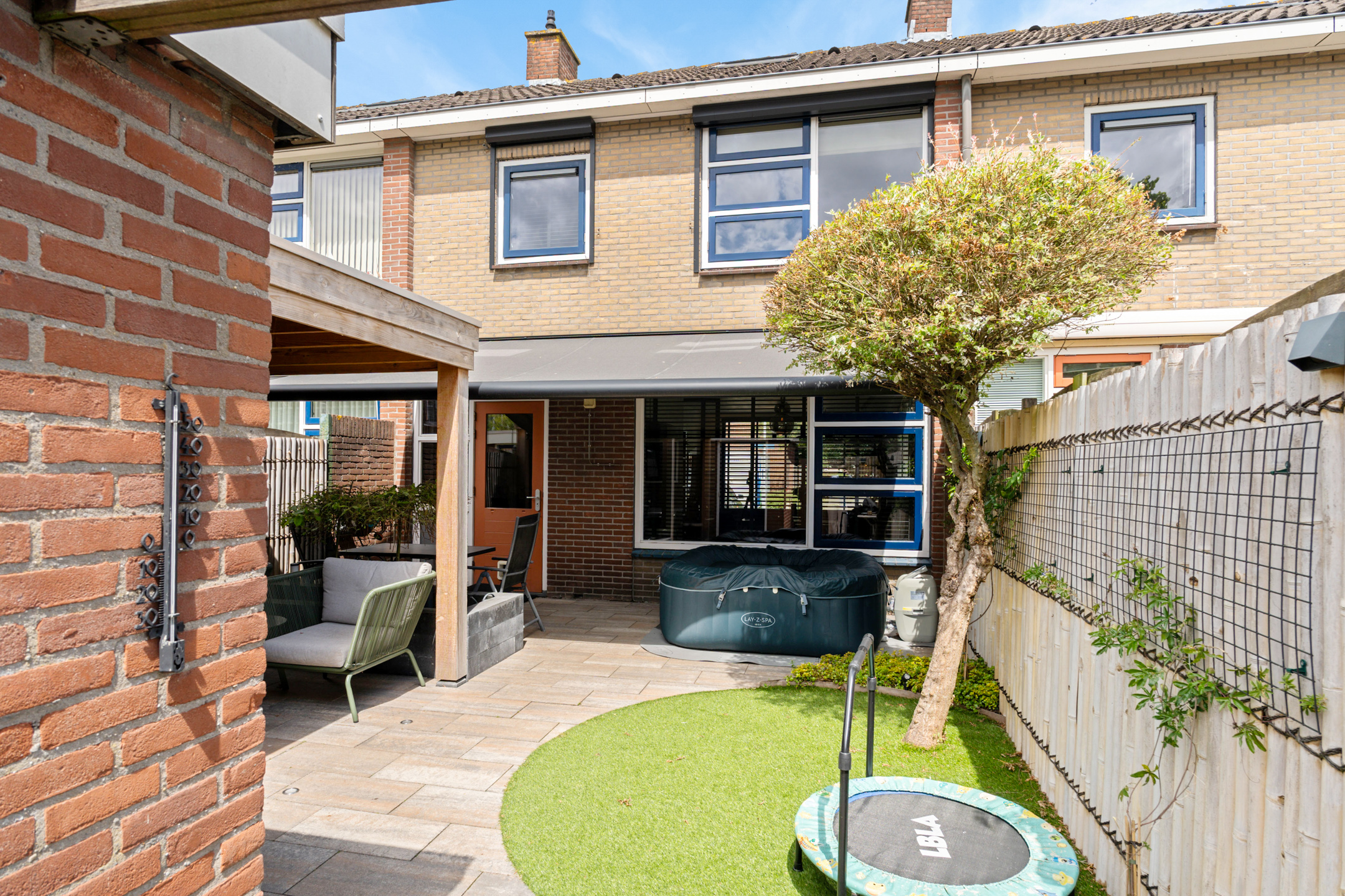 Via de keuken loop je zo de achtertuin in: modern aangelegd met kunstgras, nette bestrating, grondspots en een gezellige overkapping voor lange avonden. De ligging op het zuiden betekent volop zon — het elektrisch zonnescherm zorgt op warme dagen voor welkome schaduw.