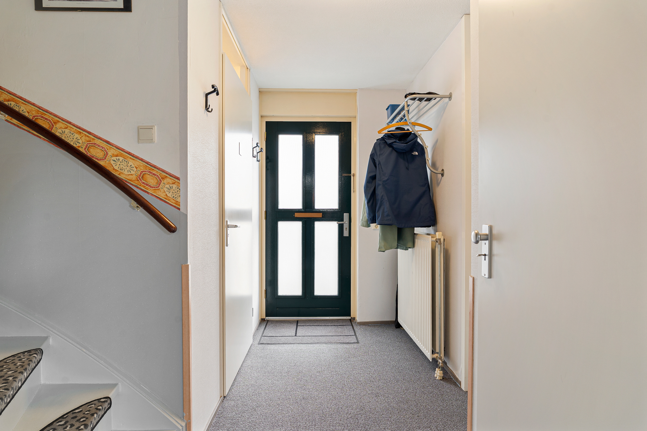 Je betreedt de woning via de ruime hal, met rechts een toilet en de trapopgang naar de eerste verdieping. Vanuit de hal loop je door naar de lichte en ruime woonkamer, waar de grote raampartijen zorgen voor een prettige lichtinval. De schuifpui biedt direct toegang tot de diepe, fraai aangelegde achtertuin op het westen.