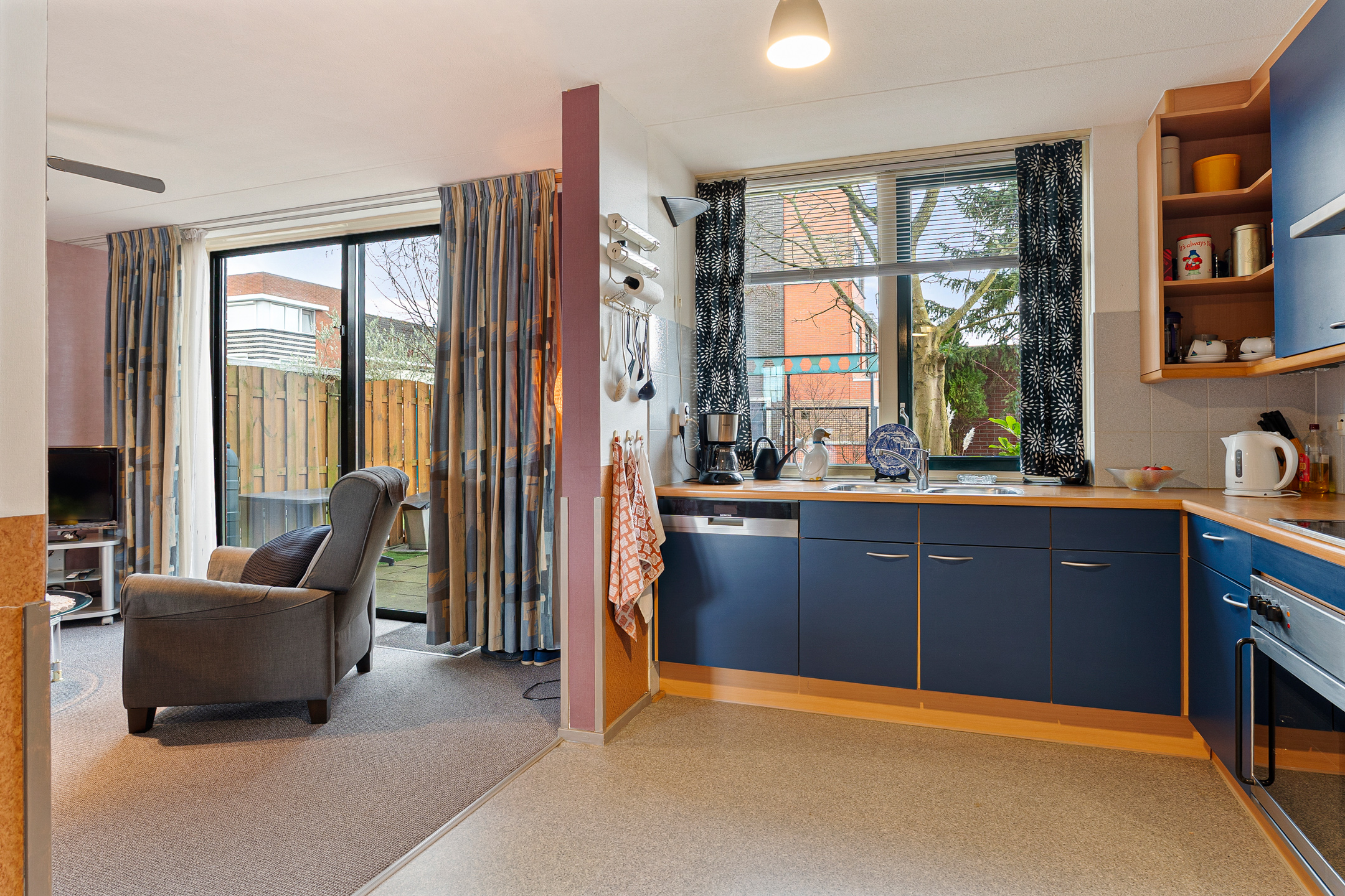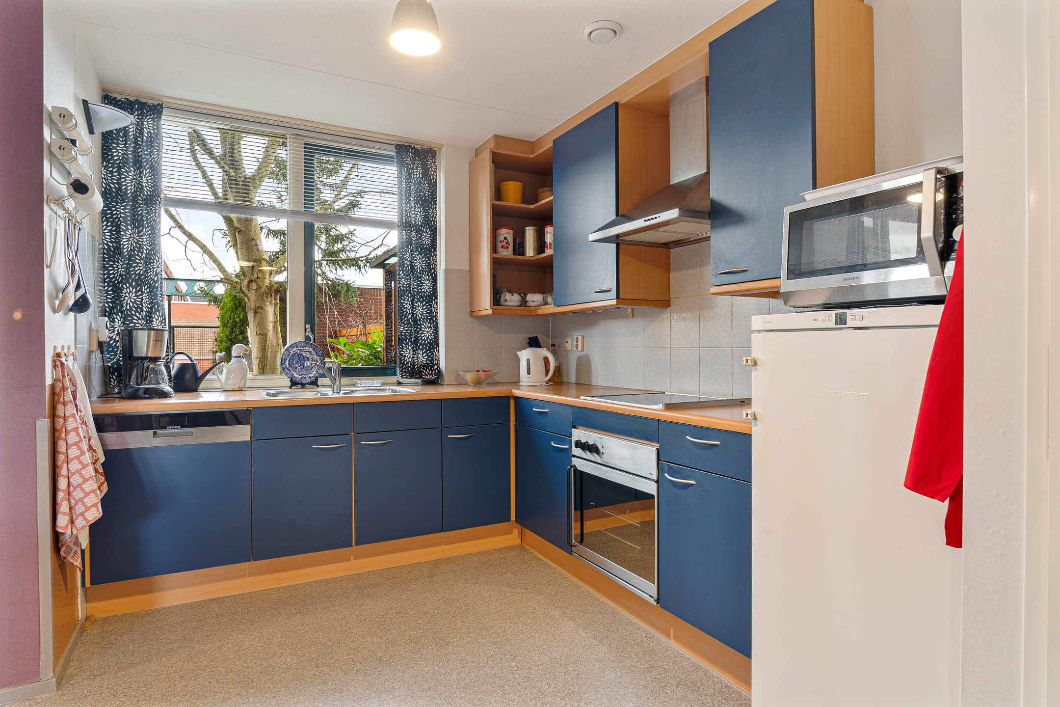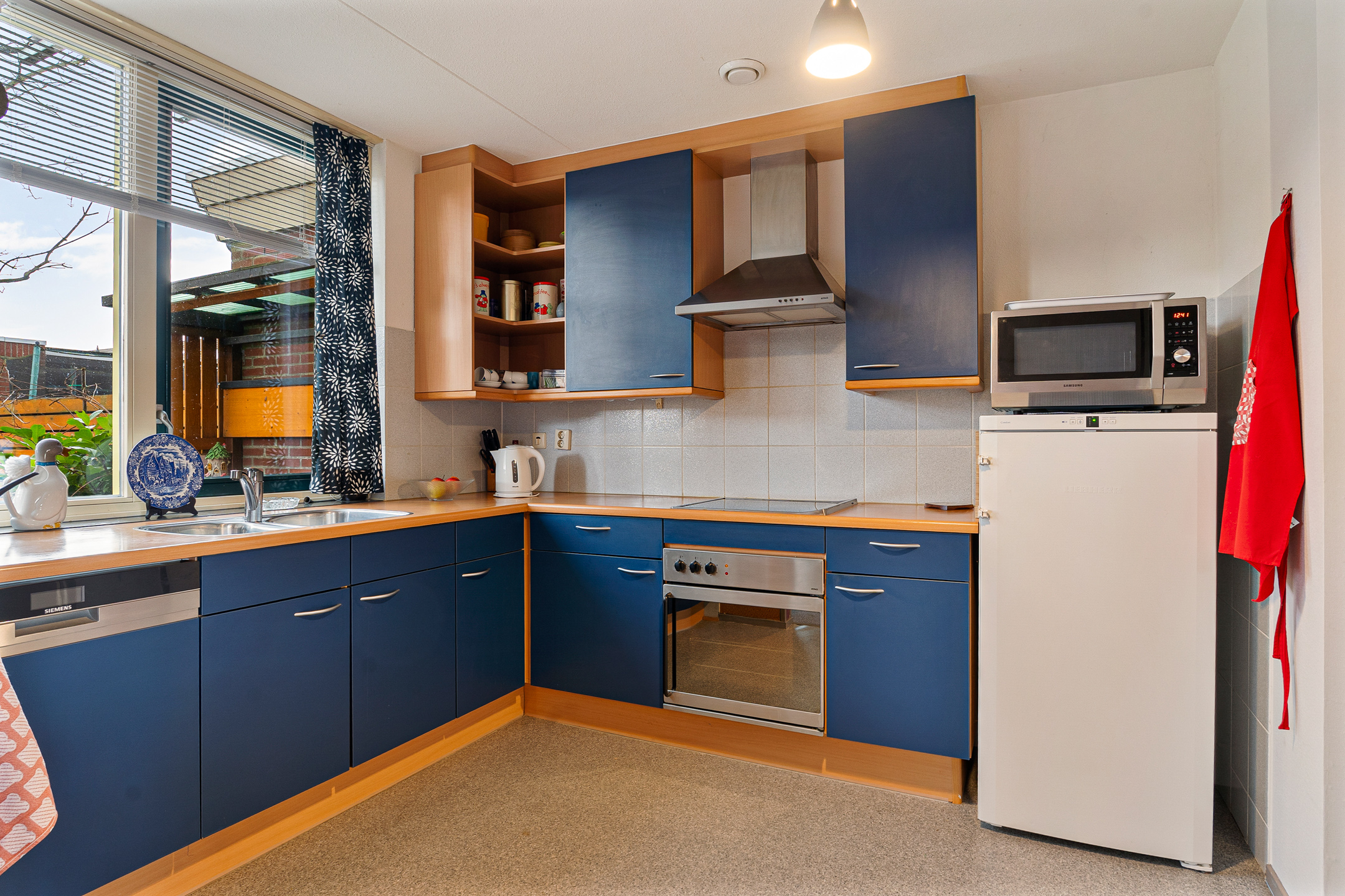 De open keuken aan de achterzijde van de woning is voorzien van diverse inbouwapparatuur, waaronder een ATAG kookplaat, oven, vaatwasser, dubbele spoelbak en voldoende kastruimte. Extra handig is de ruime trapkast naast de keuken, perfect voor extra bergruimte. Vanuit de keuken is er opnieuw toegang tot de hal.