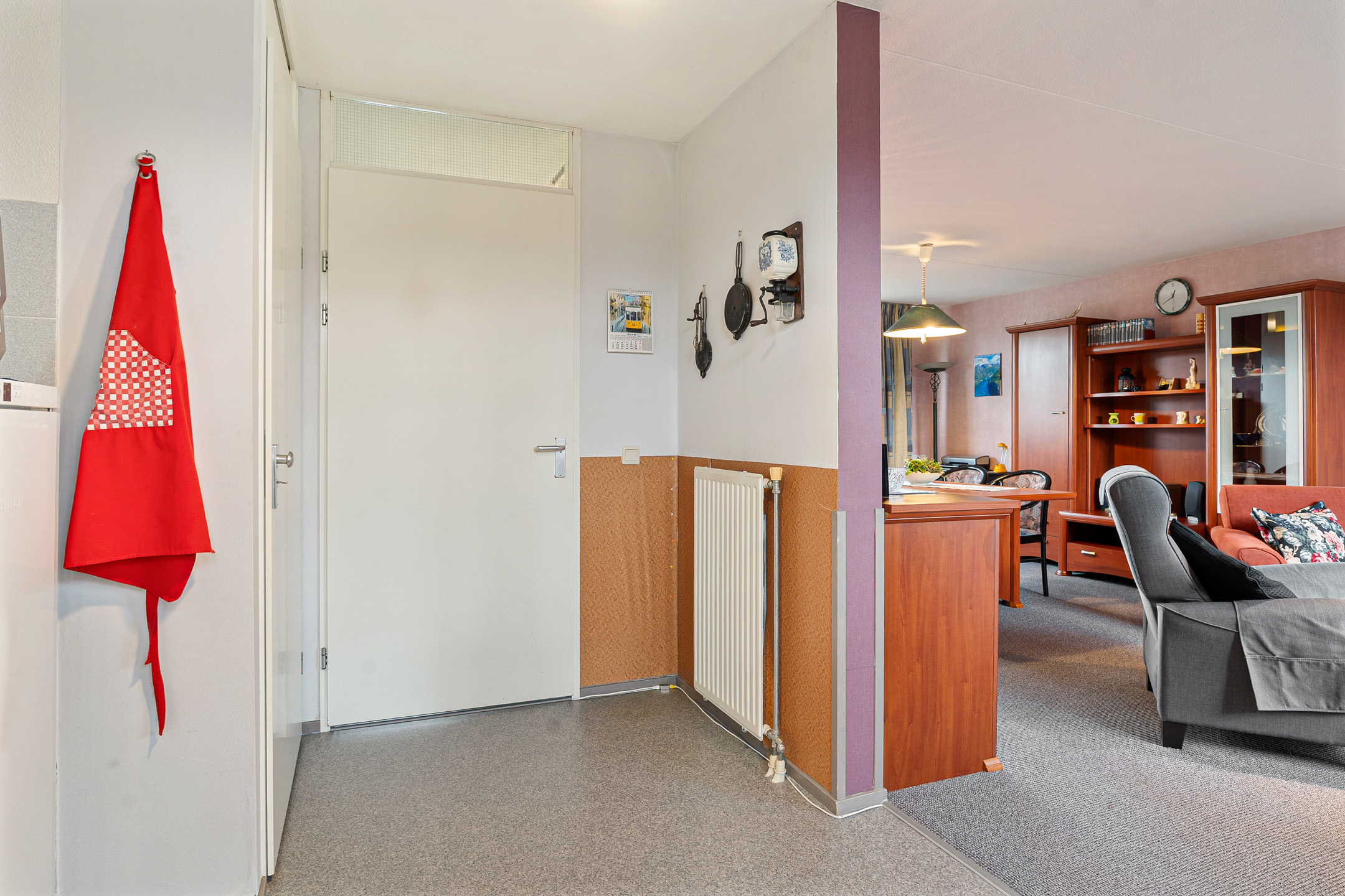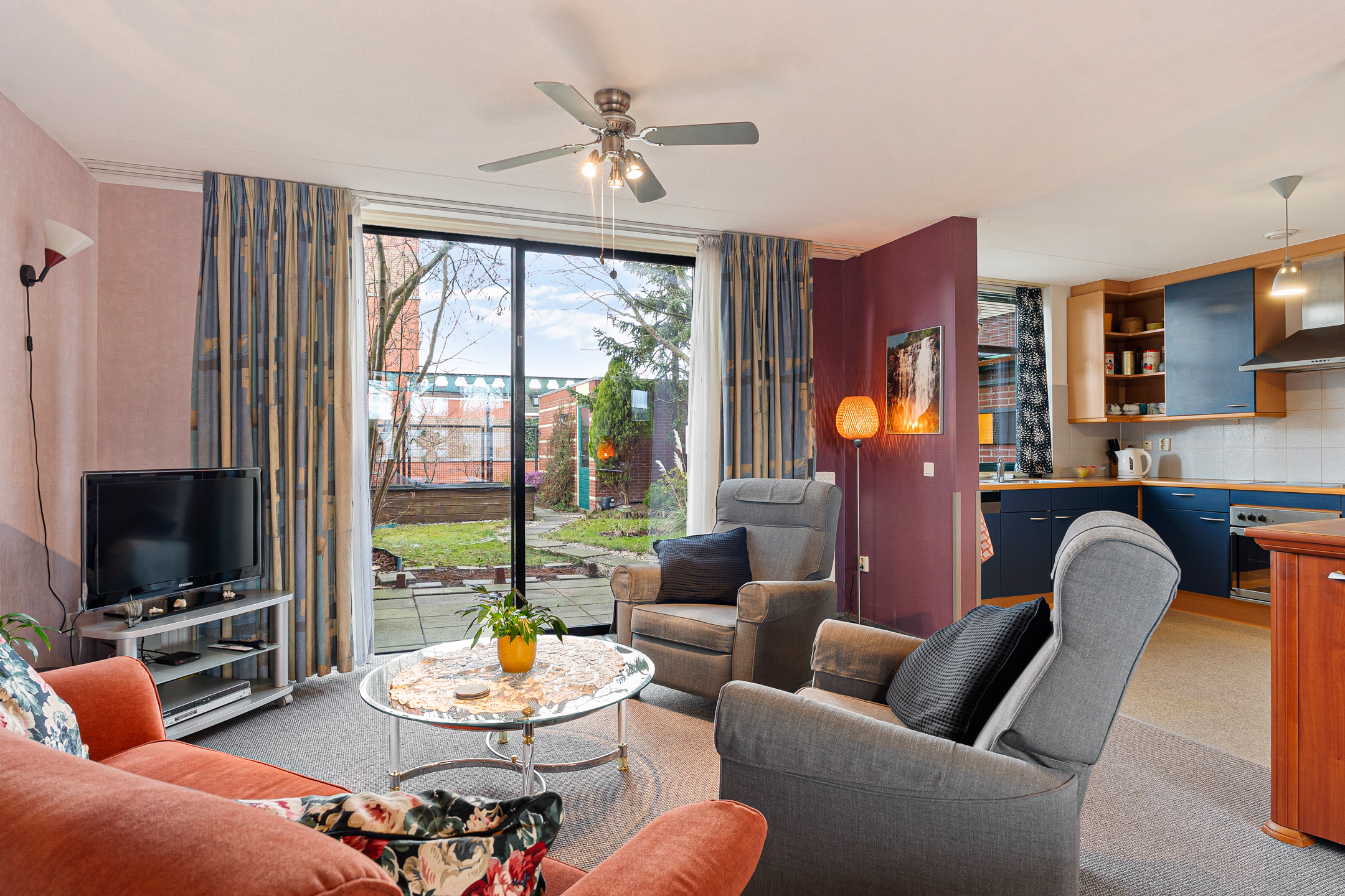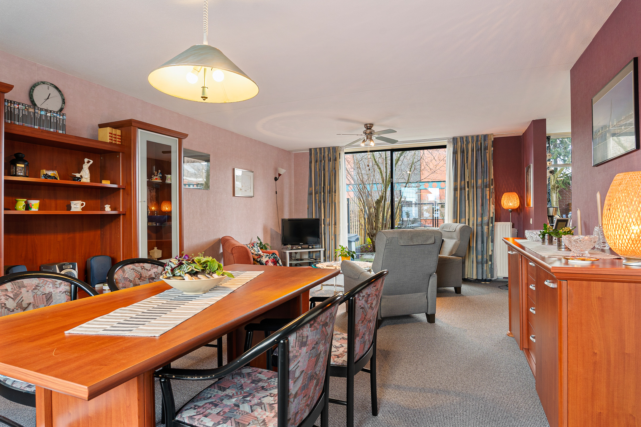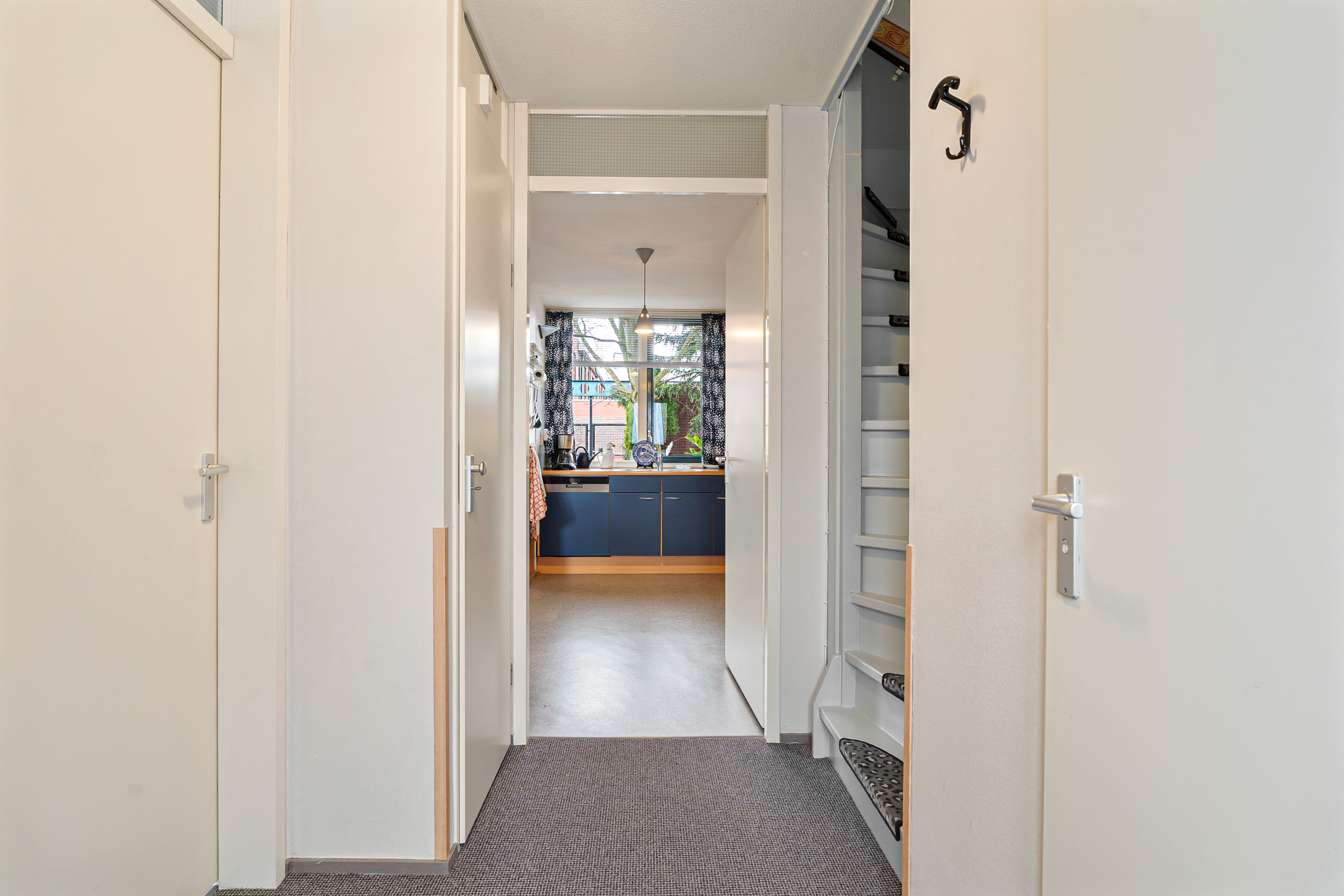 De open keuken aan de achterzijde van de woning is voorzien van diverse inbouwapparatuur, waaronder een ATAG kookplaat, oven, vaatwasser, dubbele spoelbak en voldoende kastruimte. Extra handig is de ruime trapkast naast de keuken, perfect voor extra bergruimte. Vanuit de keuken is er opnieuw toegang tot de hal.