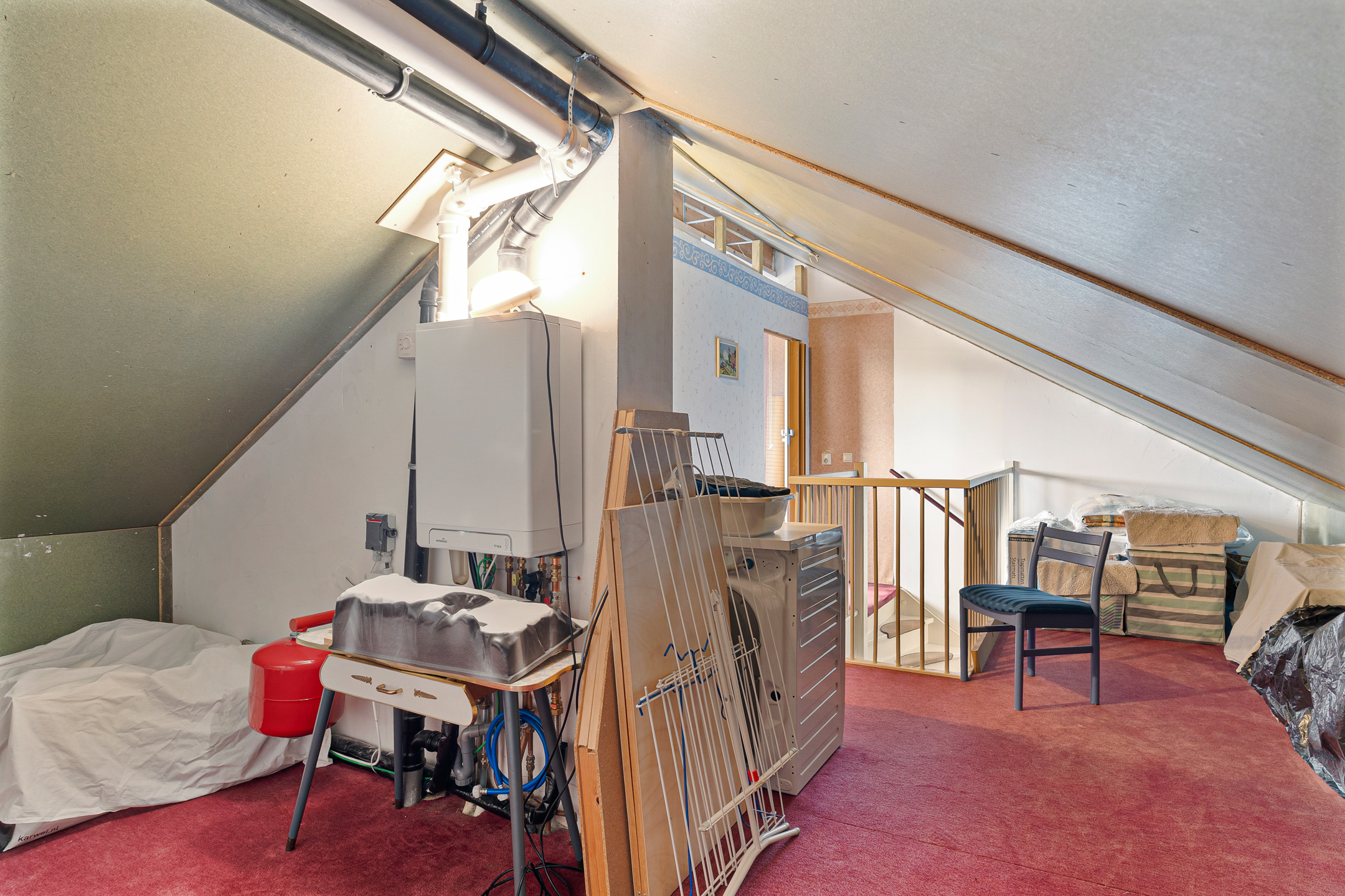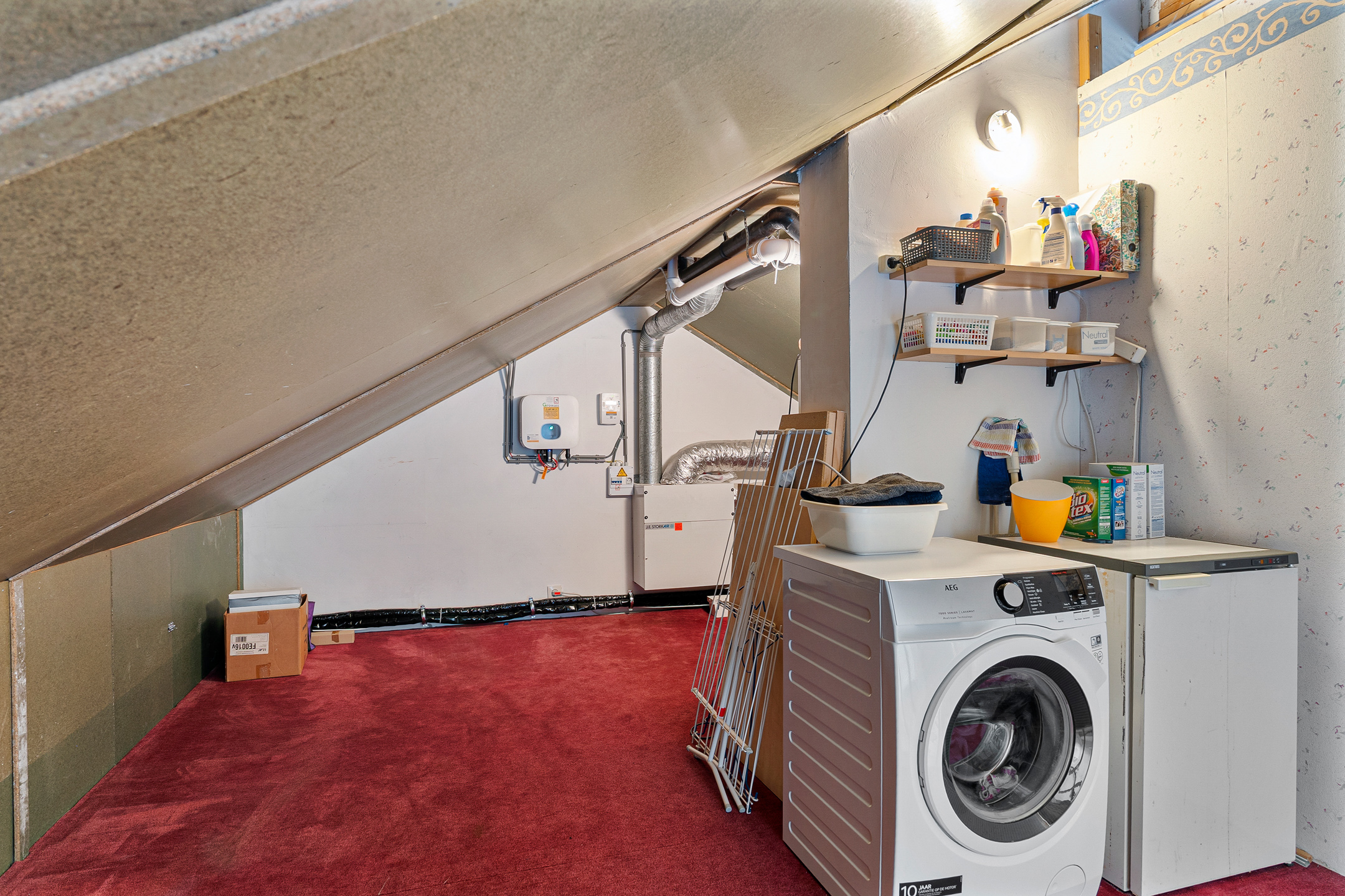 De zolderverdieping biedt veel extra ruimte. Aan de voorzijde is er een vierde, ruime slaapkamer. Daarnaast is er op de overloop plek voor de wasmachine en droger en zijn er voldoende mogelijkheden voor extra opslag.