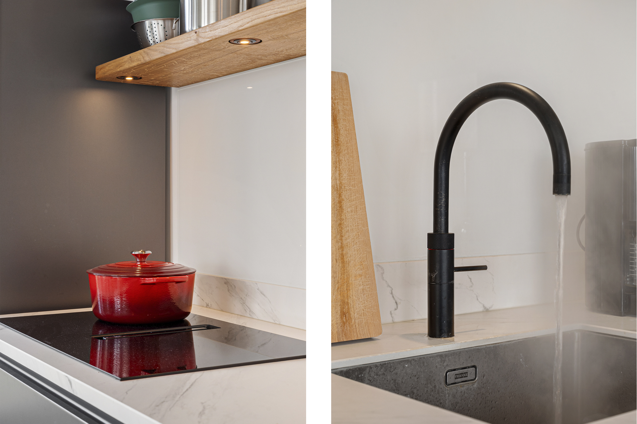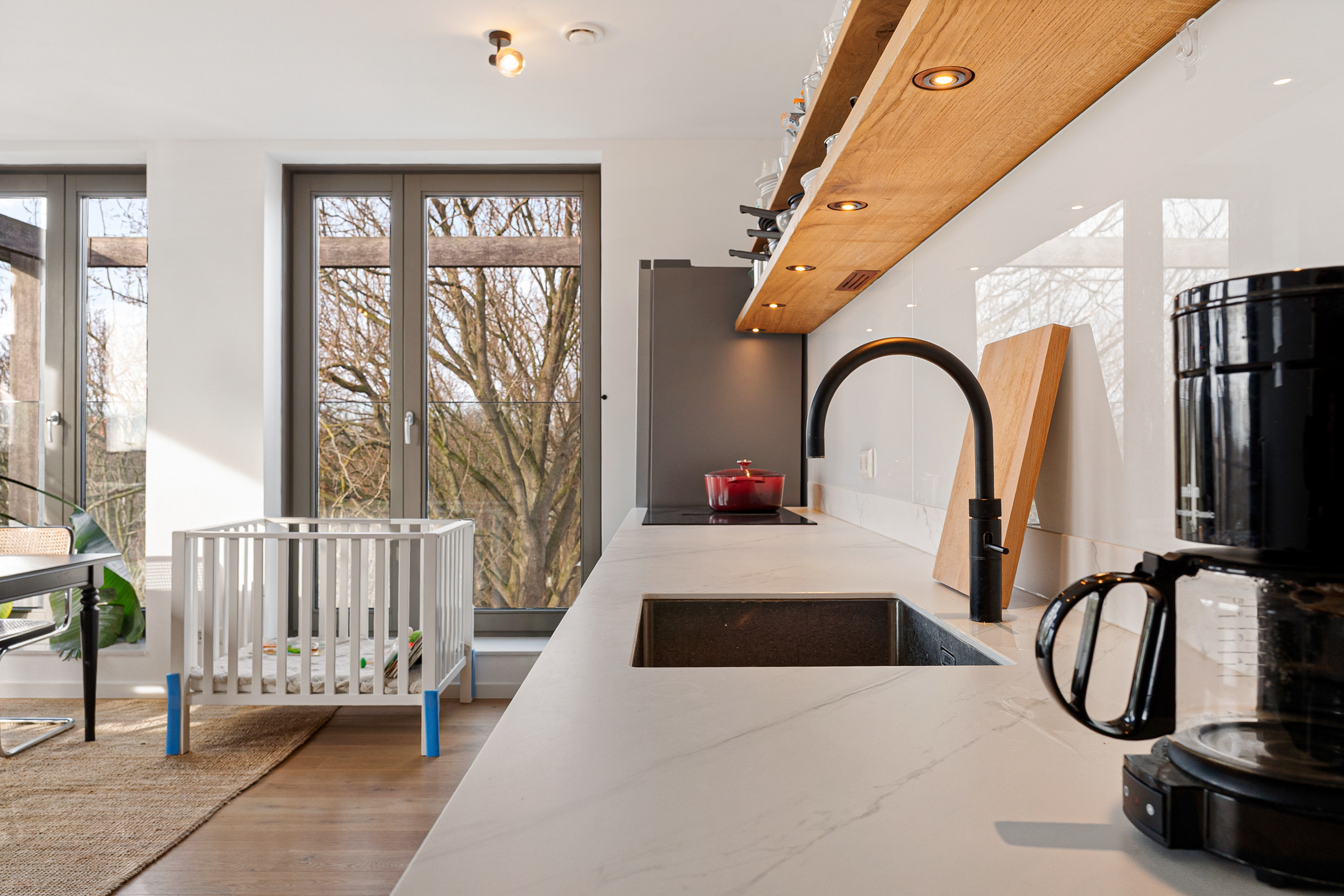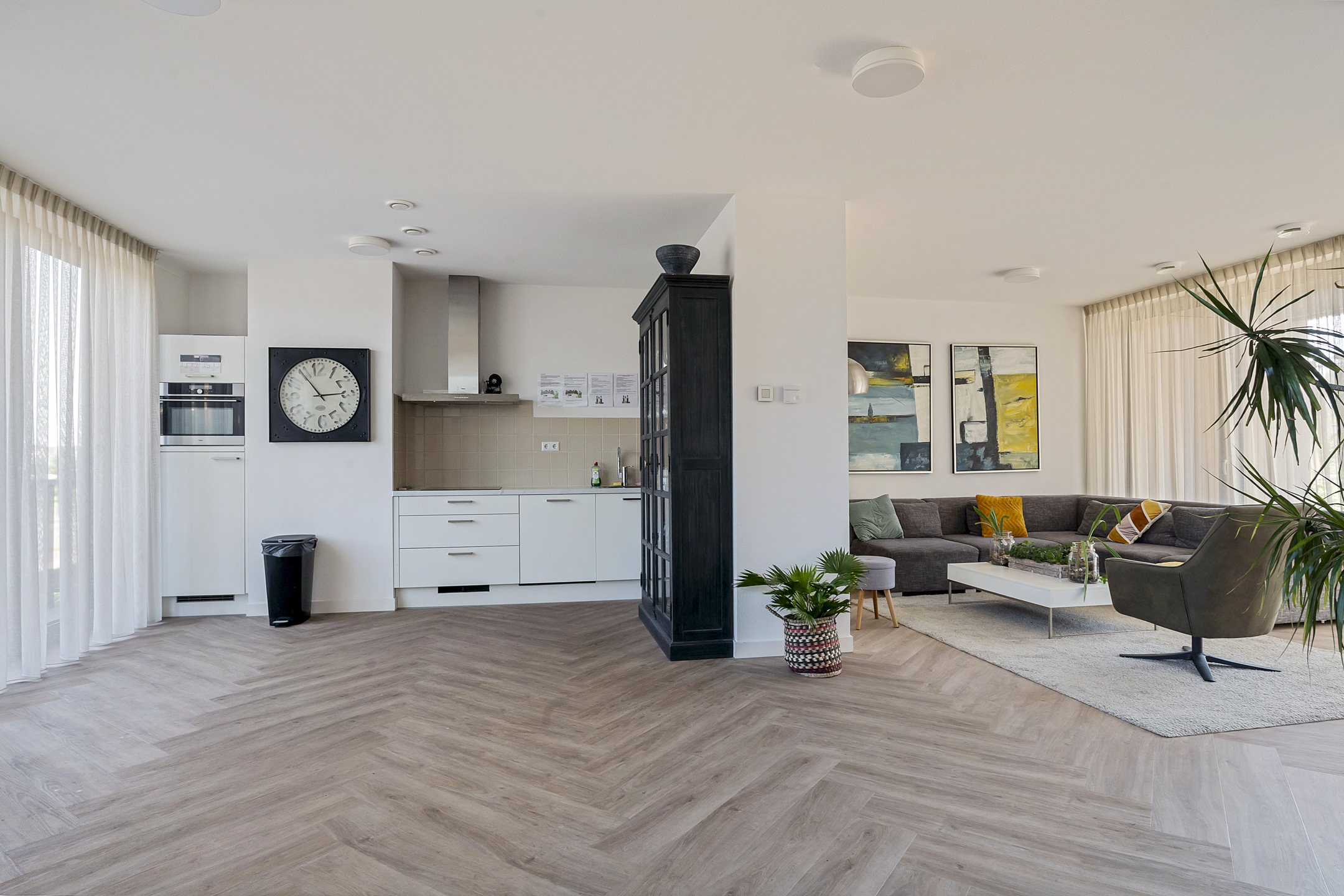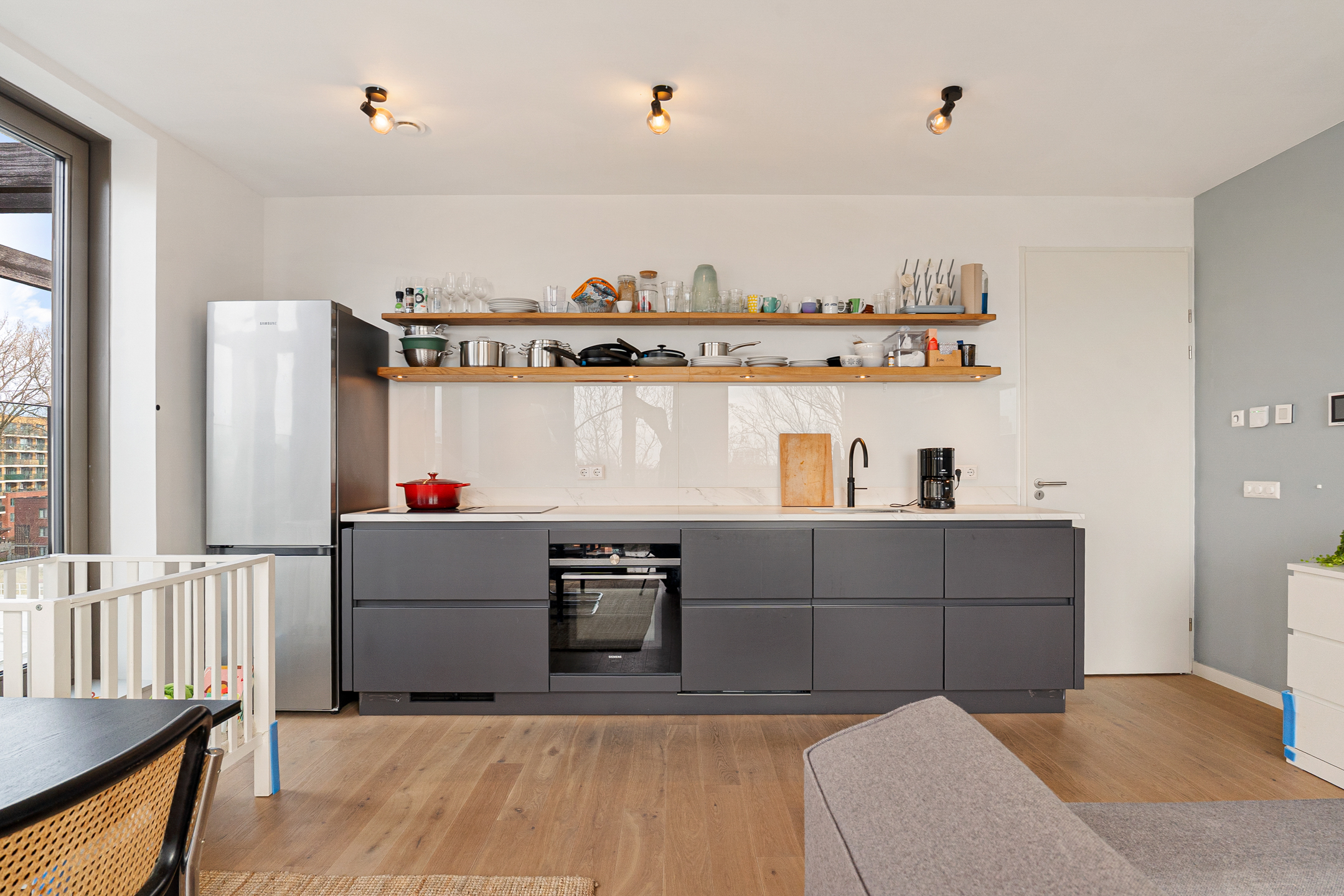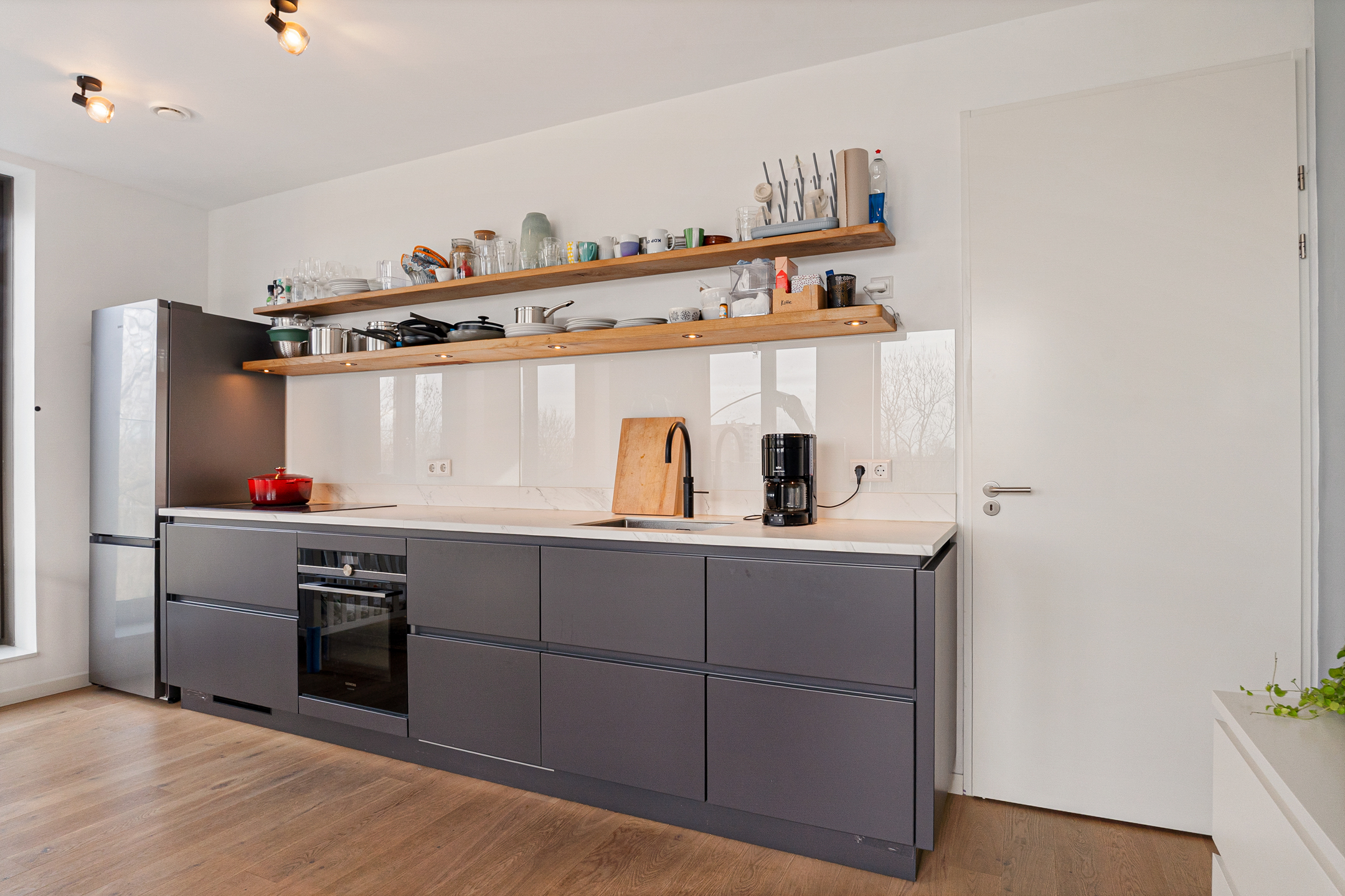 De open keuken is praktisch ingedeeld en uitgerust met hoogwaardige Siemens inbouwapparatuur, waaronder een inductiekookplaat met geïntegreerde afzuiging, combi-oven en vaatwasser. Daarnaast beschikt de keuken over een Quooker en een losse koelkast.