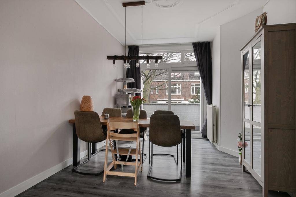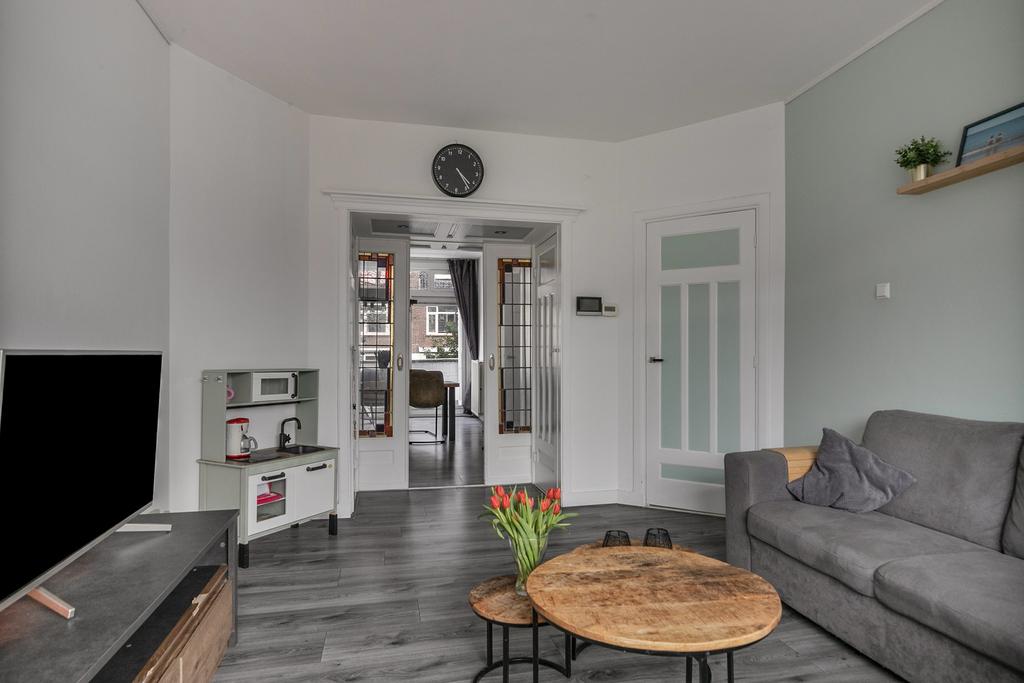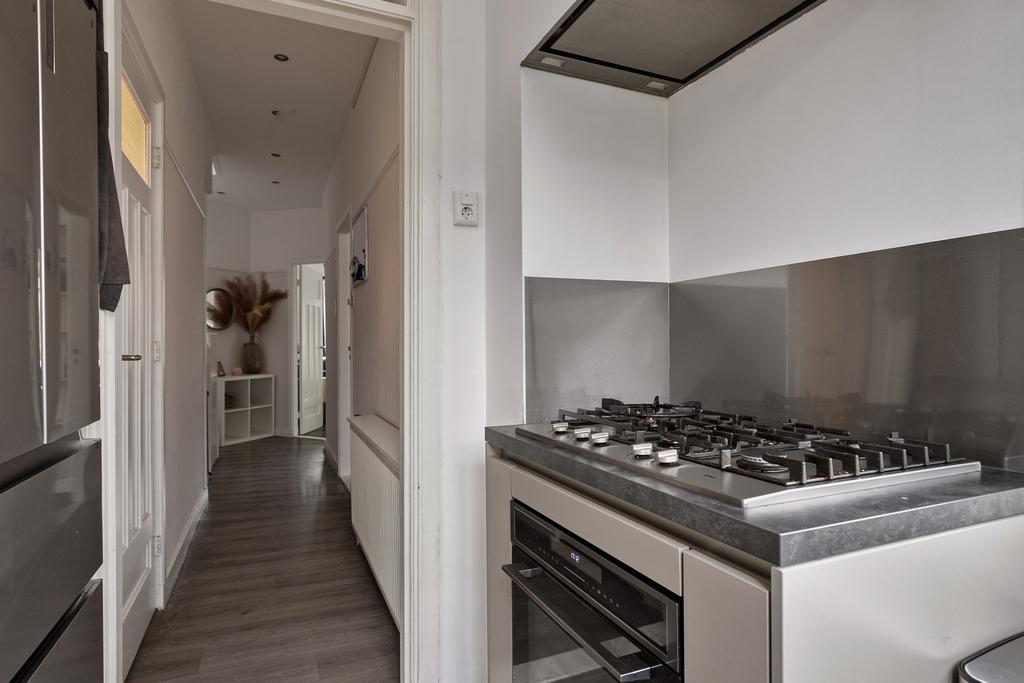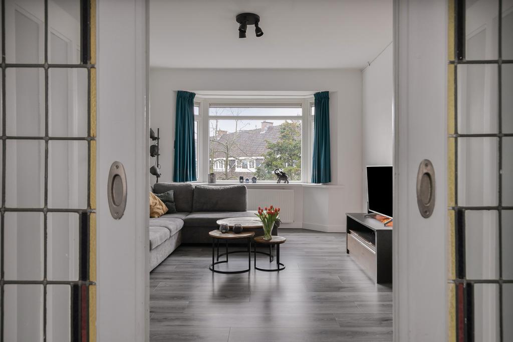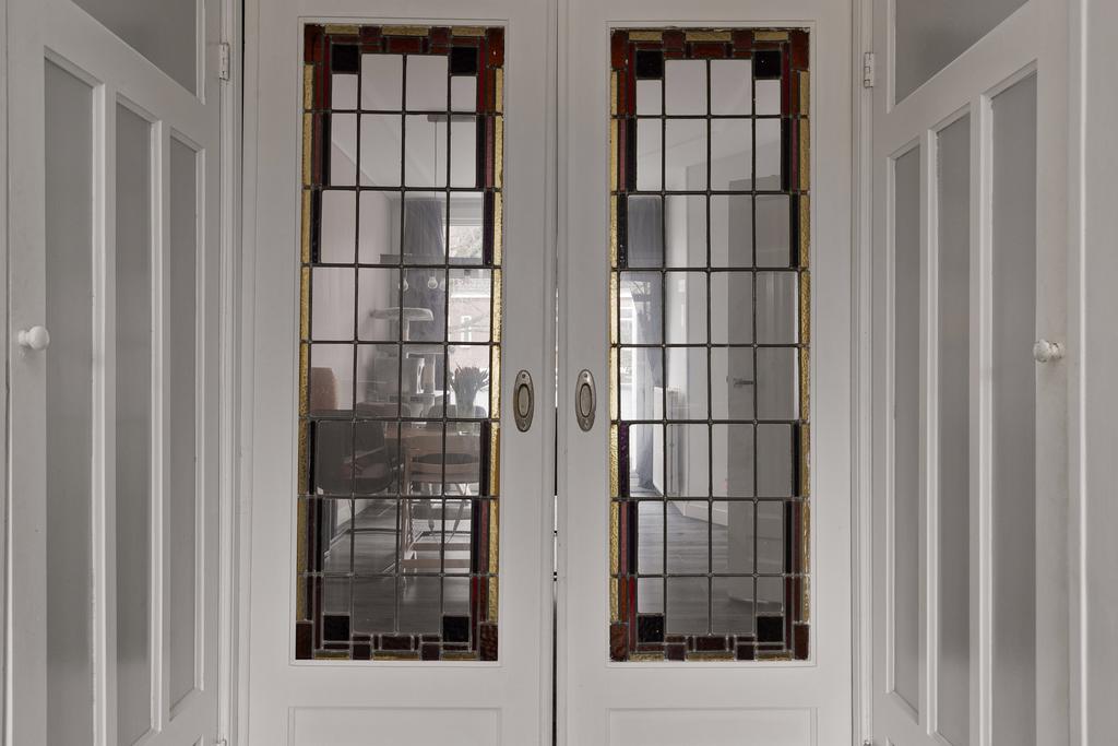 Achter de voordeur is een kleine entreehal met trapopgang naar de woonverdieping. De ruime en lichte woonkamer ligt aan de voorzijde van de woning. De woonkamer en de eetkamer zijn gescheiden middels een kamer en suite. De kamer en suite is nog voorzien van de originele authentieke glas-in-loodschuifdeuren. De eetkamer heeft veel lichtinval en biedt middels een schuifpui toegang tot het balkon. Vanuit de hal is er toegang tot de gesloten keuken en een separaat toilet. De keuken is strak afgewerkt en voorzien van de benodigde inbouwapparatuur.