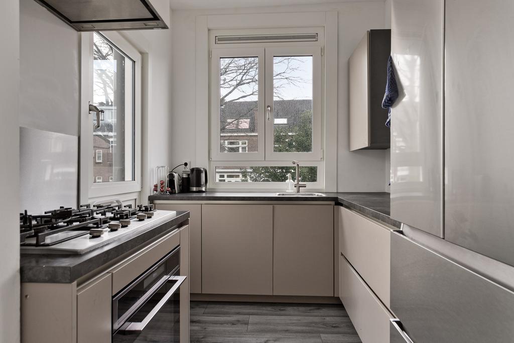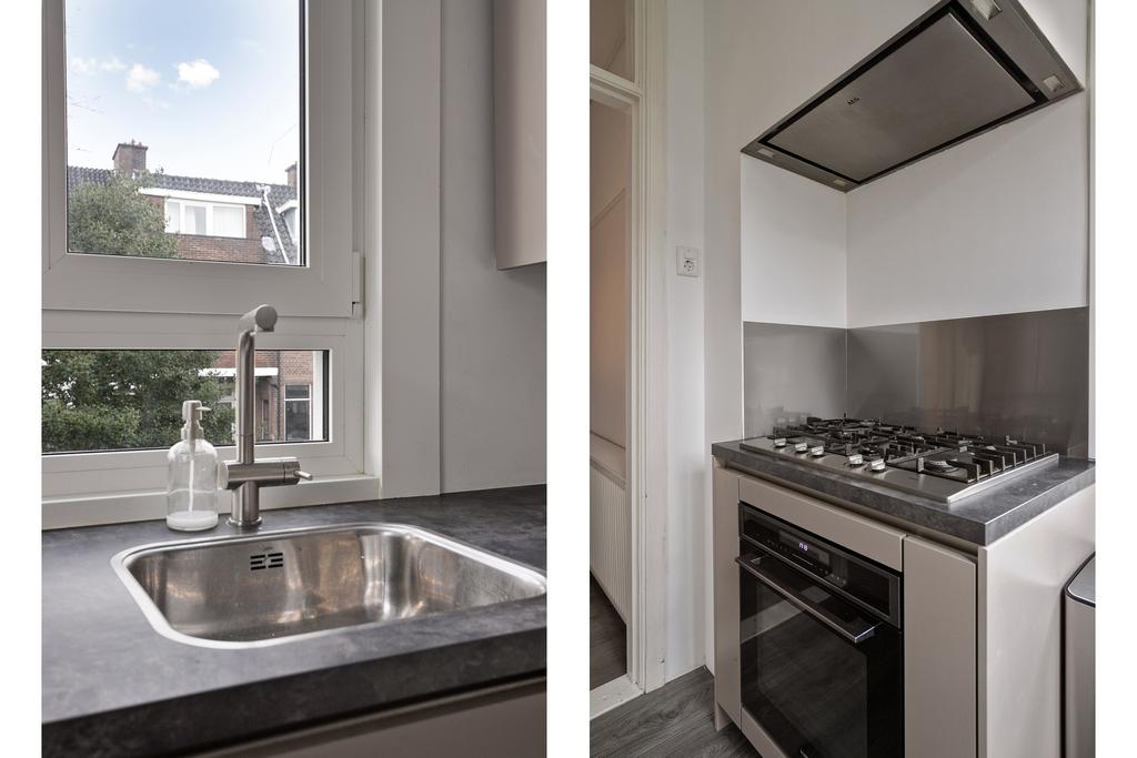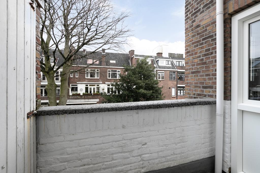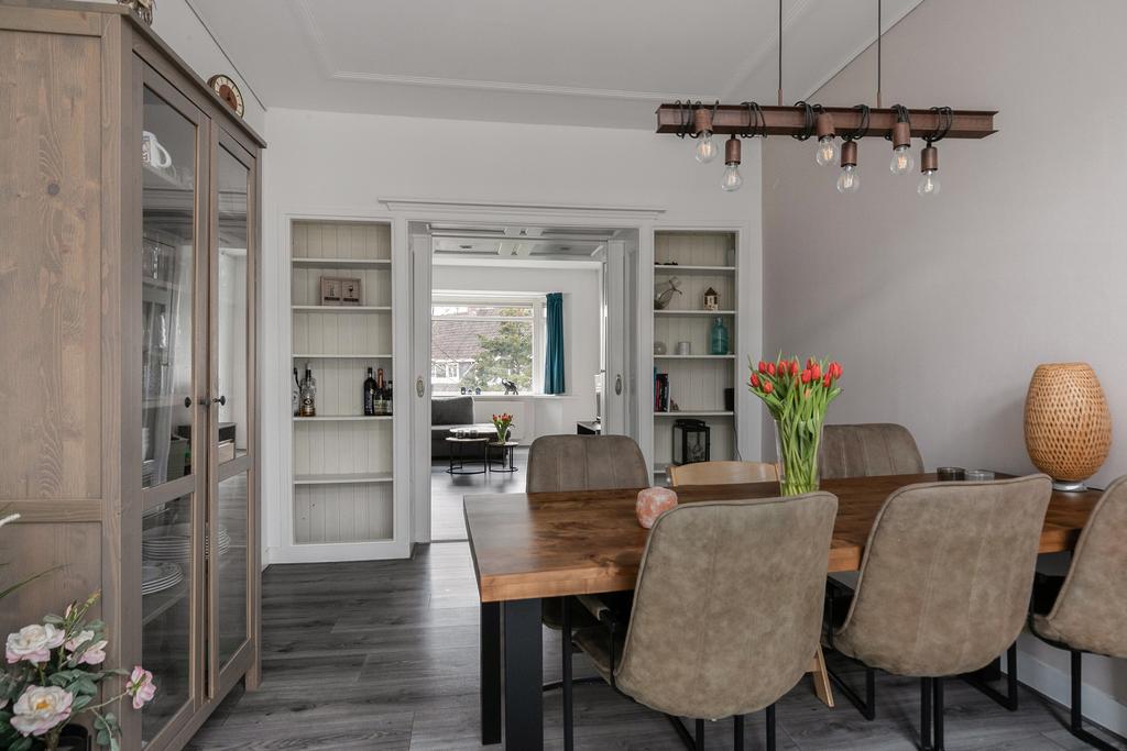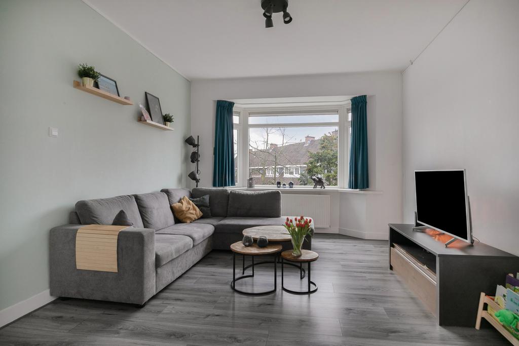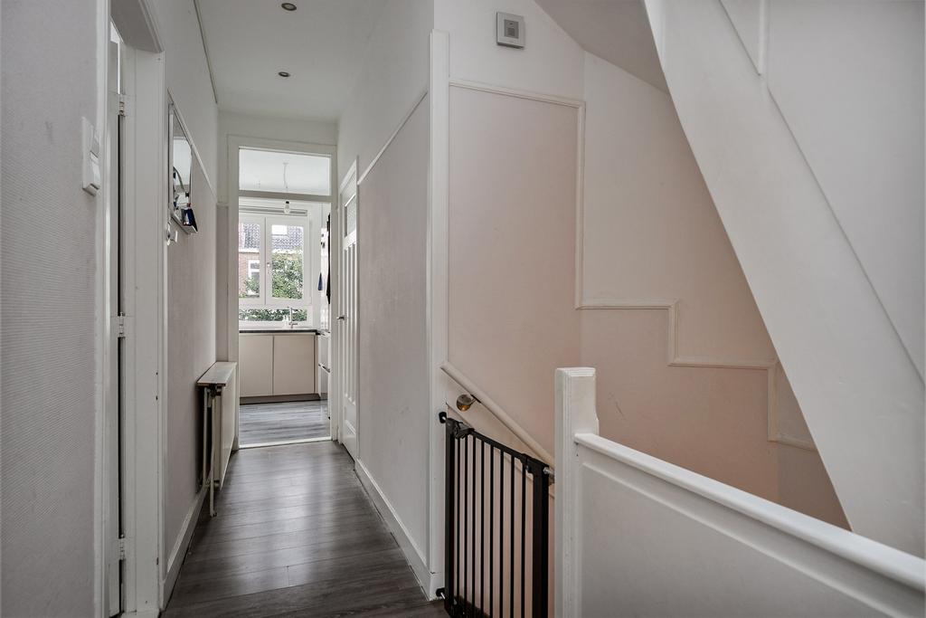 Achter de voordeur is een kleine entreehal met trapopgang naar de woonverdieping. De ruime en lichte woonkamer ligt aan de voorzijde van de woning. De woonkamer en de eetkamer zijn gescheiden middels een kamer en suite. De kamer en suite is nog voorzien van de originele authentieke glas-in-loodschuifdeuren. De eetkamer heeft veel lichtinval en biedt middels een schuifpui toegang tot het balkon. Vanuit de hal is er toegang tot de gesloten keuken en een separaat toilet. De keuken is strak afgewerkt en voorzien van de benodigde inbouwapparatuur.