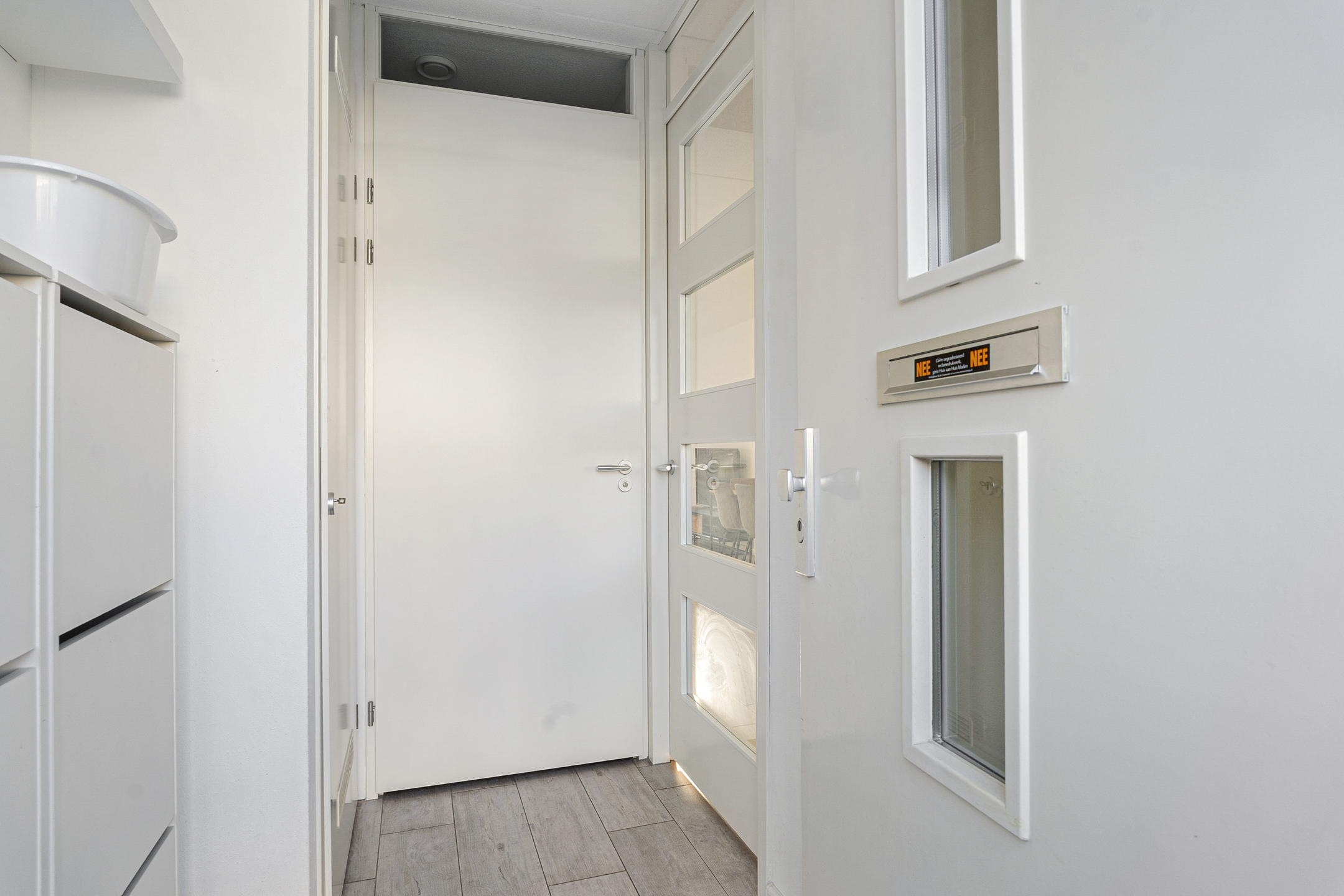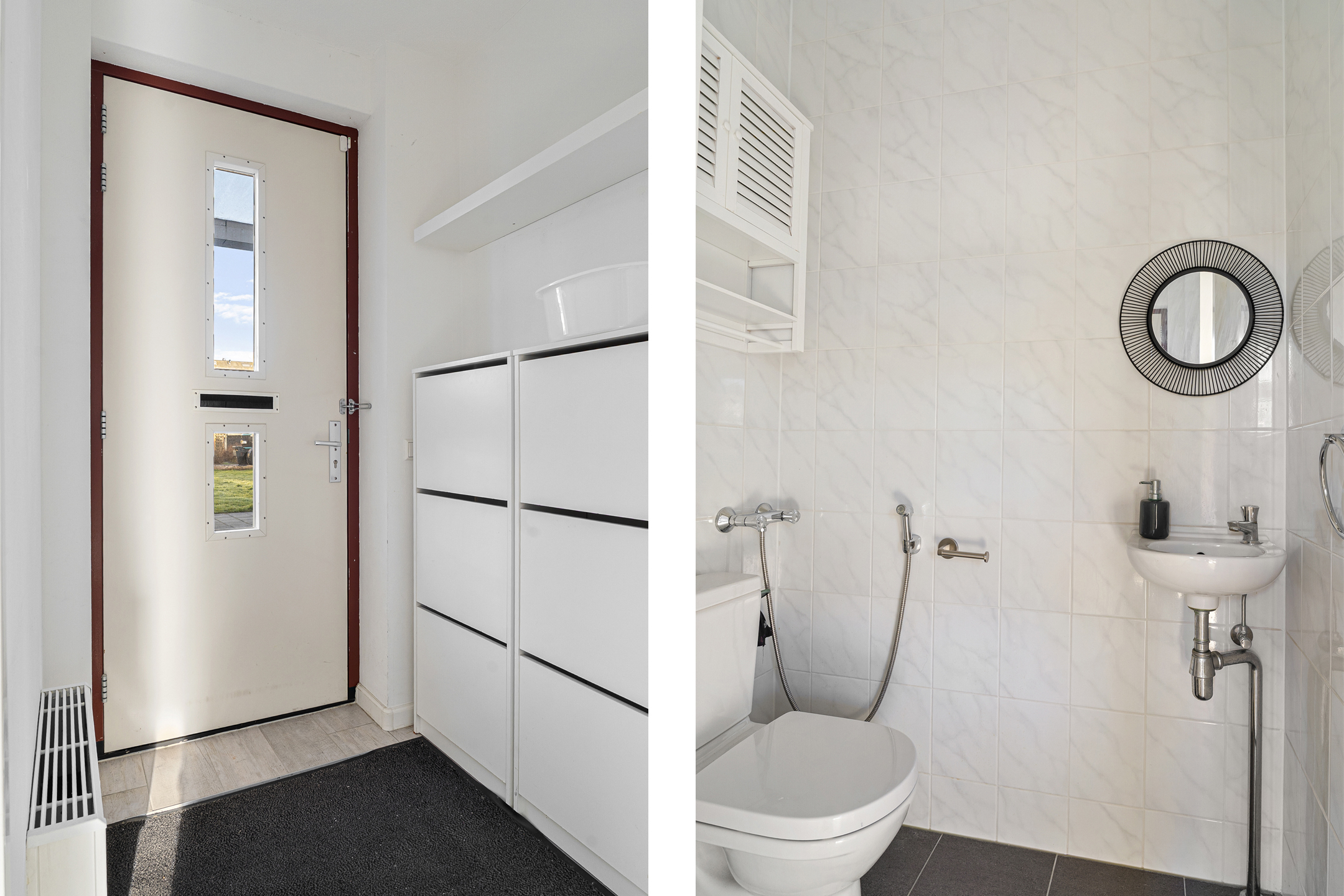 Via de overdekte entree stap je binnen in de hal met garderoberuimte, meterkast en een modern toilet met fontein en opbergmeubel. De ruime woonkamer is heerlijk licht dankzij de grote raampartij aan de achterzijde en biedt een fijn uitzicht op de tuin. De houtlook tegelvloer met vloerverwarming zorgt voor een warme en sfeervolle uitstraling.