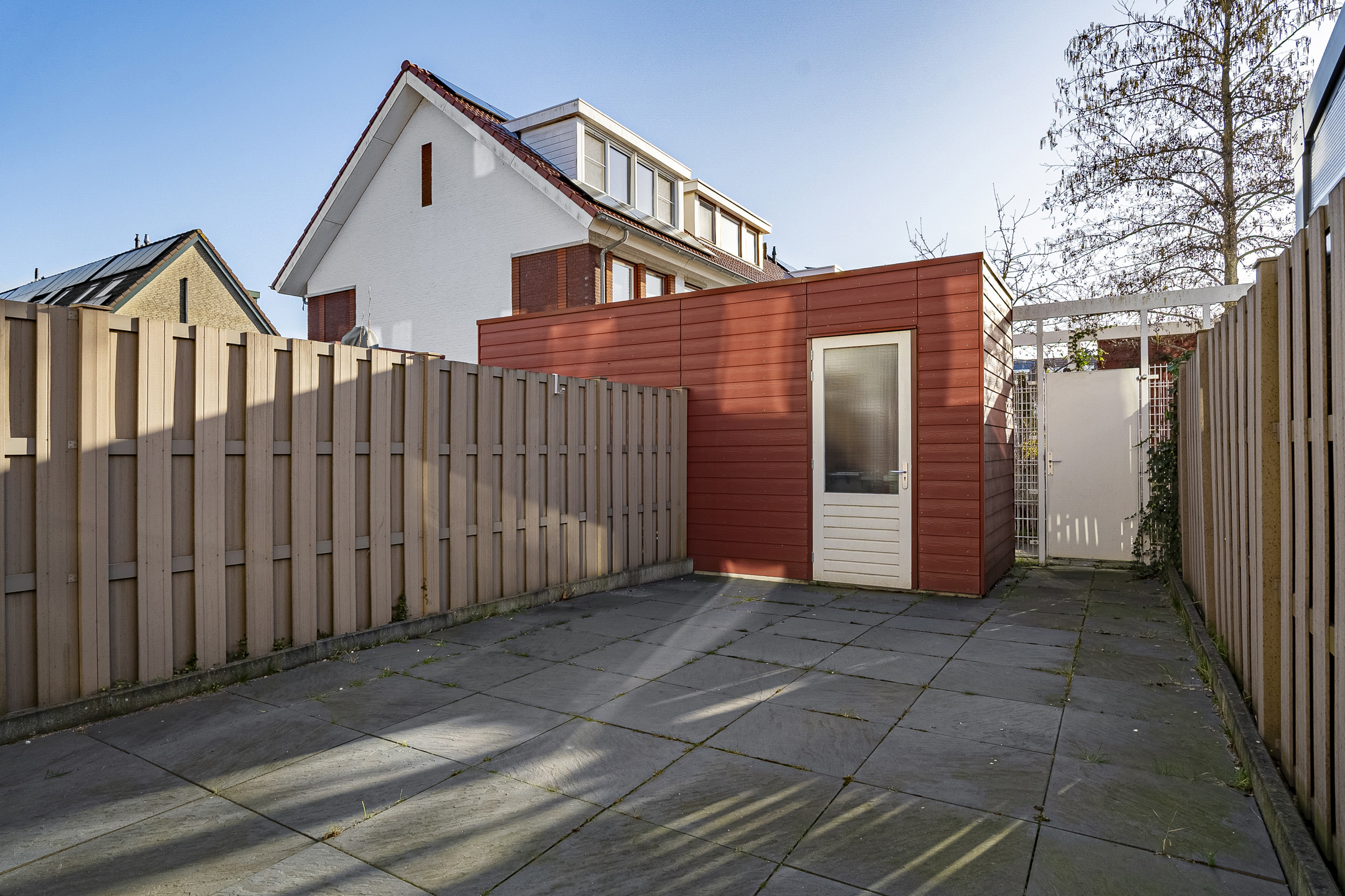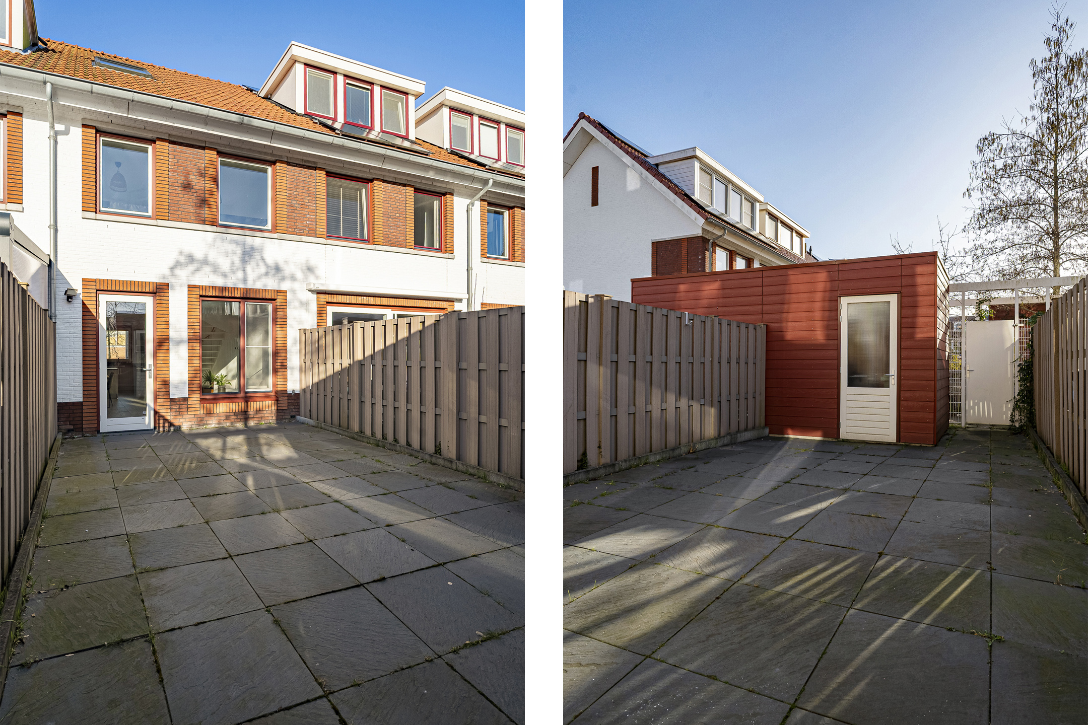 De onderhoudsarme achtertuin is fraai aangelegd met hoogwaardige keramische tegels die antislip zijn en niet verkleuren. De berging en schutting van duurzaam composiet geven de tuin een strakke en moderne uitstraling.
