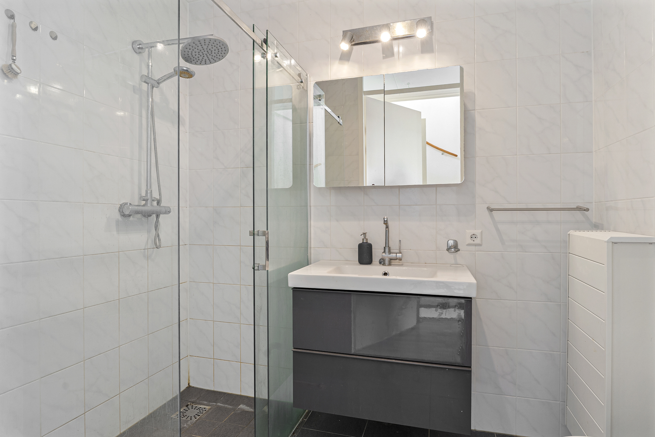 De moderne badkamer is strak afgewerkt en beschikt over een inloopdouche, wandcloset en een stijlvol wastafelmeubel met spiegelkast.