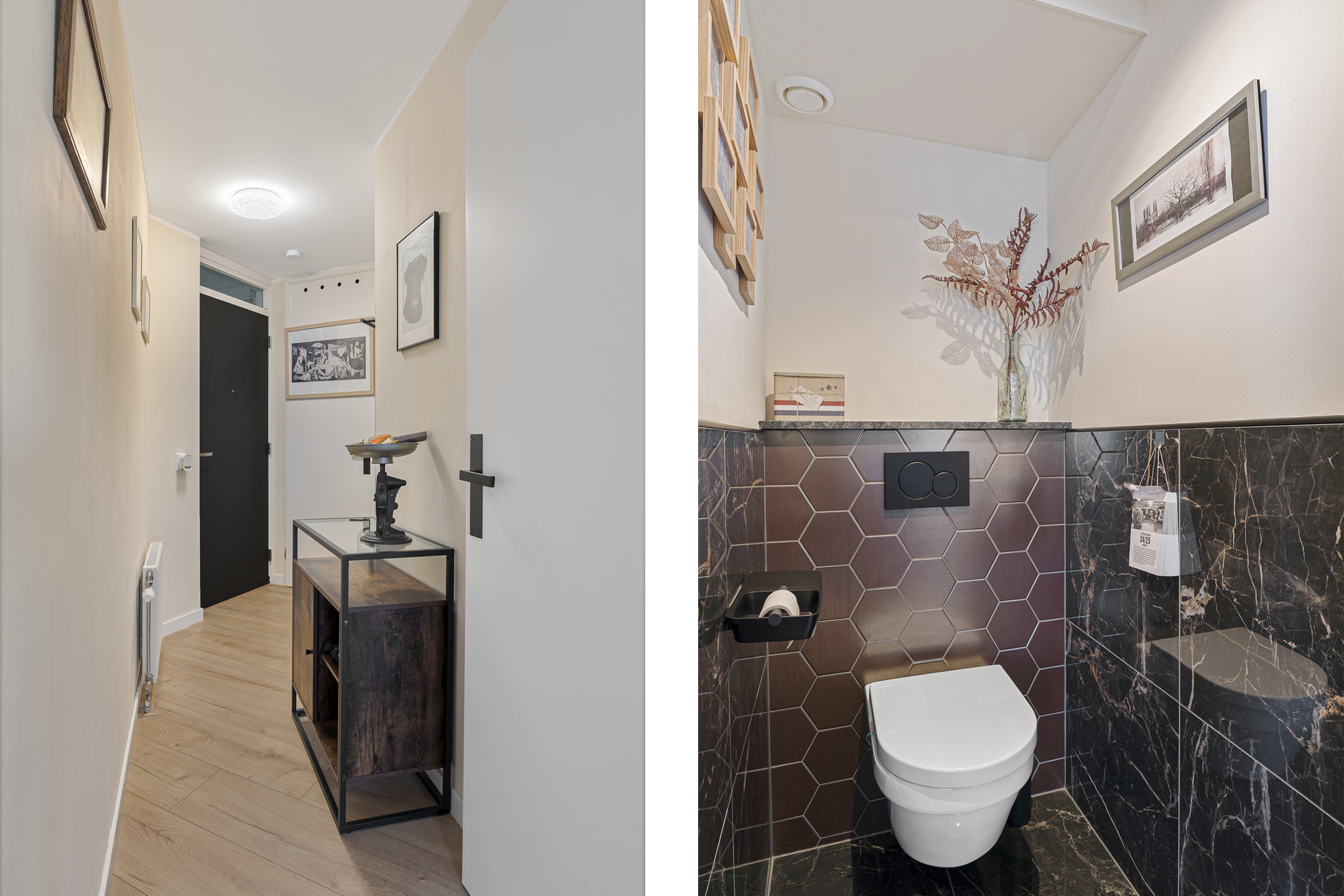 Het toilet is eveneens via de woonkamer bereikbaar en volledig gemoderniseerd. Naast het toilet bevindt zich een vaste kast met de opstelling van de cv-ketel (huur).