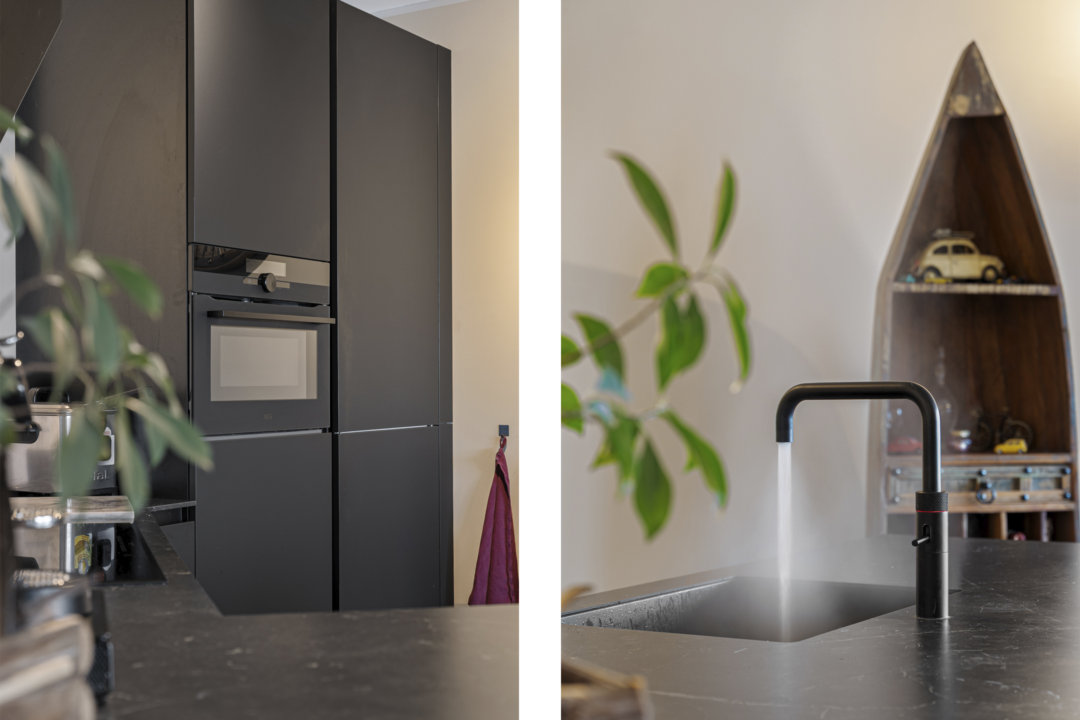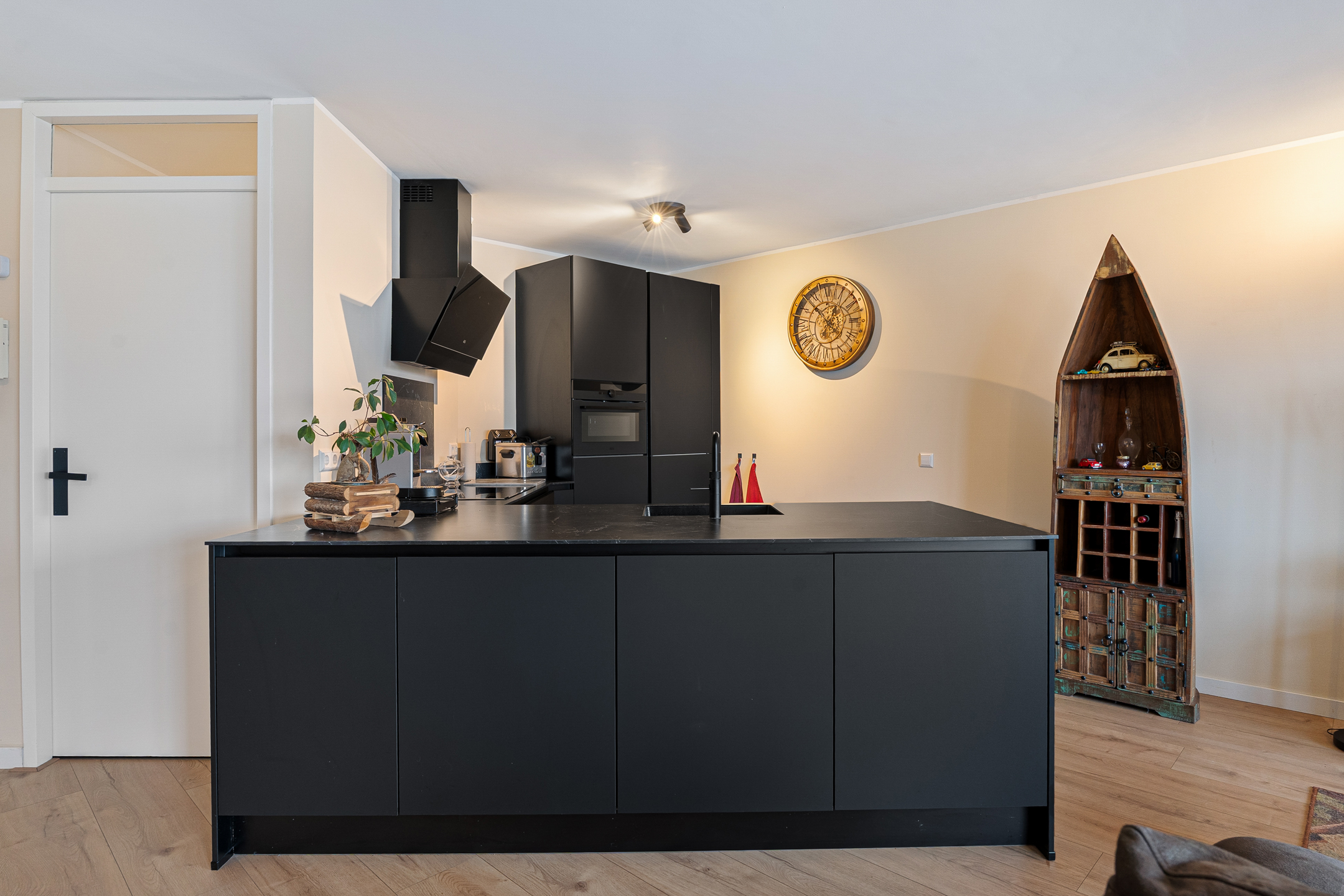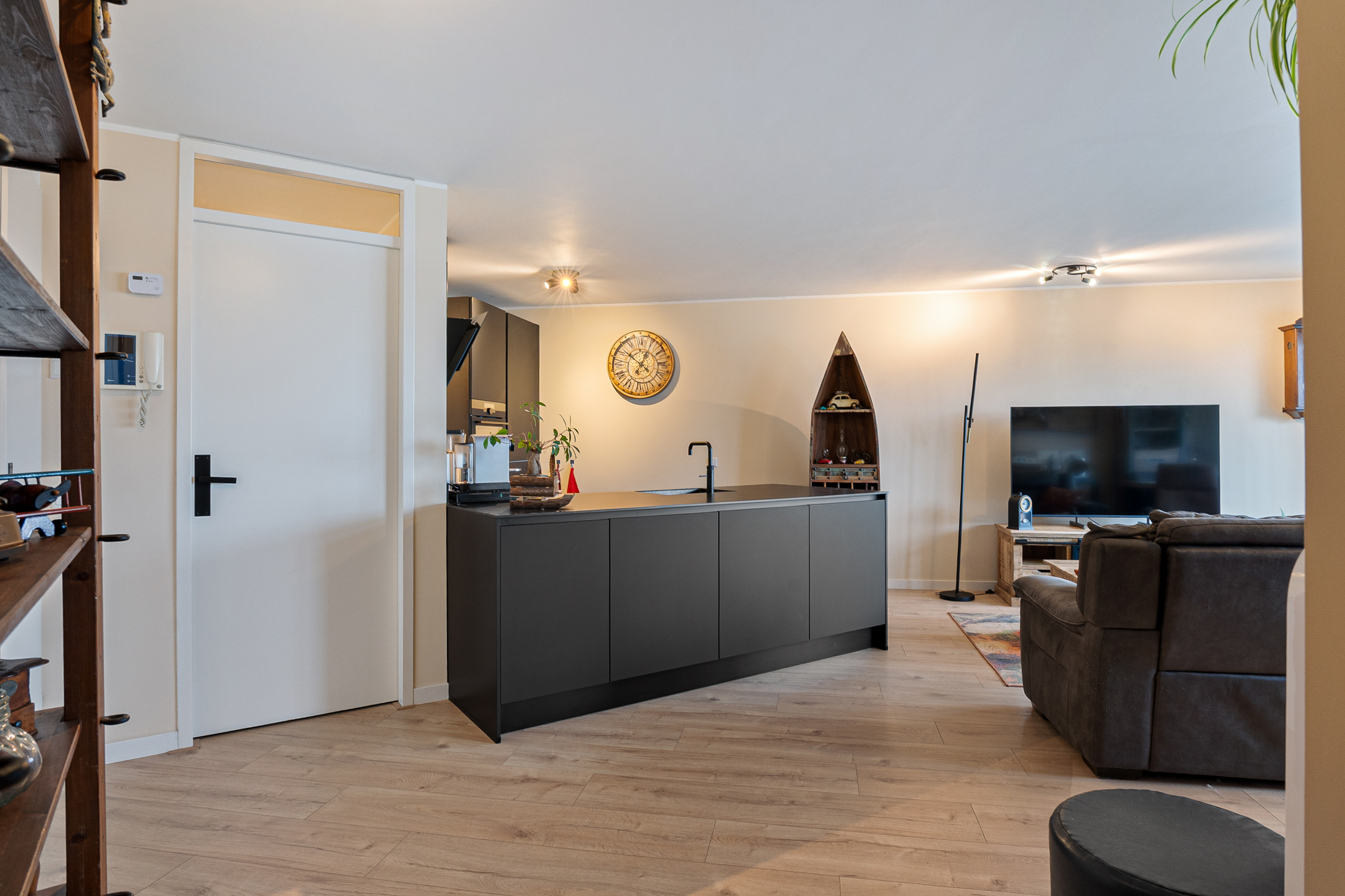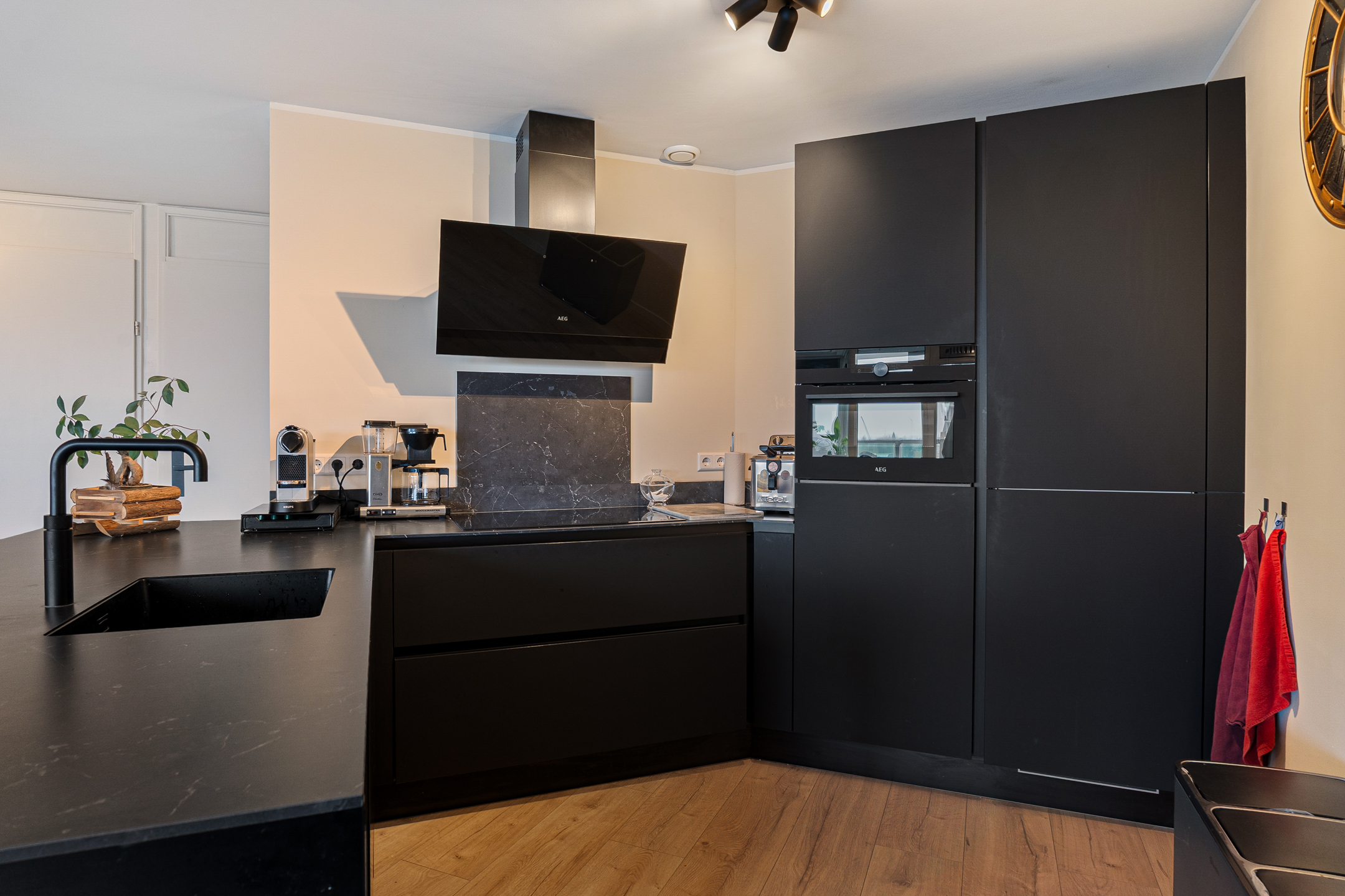 Aan de voorzijde bevindt zich de open keuken, uitgevoerd in een moderne zwarte kleurstelling. De keuken is compleet uitgerust met een Quooker, vaatwasser, oven, inductiekookplaat en een stijlvol granieten werkblad. Een tijdloze keuken die perfect aansluit bij de rest van het appartement.