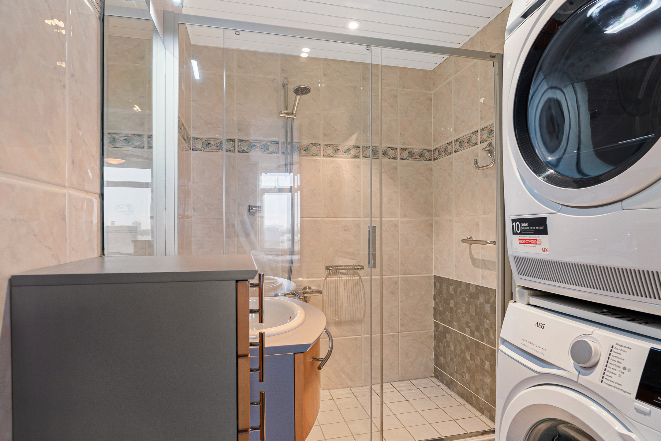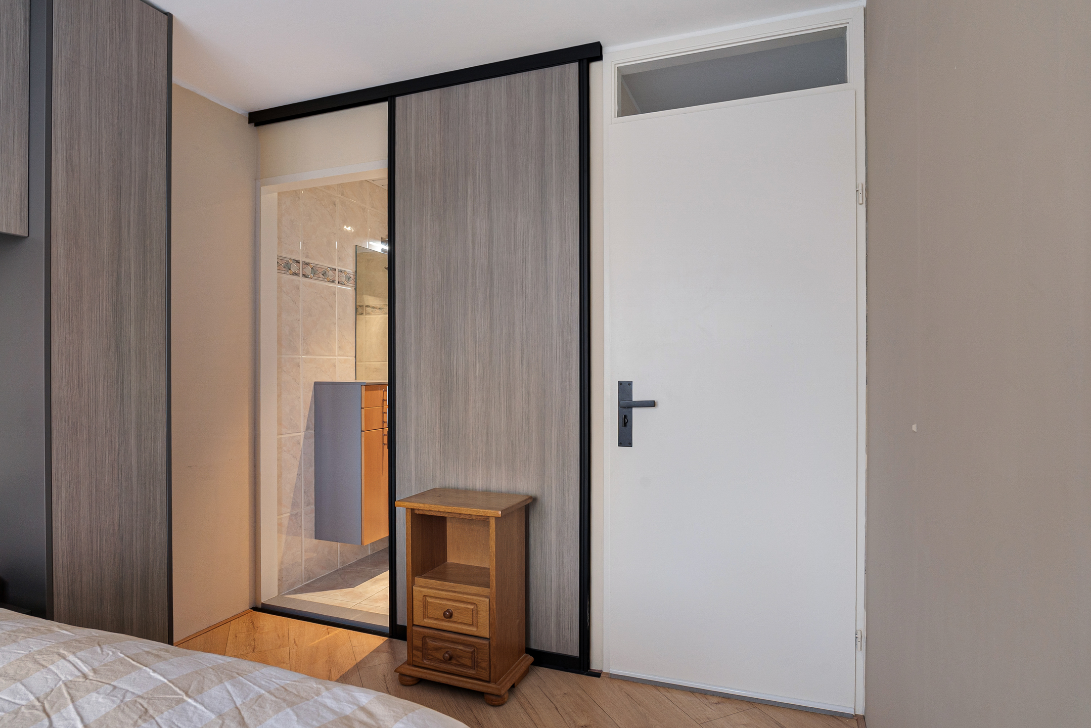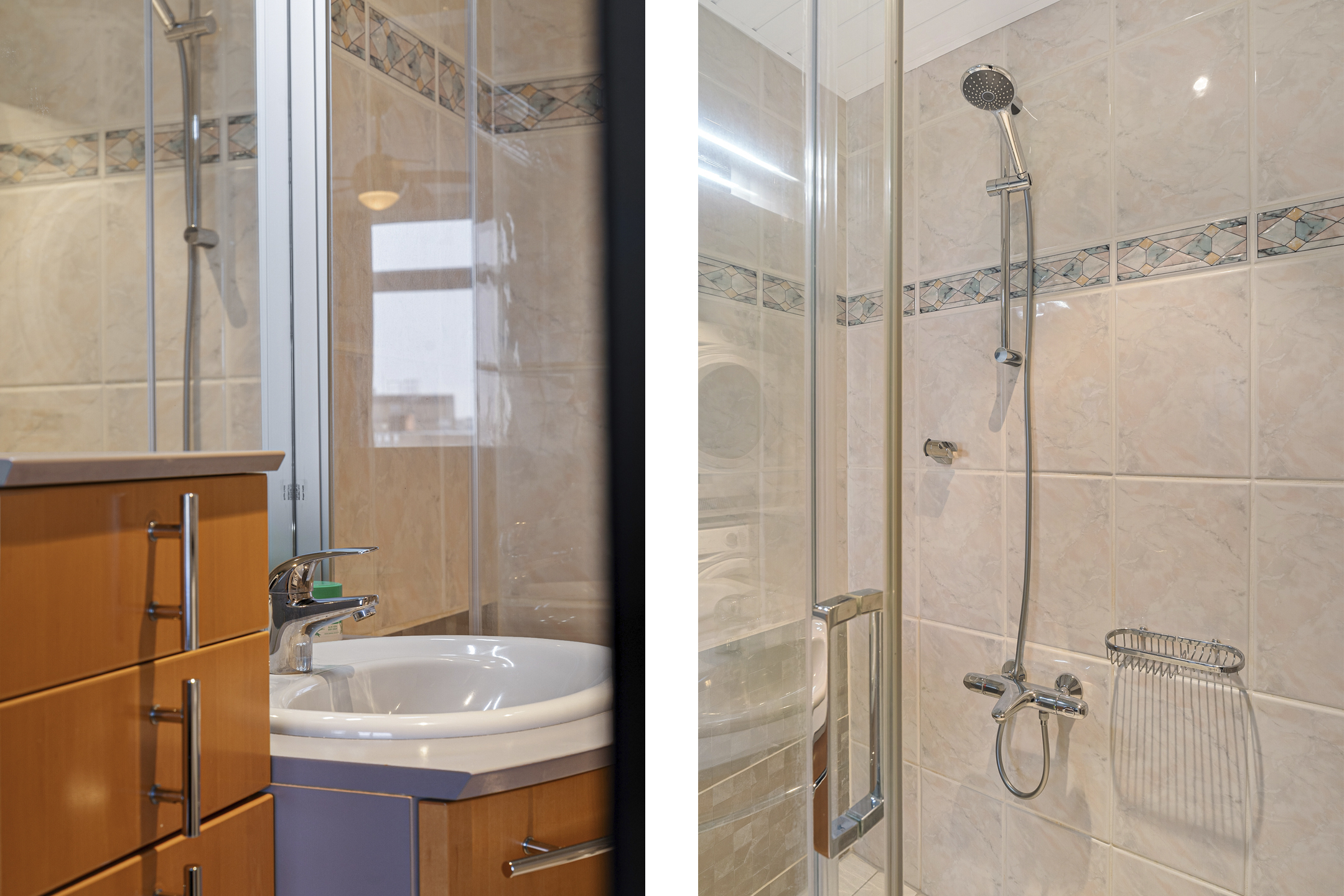Het appartement beschikt over twee lichte slaapkamers. De rechter slaapkamer biedt directe toegang tot de volledig betegelde badkamer, die is voorzien van een douchecabine, wastafelmeubel en een aansluiting voor de wasmachine.