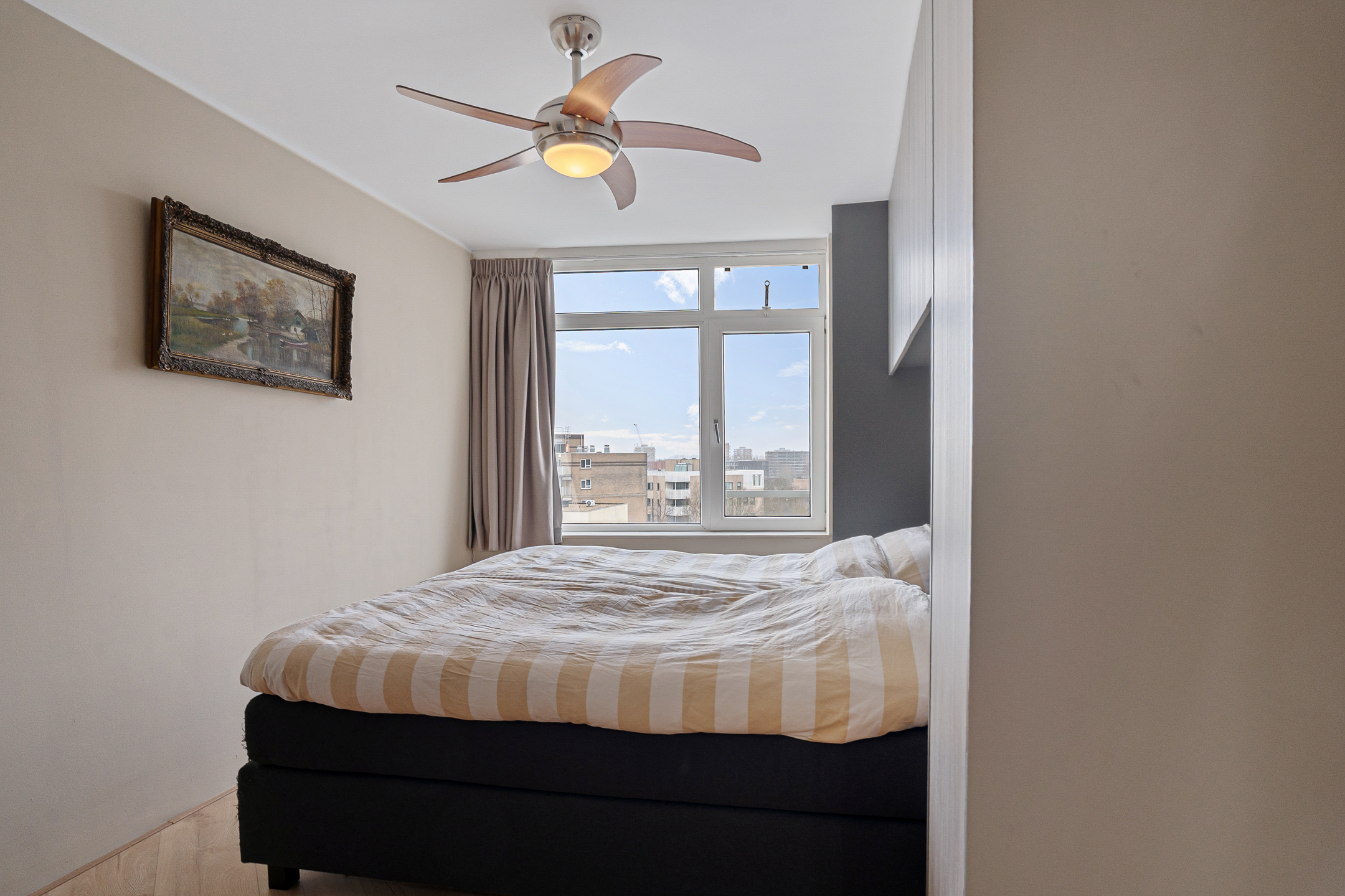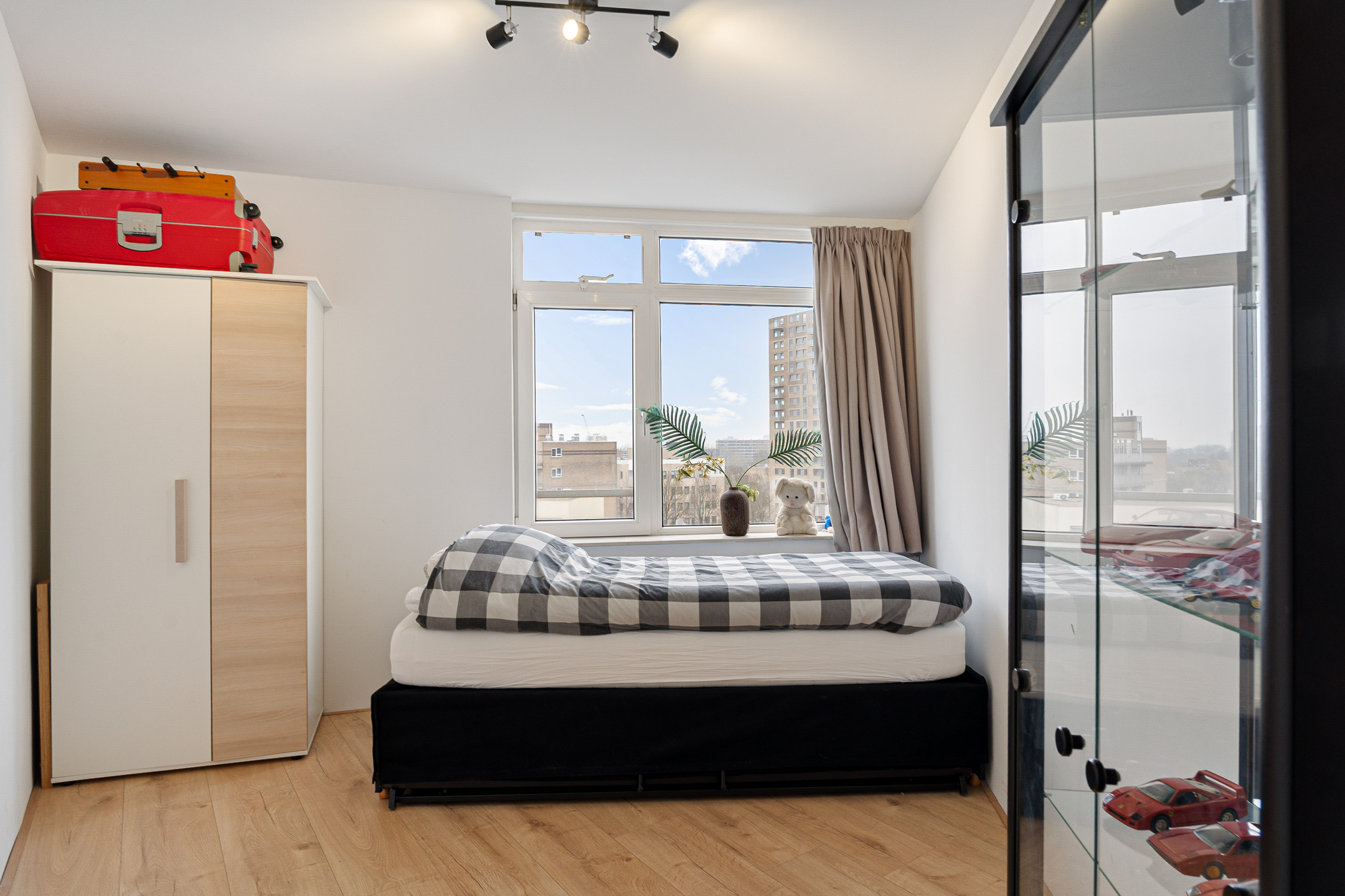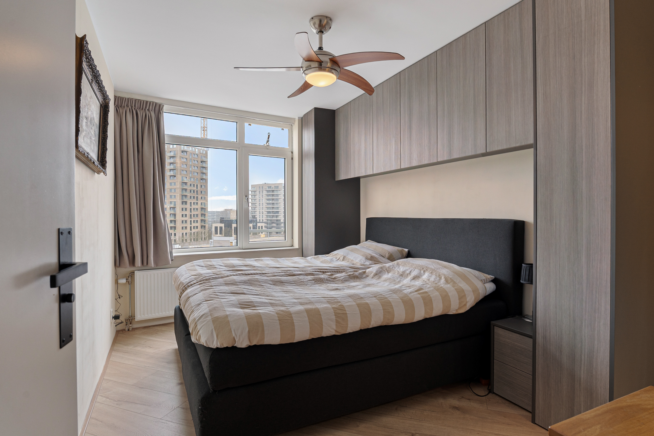 Het appartement beschikt over twee lichte slaapkamers. De rechter slaapkamer biedt directe toegang tot de volledig betegelde badkamer, die is voorzien van een douchecabine, wastafelmeubel en een aansluiting voor de wasmachine.