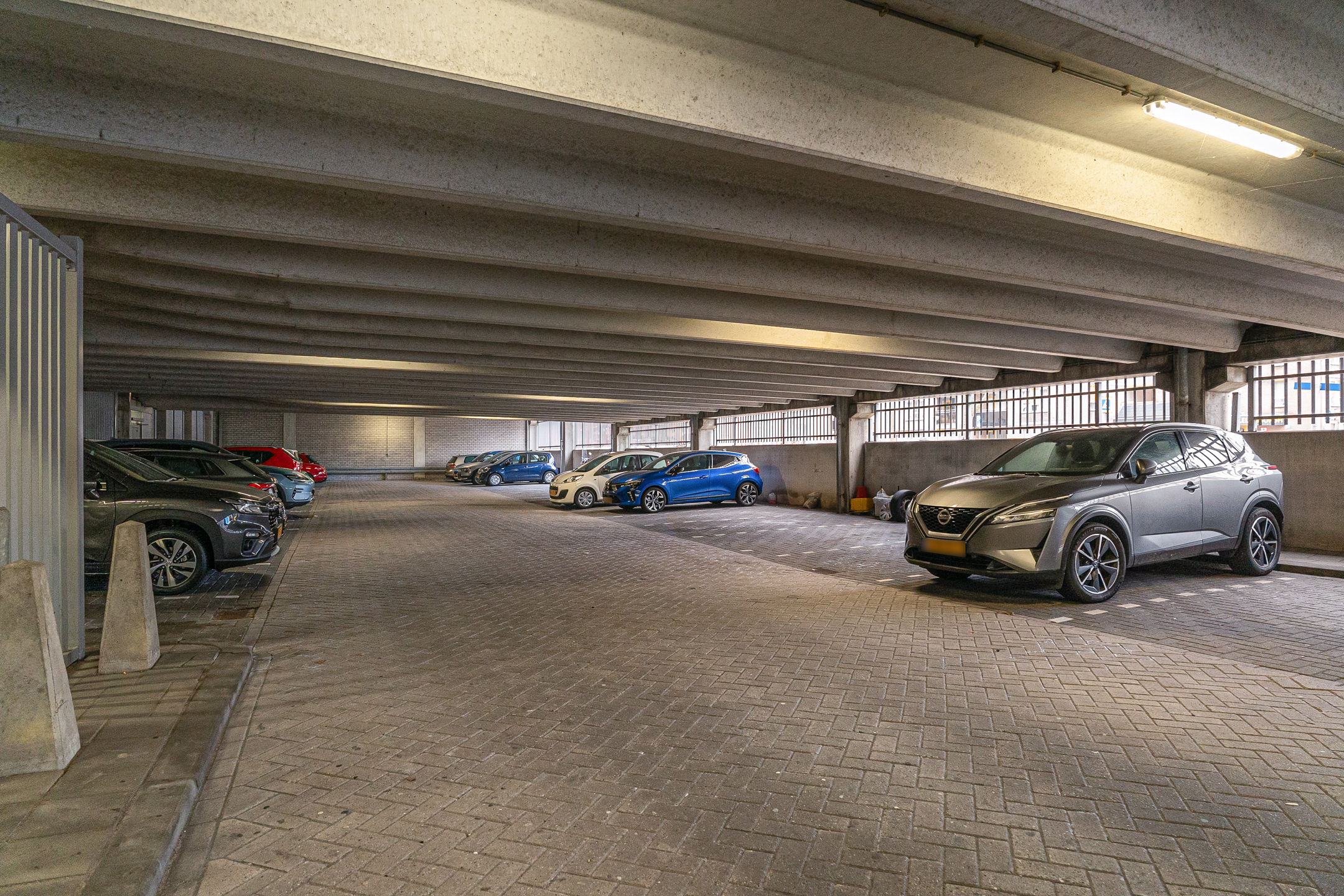 In de onderbouw beschik je over een eigen berging. Daarnaast hoort bij het appartement een vaste parkeerplaats in de door de VvE gehuurde parkeergarage (geen eigendom).