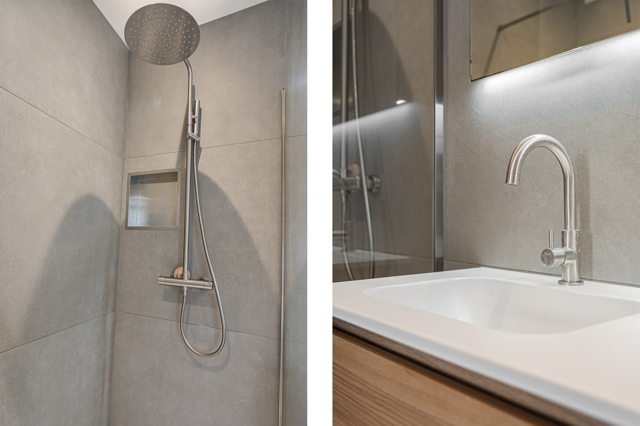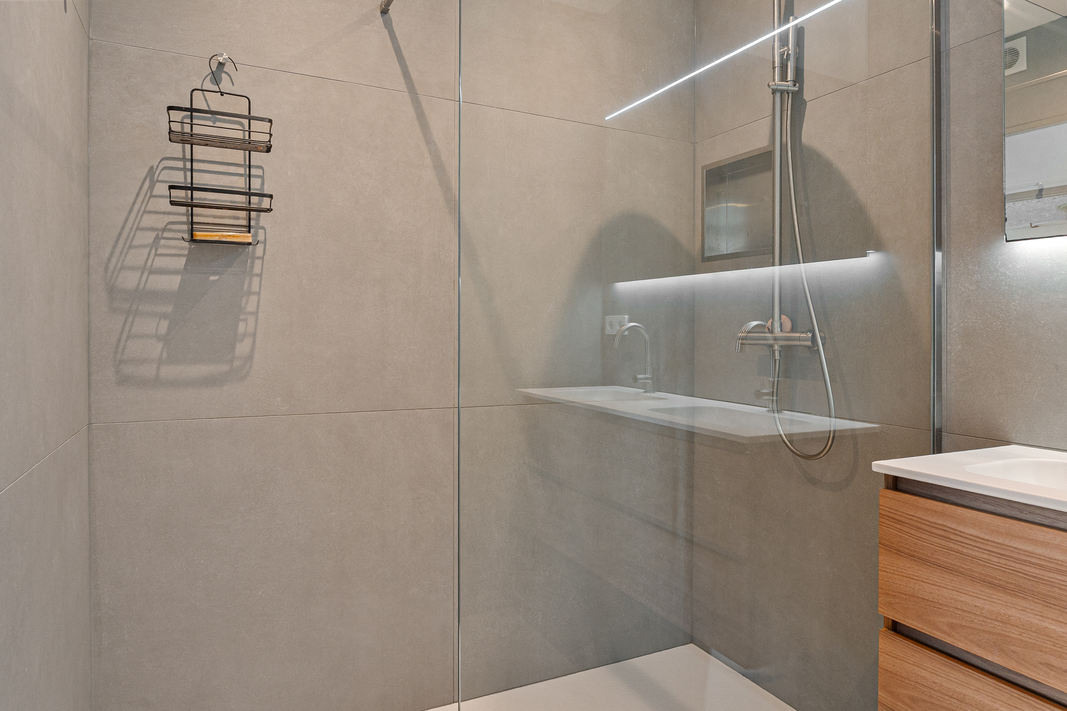 De compleet vernieuwde badkamer (2023) is voorzien van een inloopdouche, wastafelmeubel en elektrische vloerverwarming.