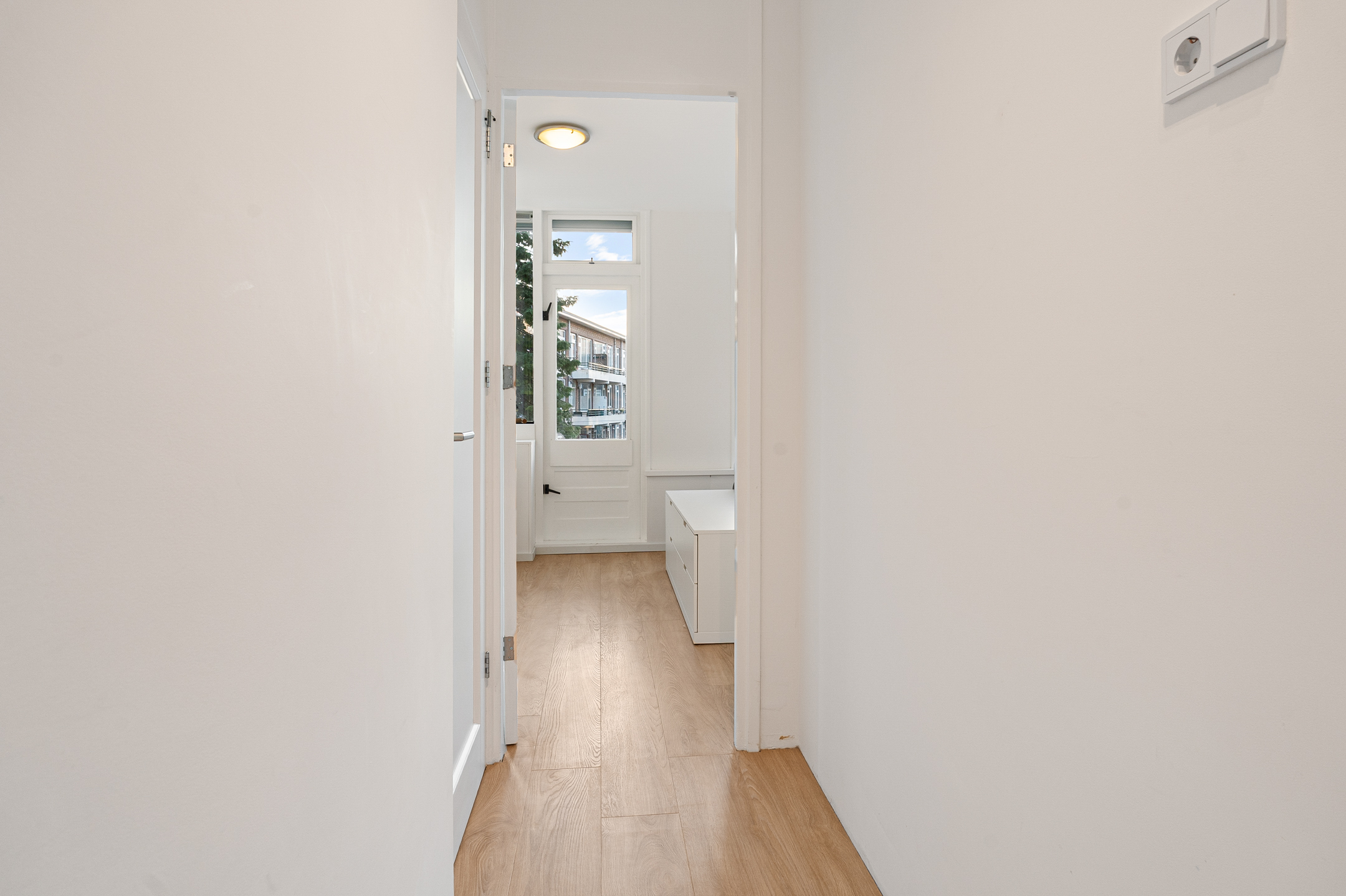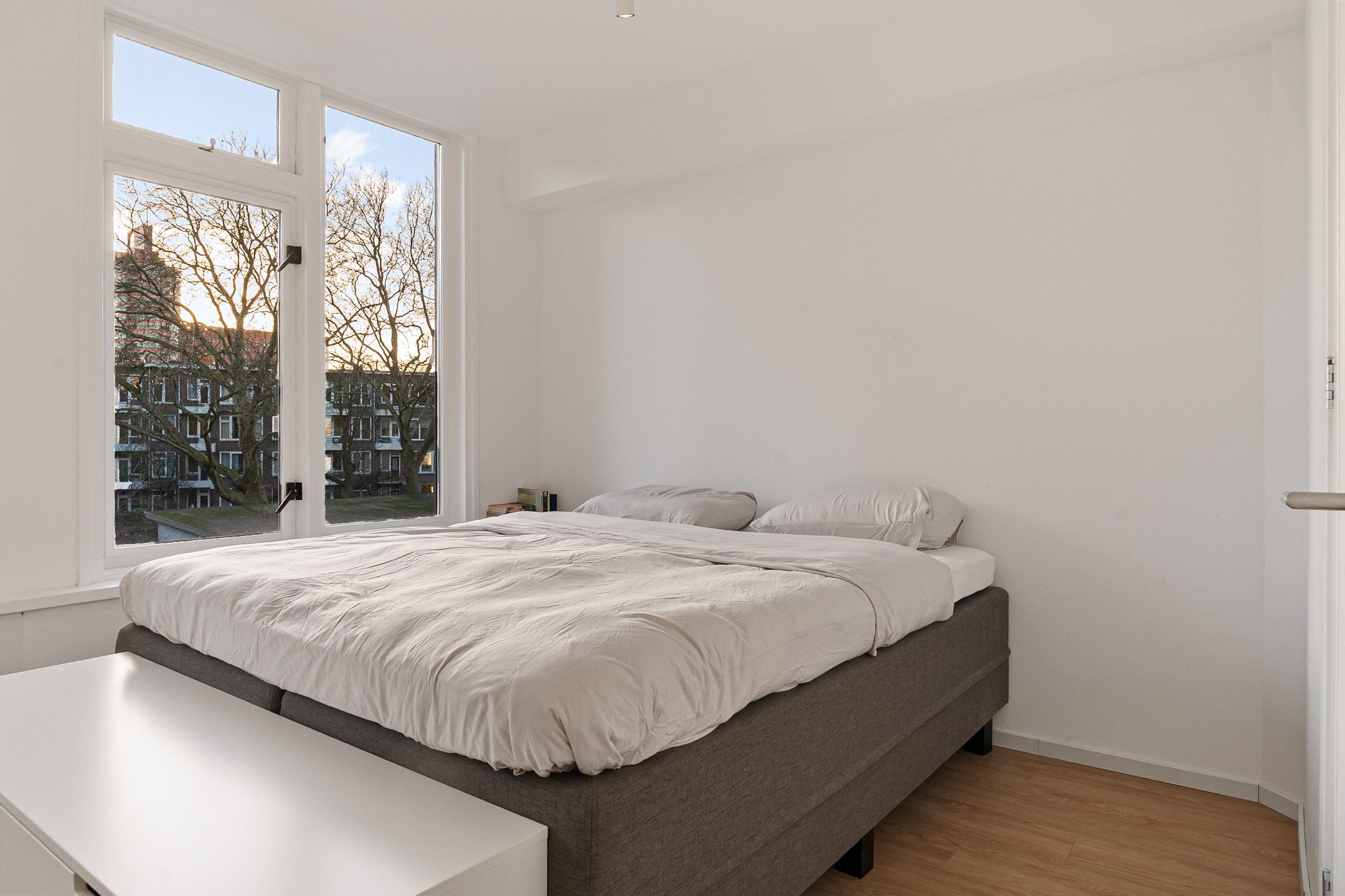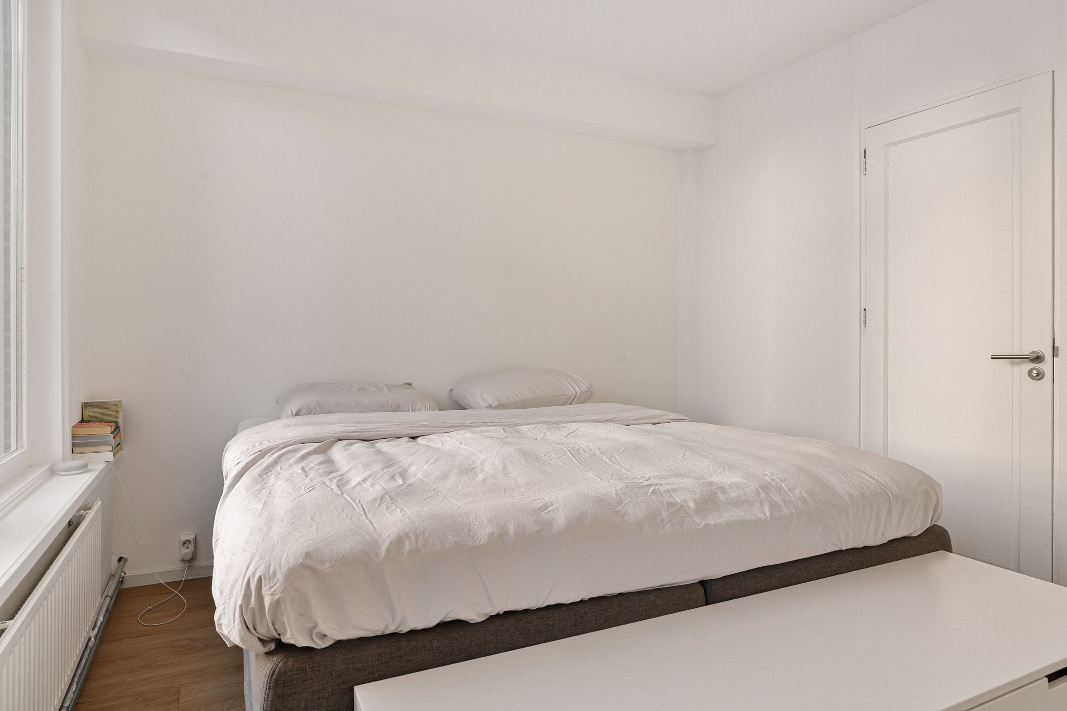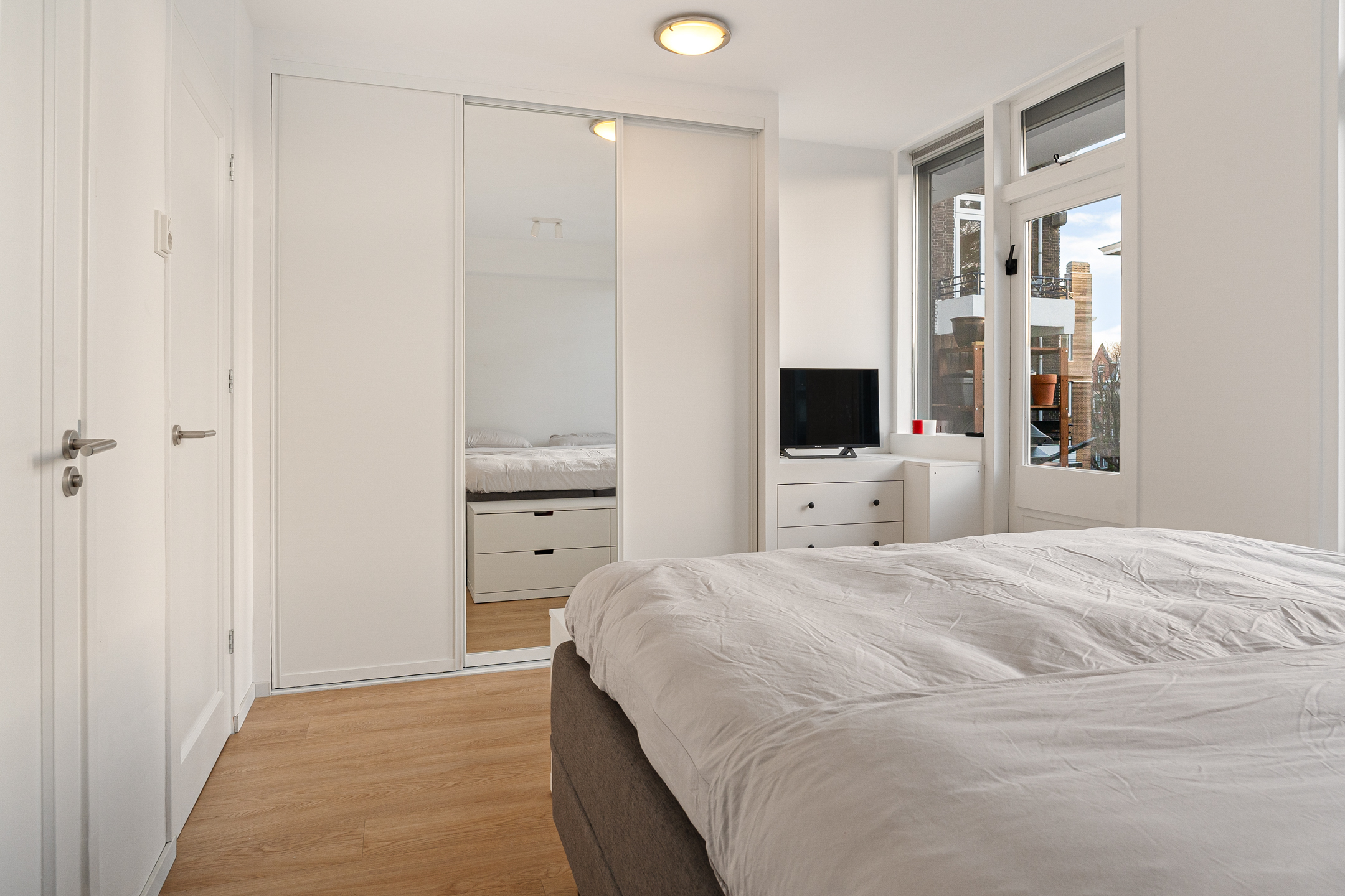 De slaapkamer ligt eveneens aan de achterzijde en beschikt over een vaste kast met wasmachineaansluiting en de recent vernieuwde cv-ketel (2025). De slaapkamer is extra geluidsgeïsoleerd door middel van een geïsoleerd verlaagd plafond. Vanuit hier stap je op het zonnige balkon.