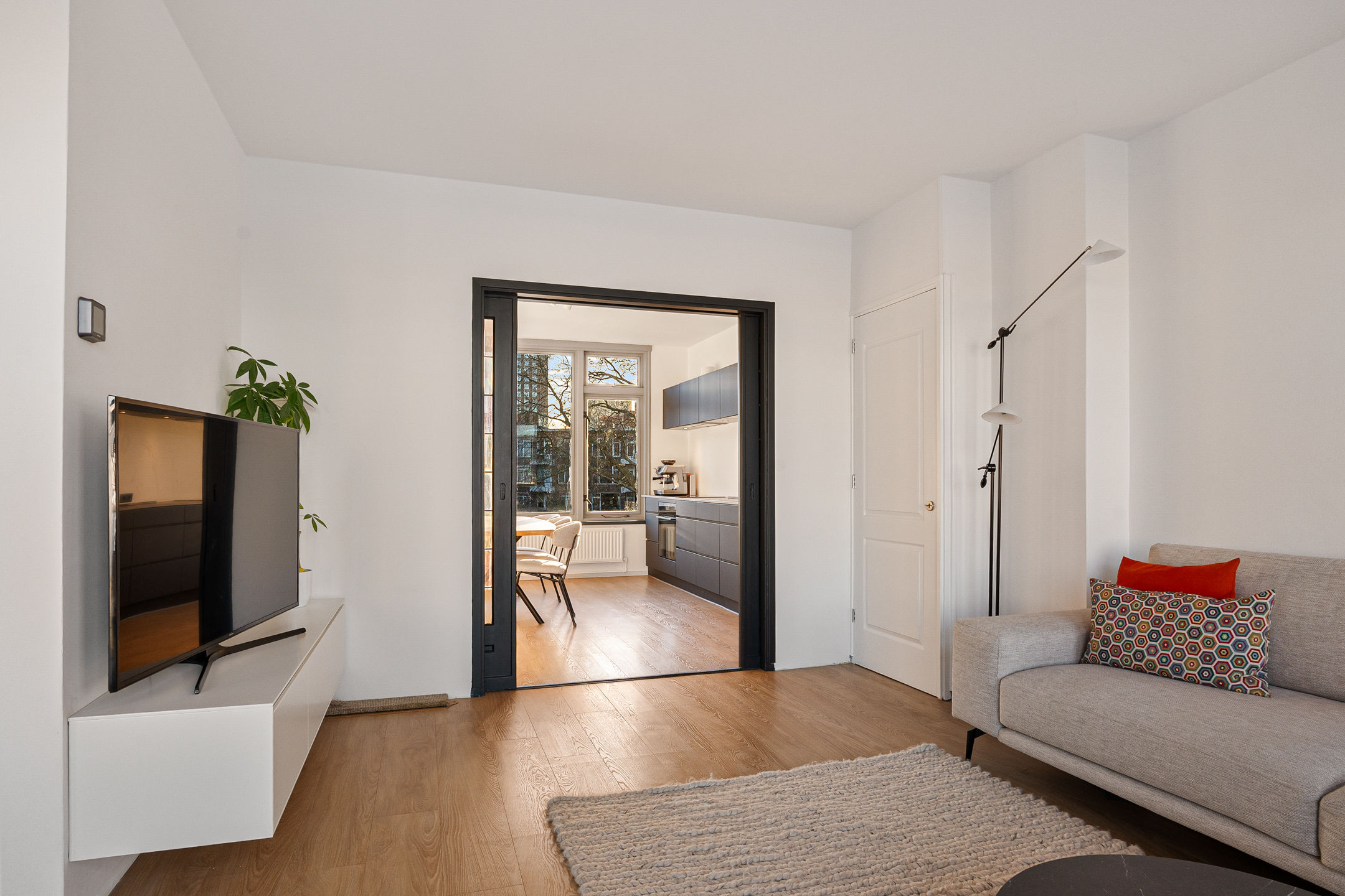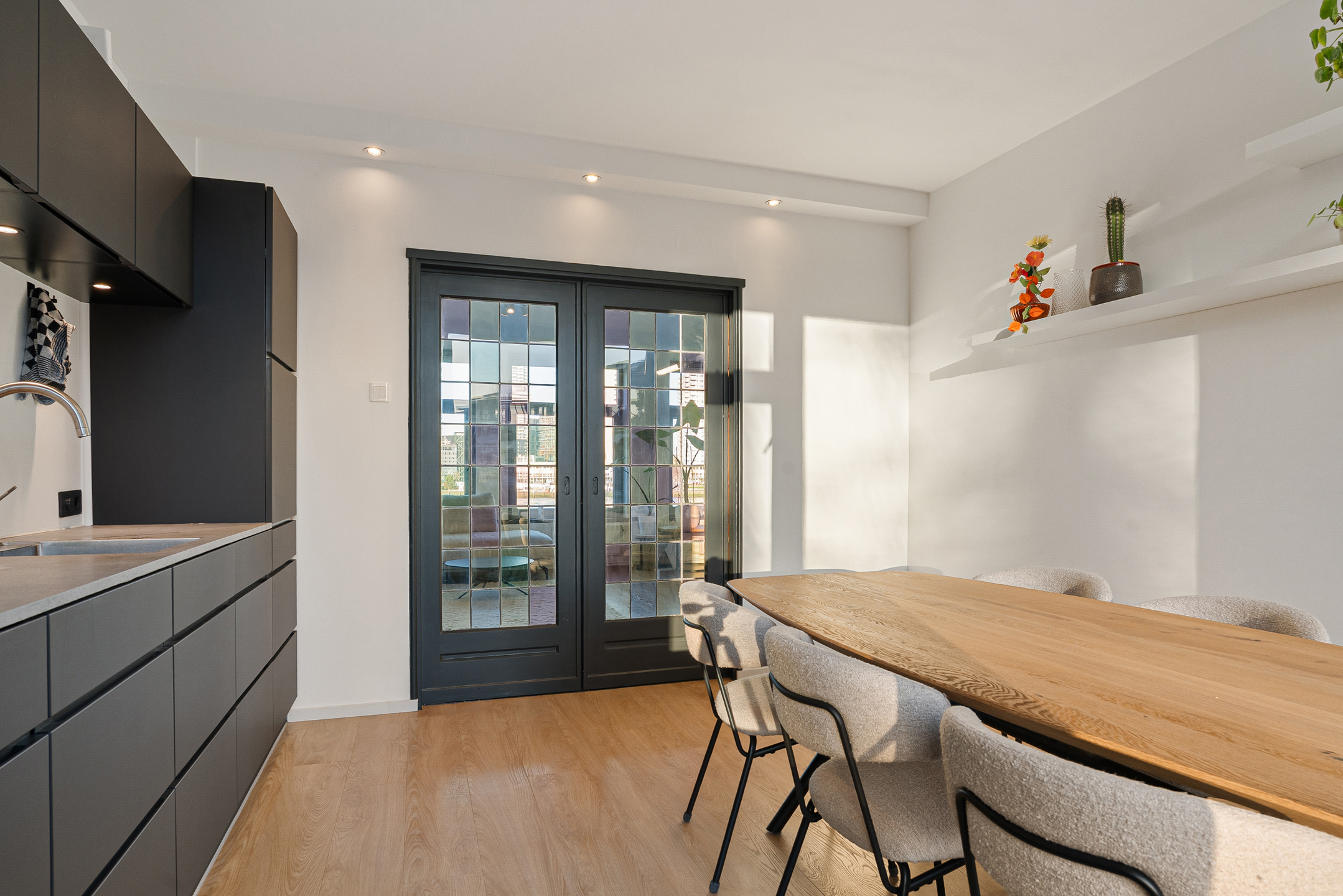 Het appartement ligt op de tweede verdieping. De hal biedt toegang tot het toilet en beschikt over een garderobekast en de meterkast. Aan de voorzijde vind je de woonkamer, waar grote raampartijen een prachtig, vrij uitzicht over de Maas bieden en veel daglicht binnenlaten. De sfeervolle afwerking, pvc vloer en glas-in-lood schuifdeuren geven de woonkamer extra karakter.