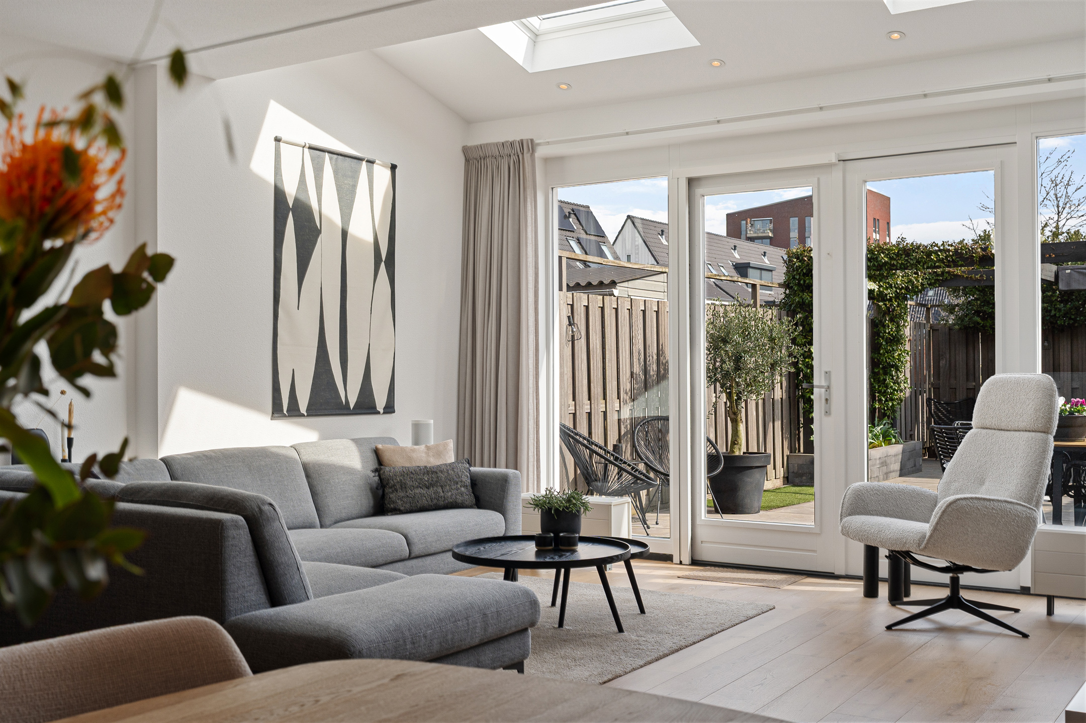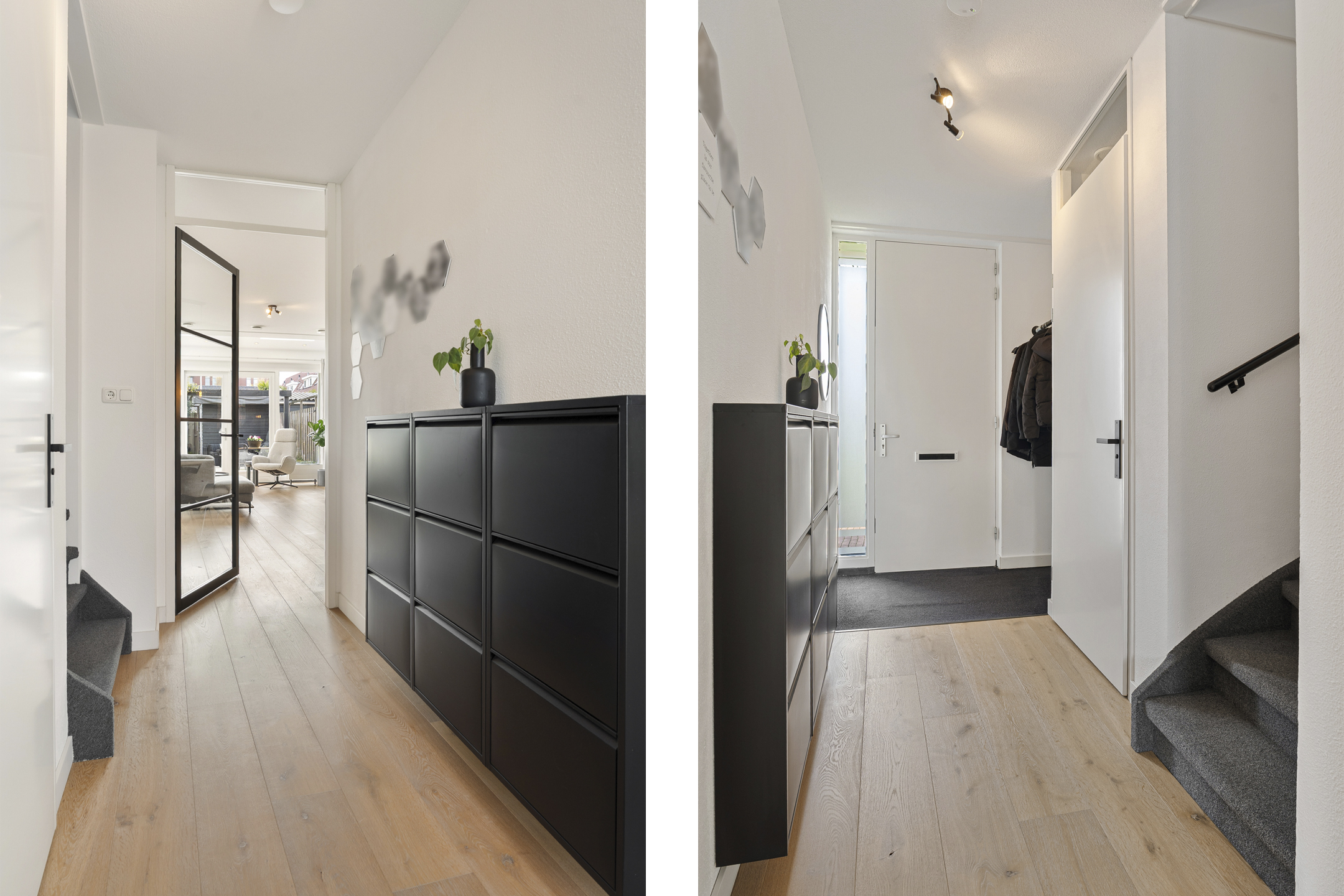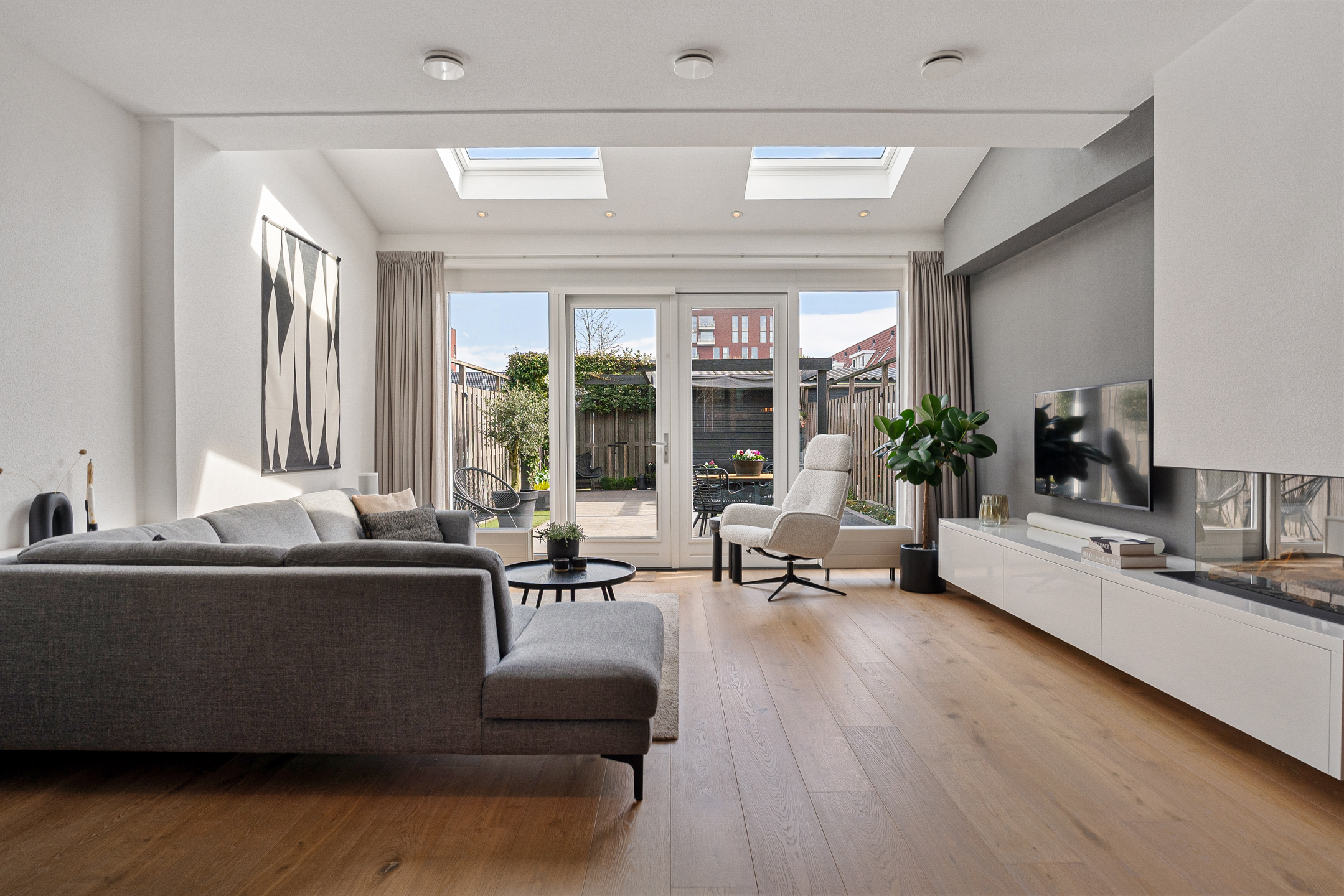 Bij binnenkomst stap je in de lichte hal, die toegang biedt tot het toilet en de trap naar de eerste verdieping. De ruime woonkamer profiteert van veel natuurlijk licht en is door de uitbouw van circa 2,5 meter aan de achterzijde aanzienlijk vergroot.