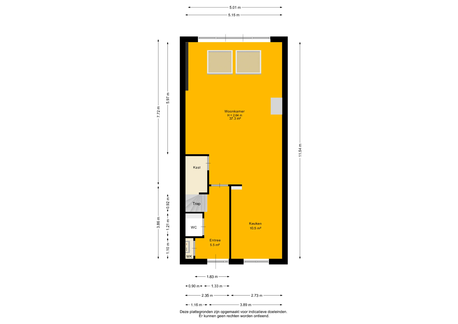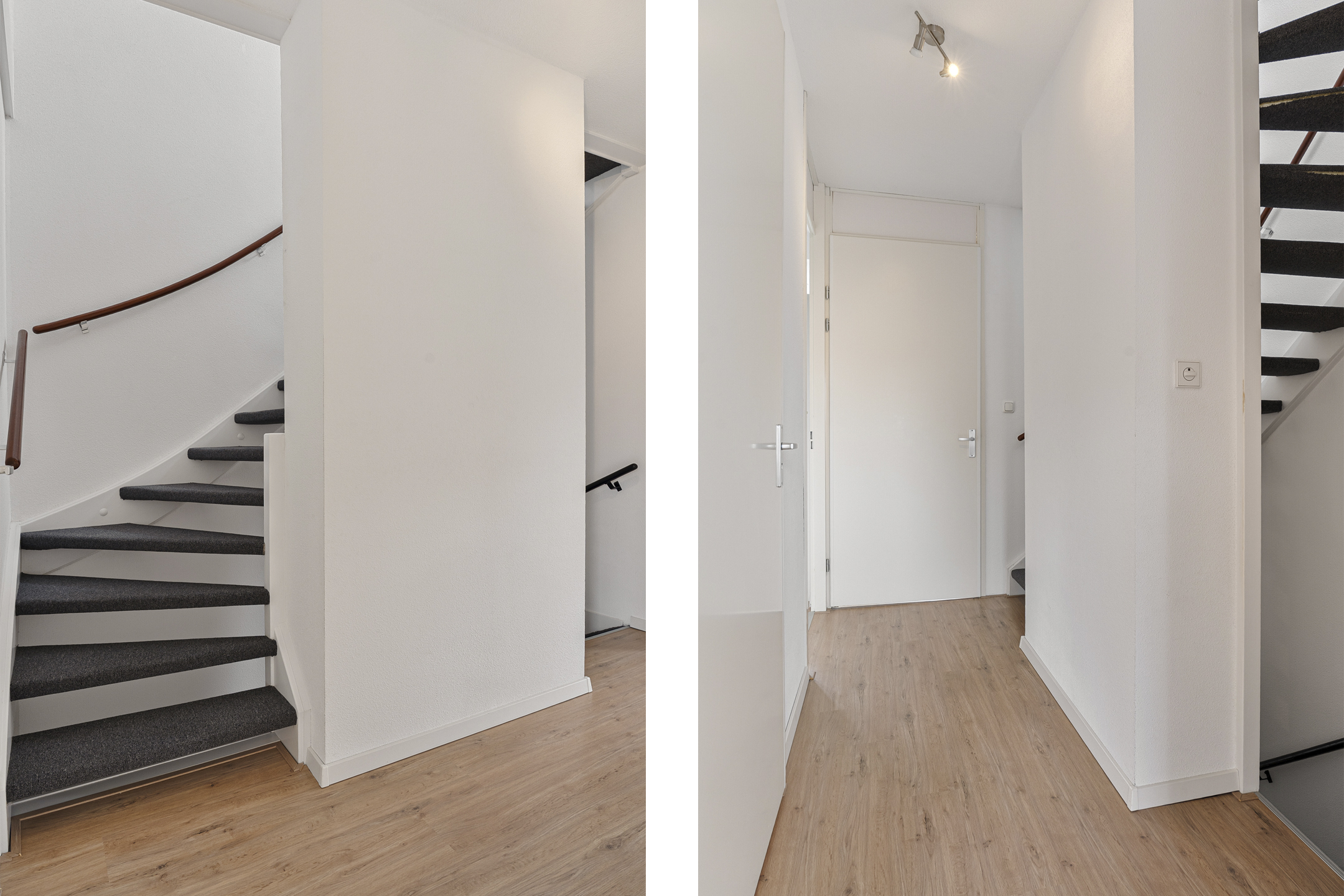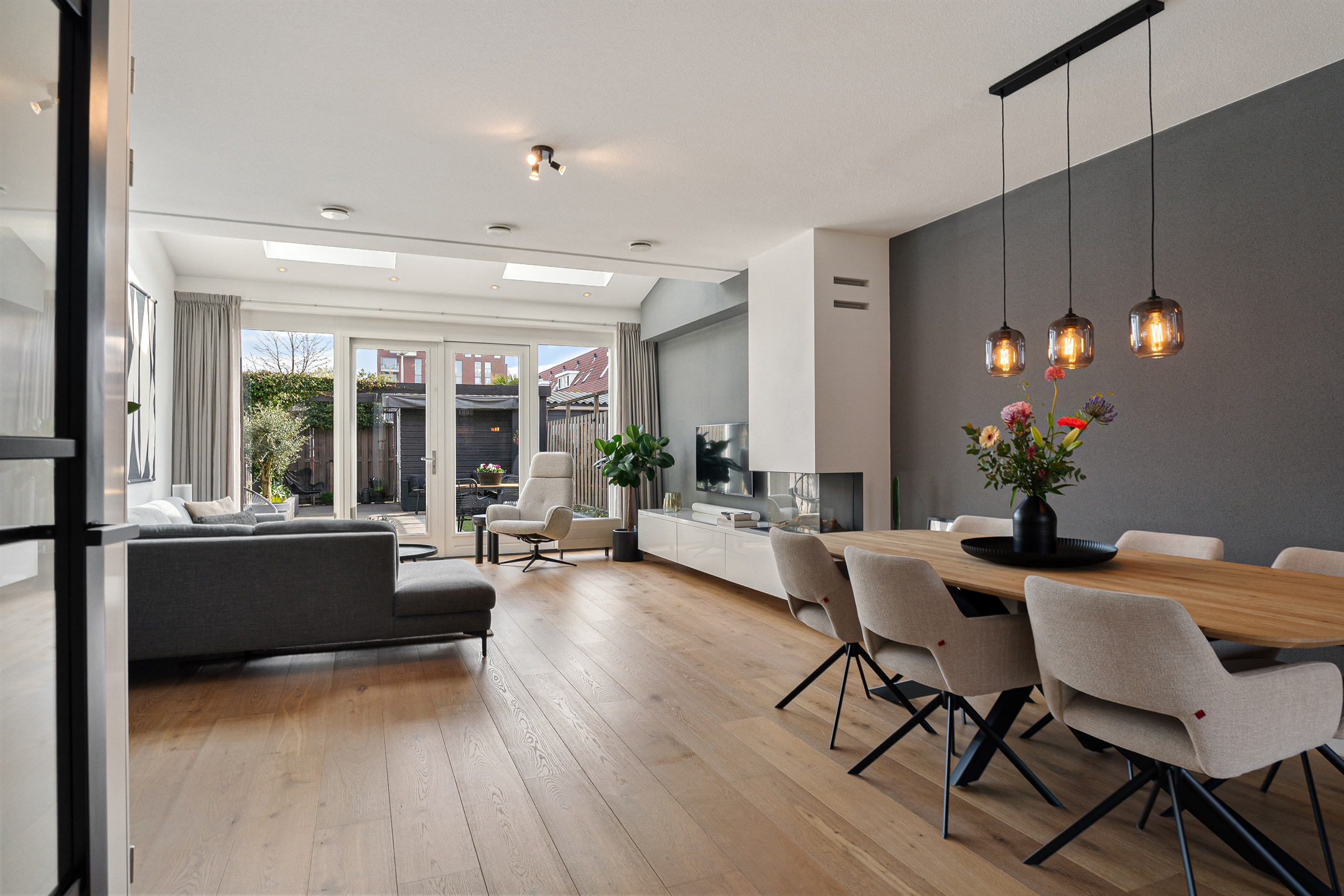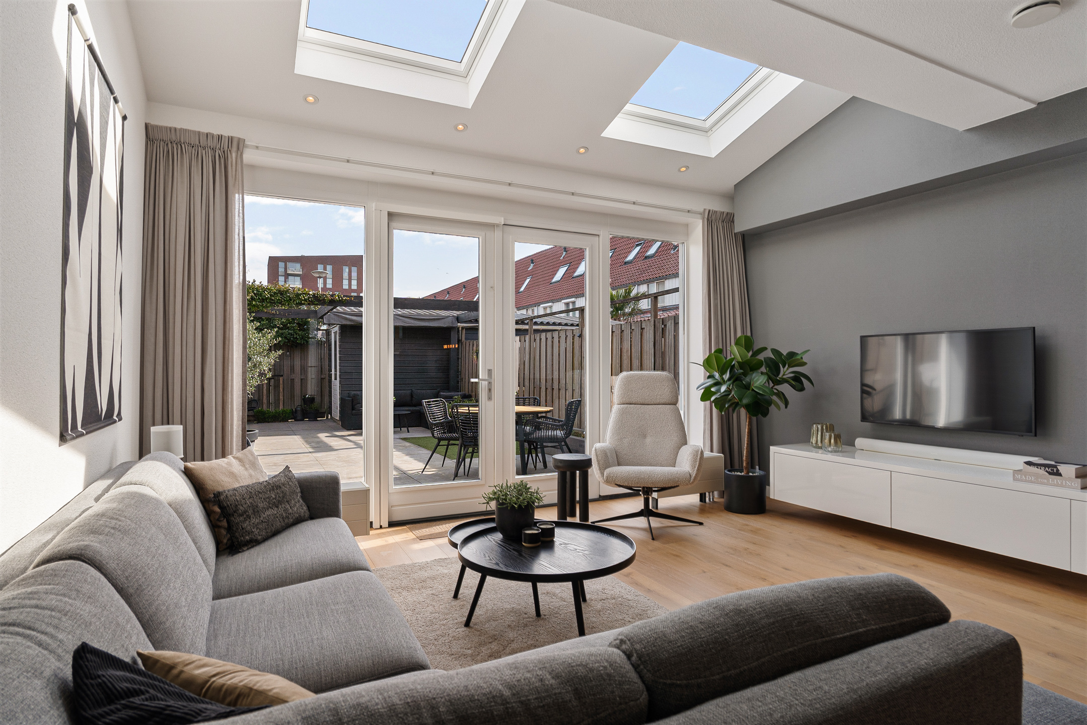 Bij binnenkomst stap je in de lichte hal, die toegang biedt tot het toilet en de trap naar de eerste verdieping. De ruime woonkamer profiteert van veel natuurlijk licht en is door de uitbouw van circa 2,5 meter aan de achterzijde aanzienlijk vergroot.