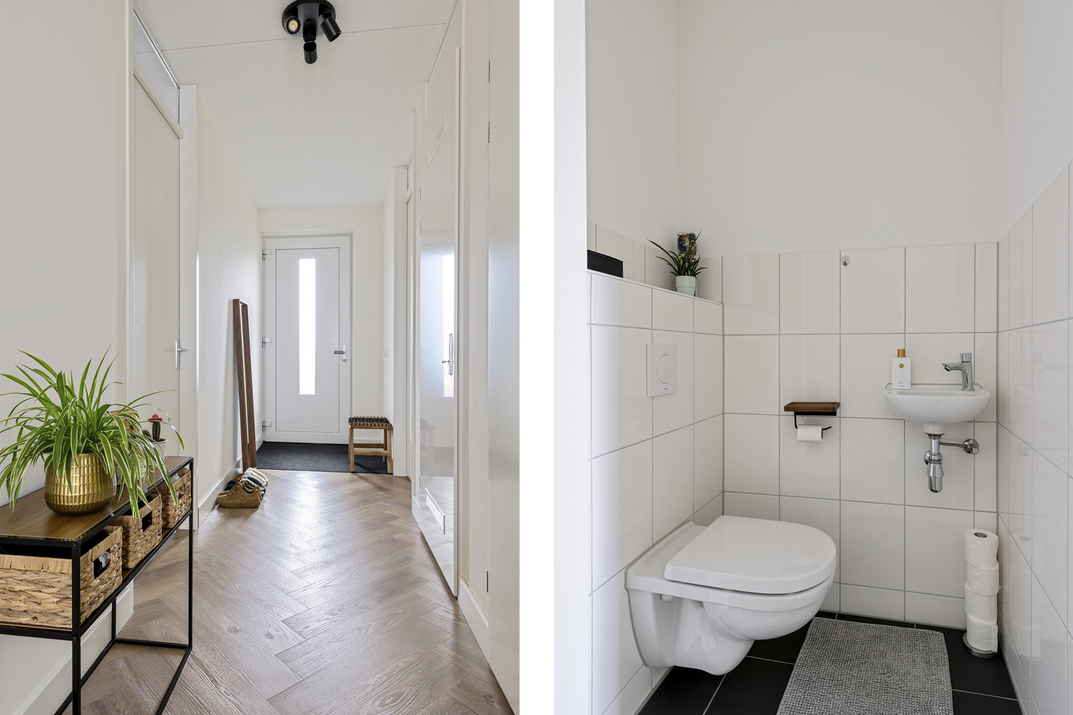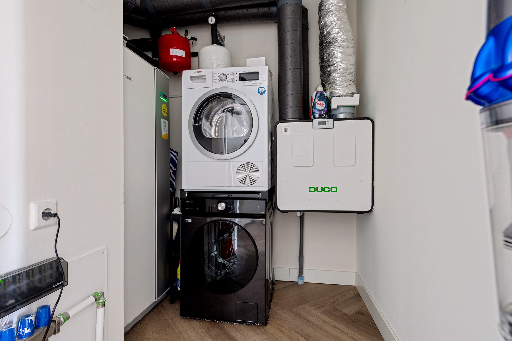 Bij binnenkomst valt direct de nette afwerking op. In de hal tref je een ruime meterkast, de technische ruimte met de warmtepomp en WTW-installatie, en een modern toilet met hangcloset en fontein.