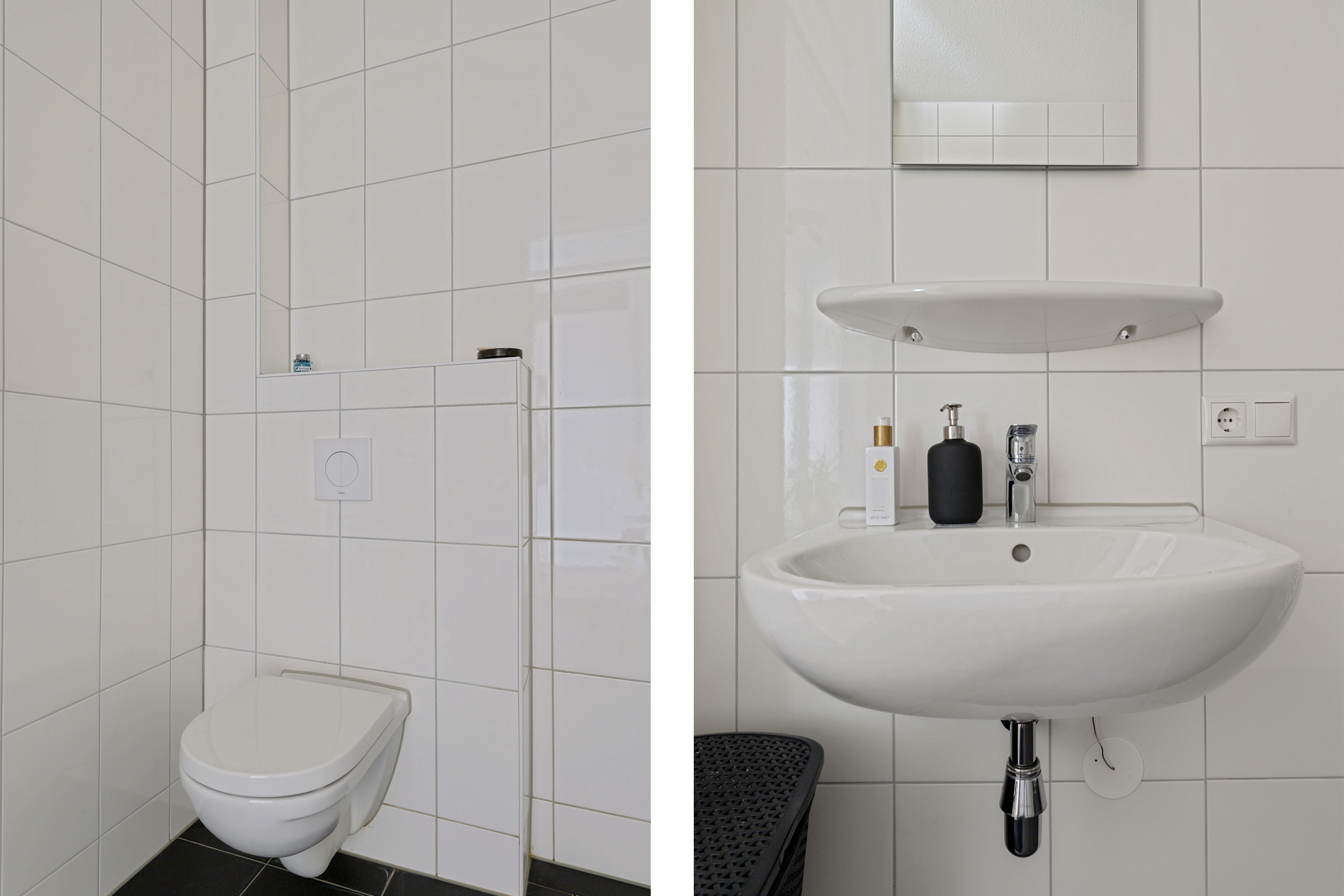 De volledig betegelde badkamer is modern afgewerkt met een ruime inloopdouche, wastafelmeubel, tweede toilet, elektrische radiator én vloerverwarming voor extra comfort.