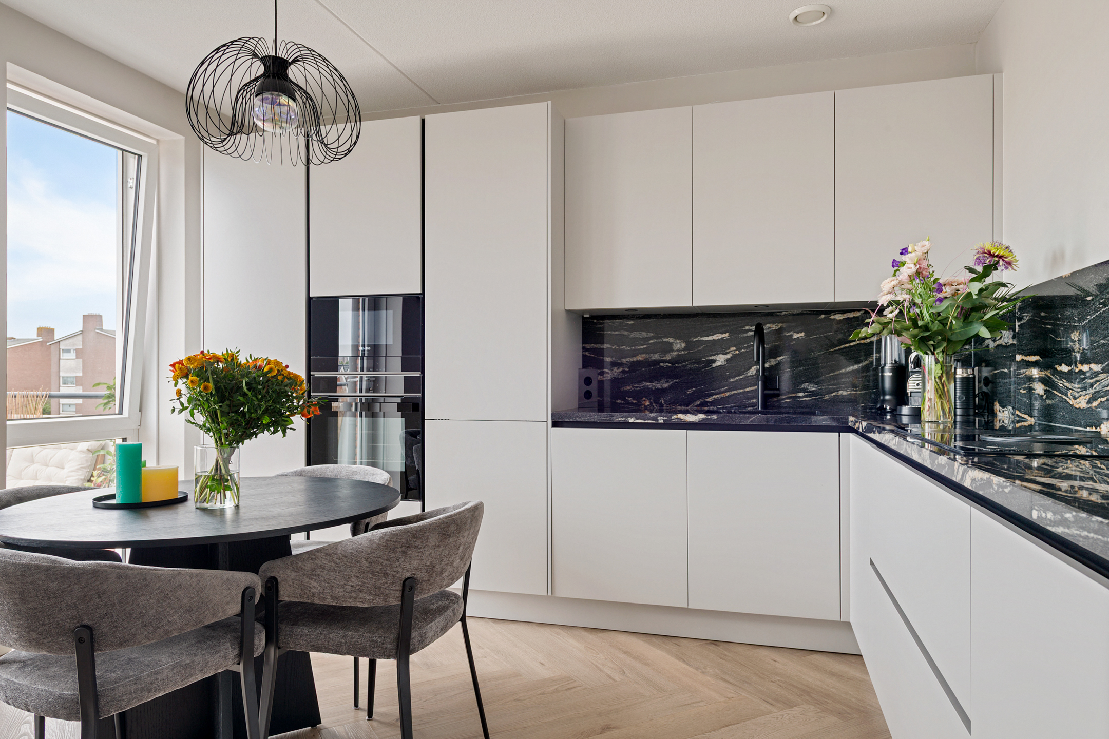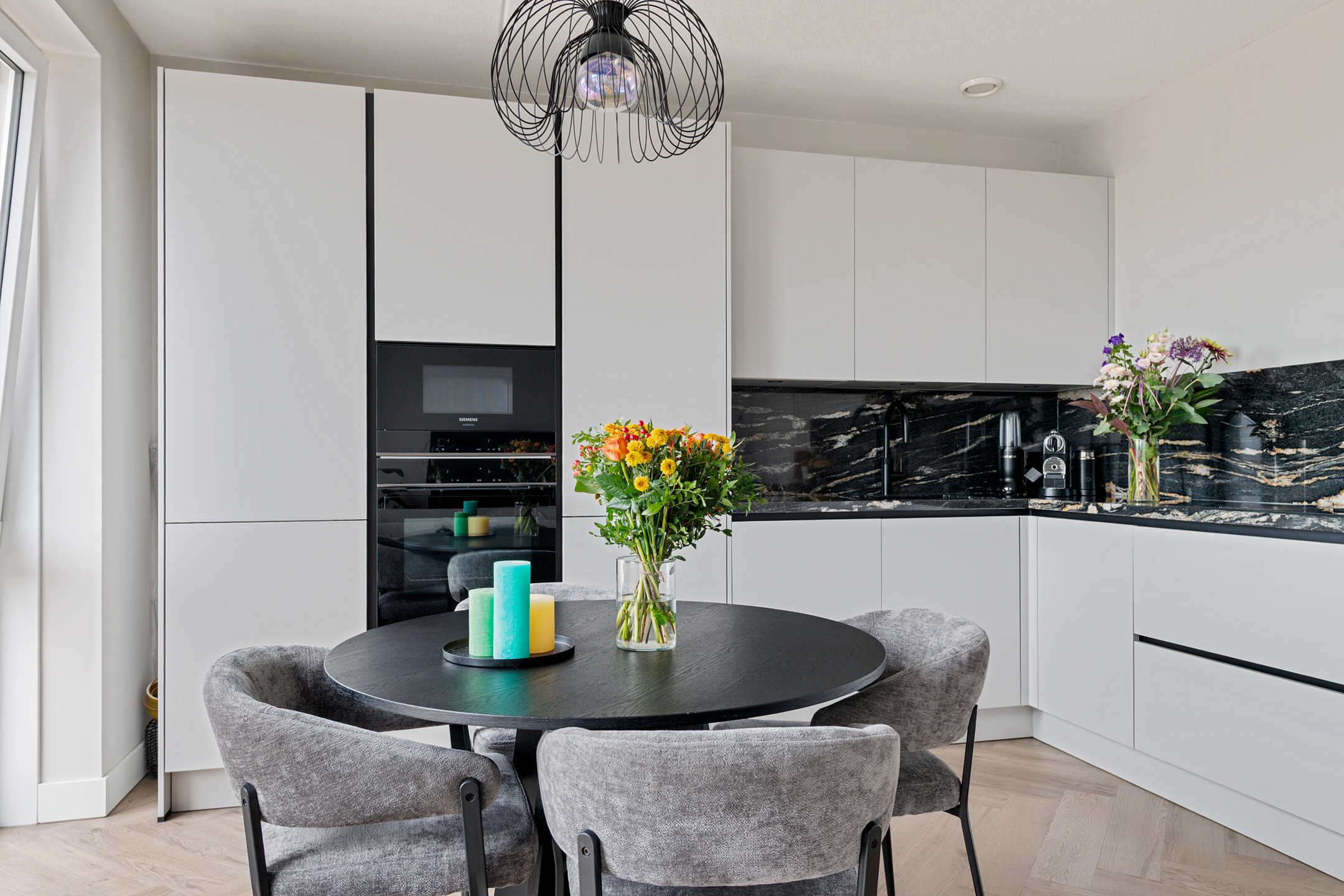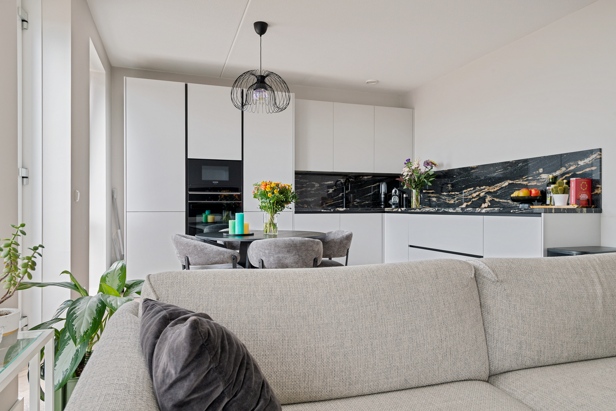 De royale woonkamer heeft kamerhoge raampartijen die zorgen voor een overvloed aan natuurlijk licht. De luxe visgraatvloer draagt bij aan de warme uitstraling en loopt drempelloos door in de rest van het appartement. De open keuken in L-opstelling is strak en compleet, met moderne inbouwapparatuur zoals een inductiekookplaat, koel-vriescombinatie, oven en vaatwasser.