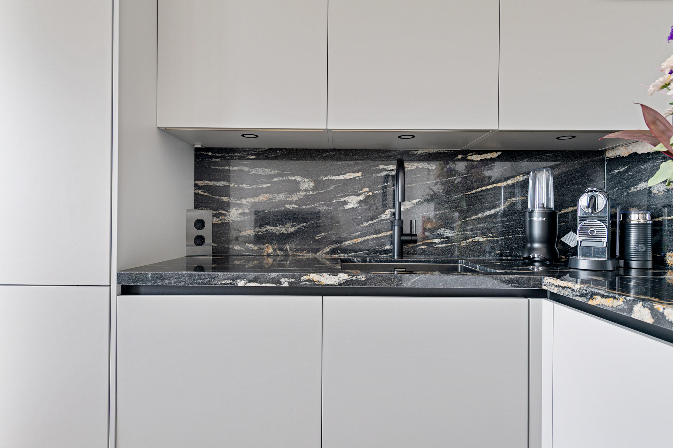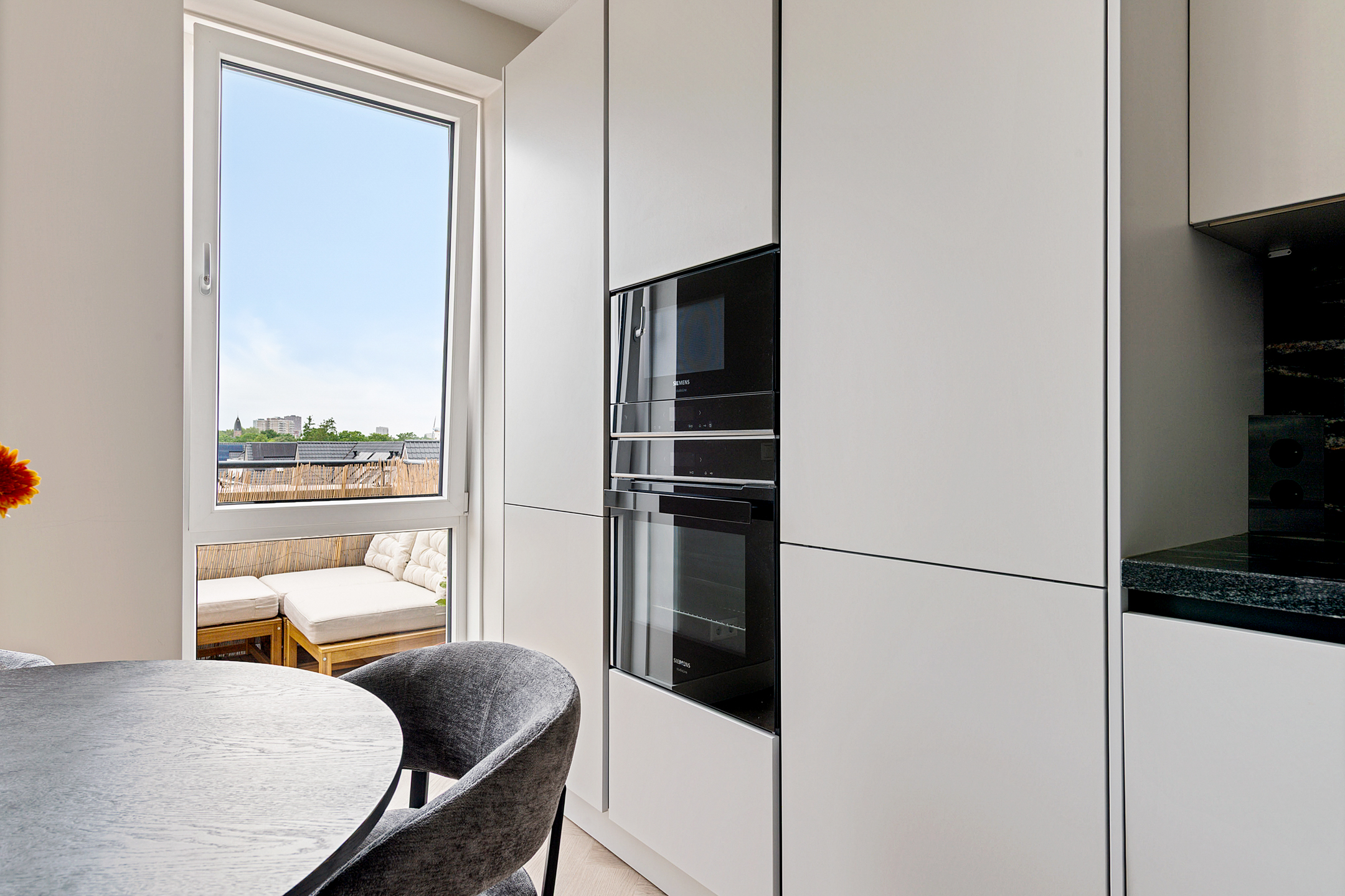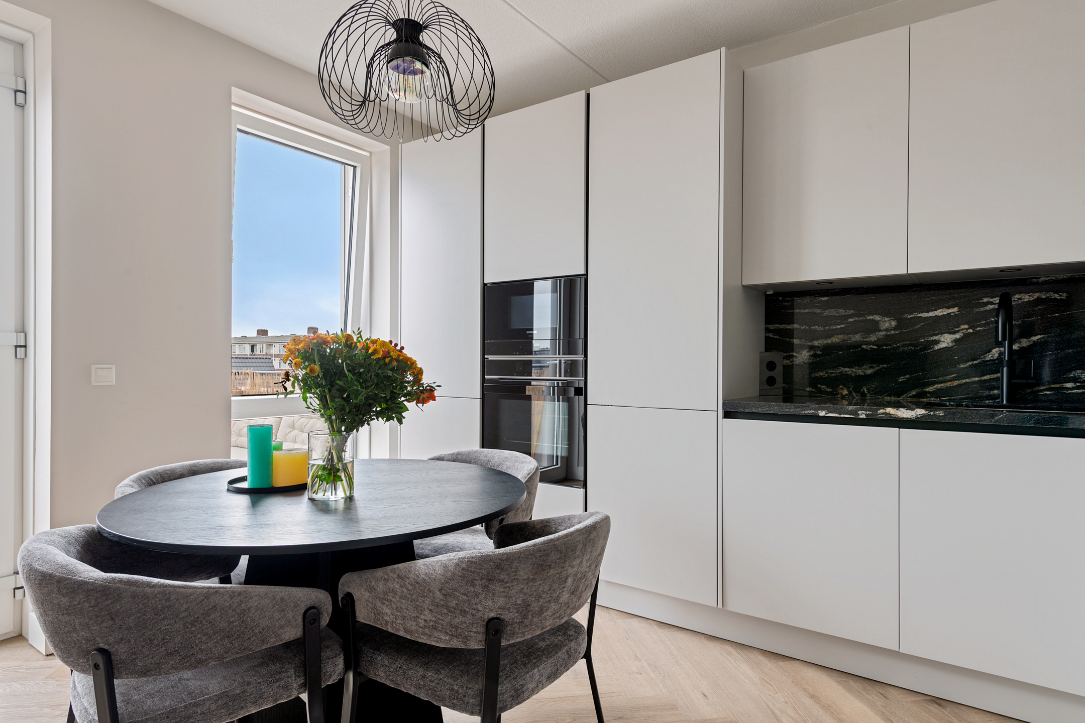 De royale woonkamer heeft kamerhoge raampartijen die zorgen voor een overvloed aan natuurlijk licht. De luxe visgraatvloer draagt bij aan de warme uitstraling en loopt drempelloos door in de rest van het appartement. De open keuken in L-opstelling is strak en compleet, met moderne inbouwapparatuur zoals een inductiekookplaat, koel-vriescombinatie, oven en vaatwasser.