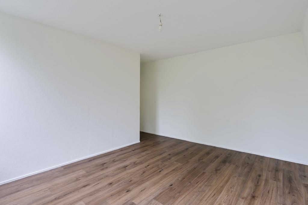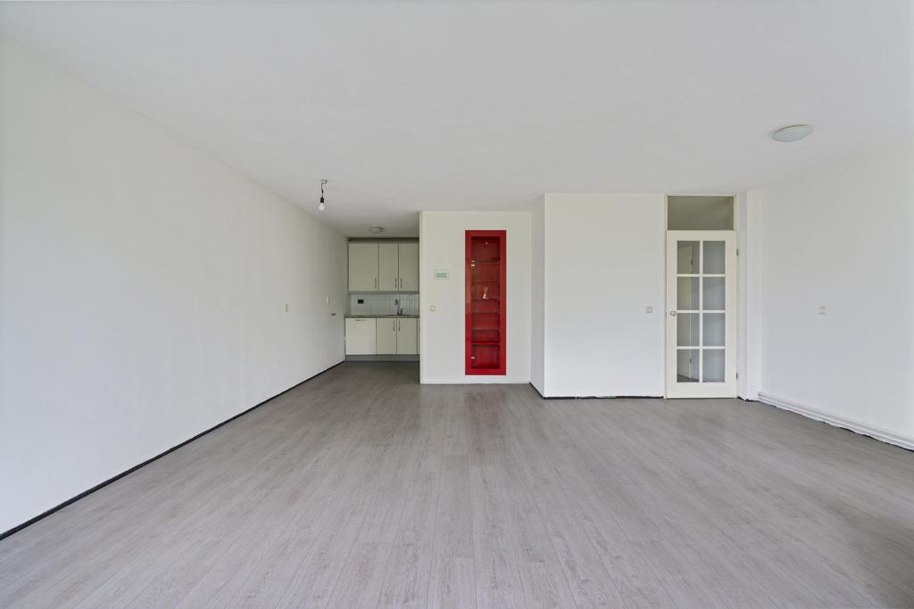 Woonkamer aan de achterzijde met laminaatvloer, open keuken met oven en koel-/vriescombinatie.