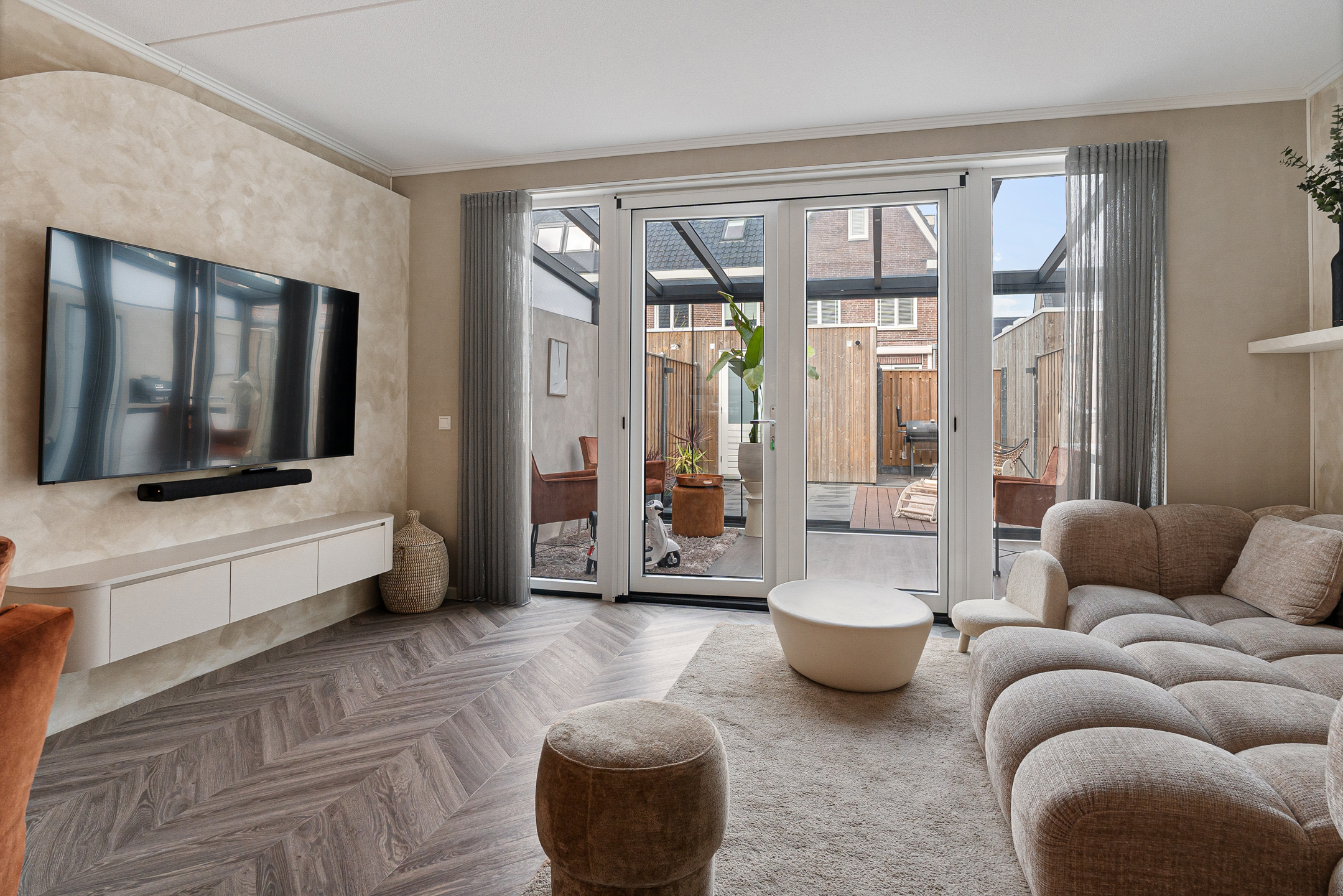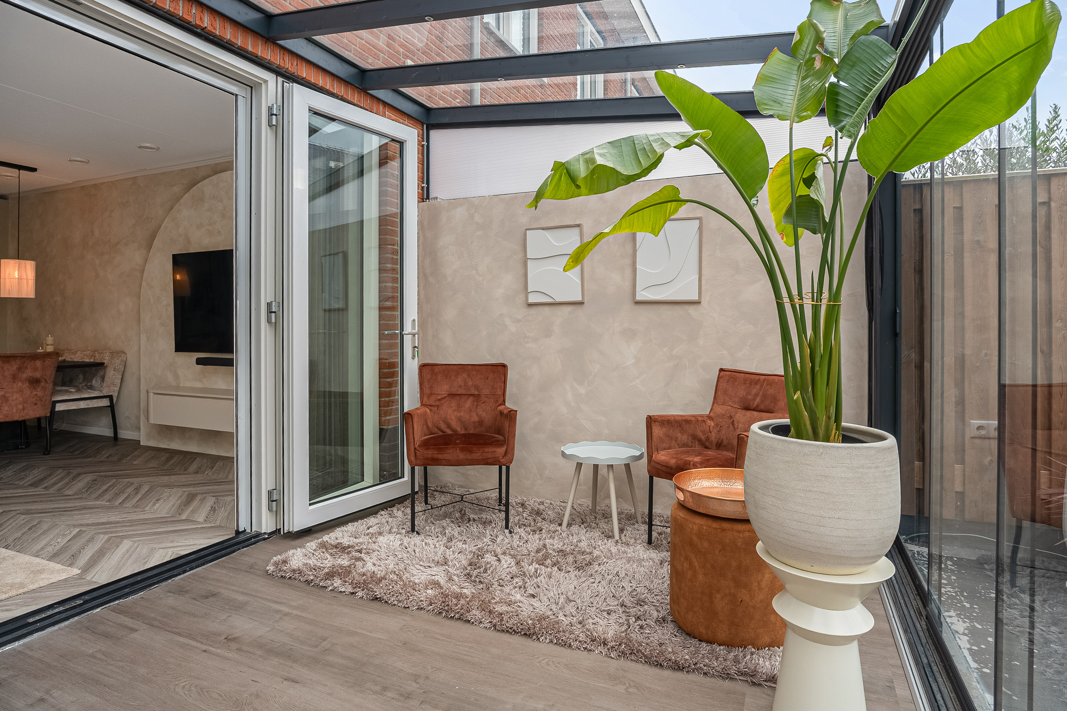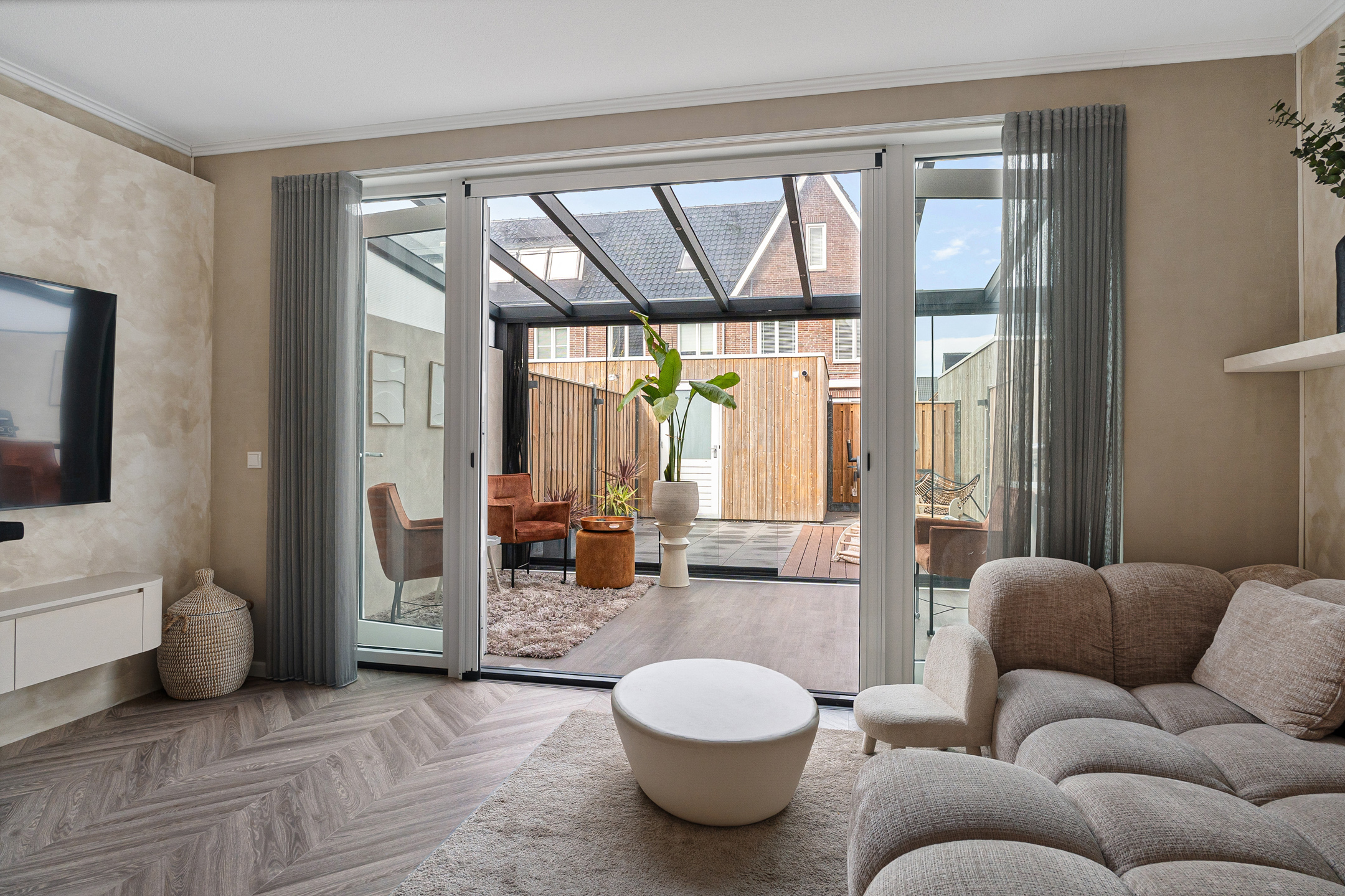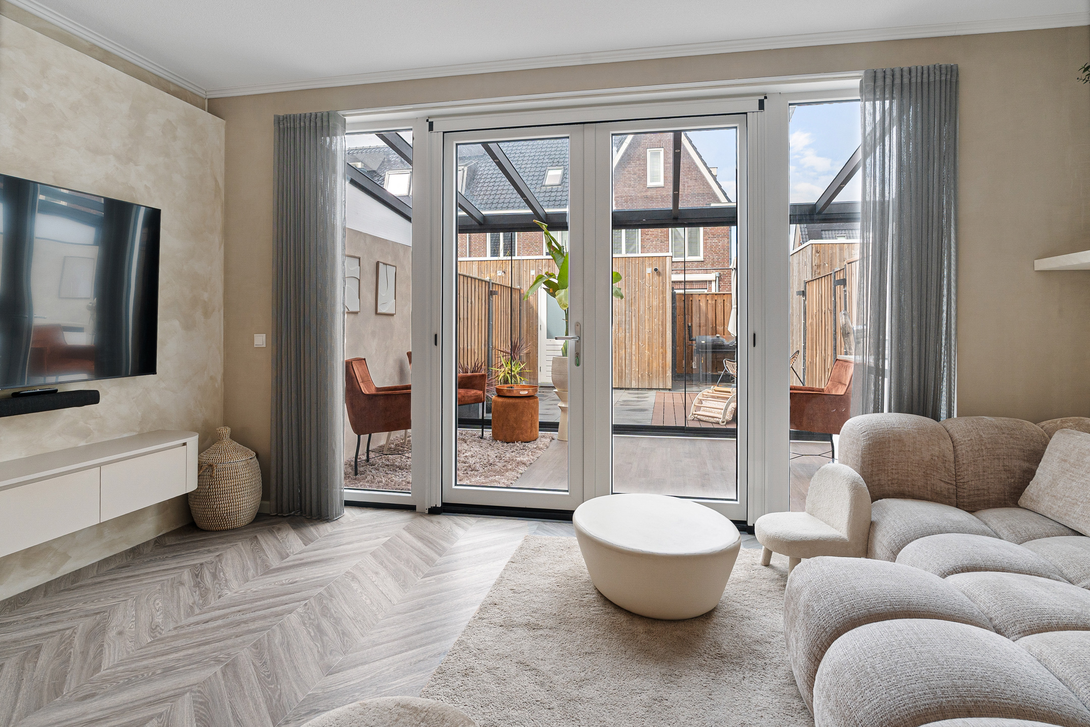 Via deze voortuin bereik je de entree van de woning. Je komt binnen in de hal met toegang tot het toilet, de trapopgang en de woonkamer. De woonkamer is tuingericht en valt direct op door de fraaie visgraatvloer en de strakke afwerking. Aan de achterzijde bevindt zich de glazen uitbouw, die zorgt voor veel lichtinval en een prettige extra leefruimte. Hier richt je eenvoudig een fijne lounge- of eetplek in.