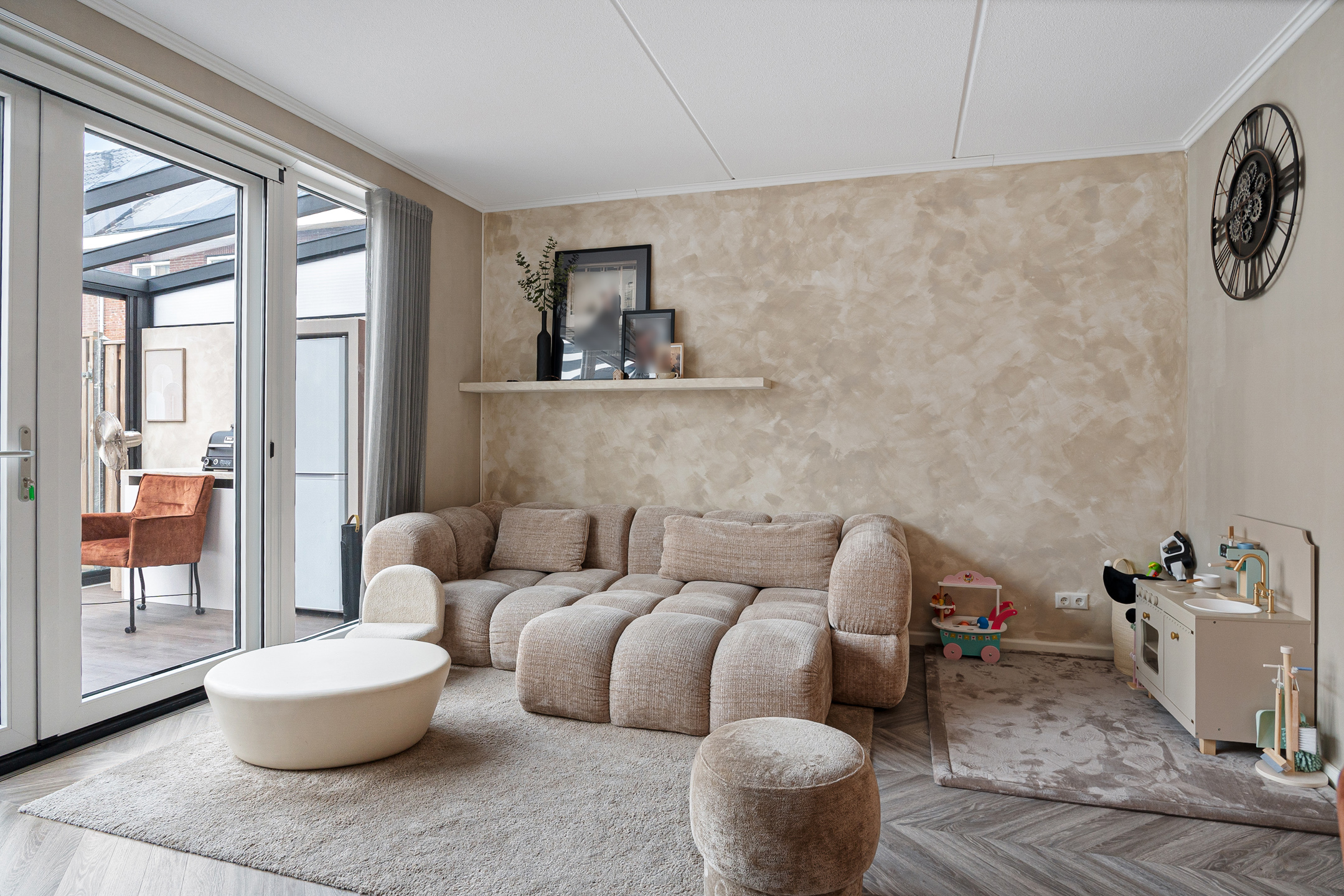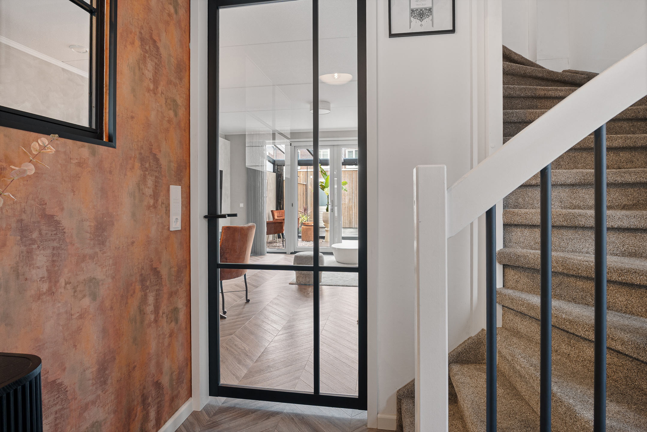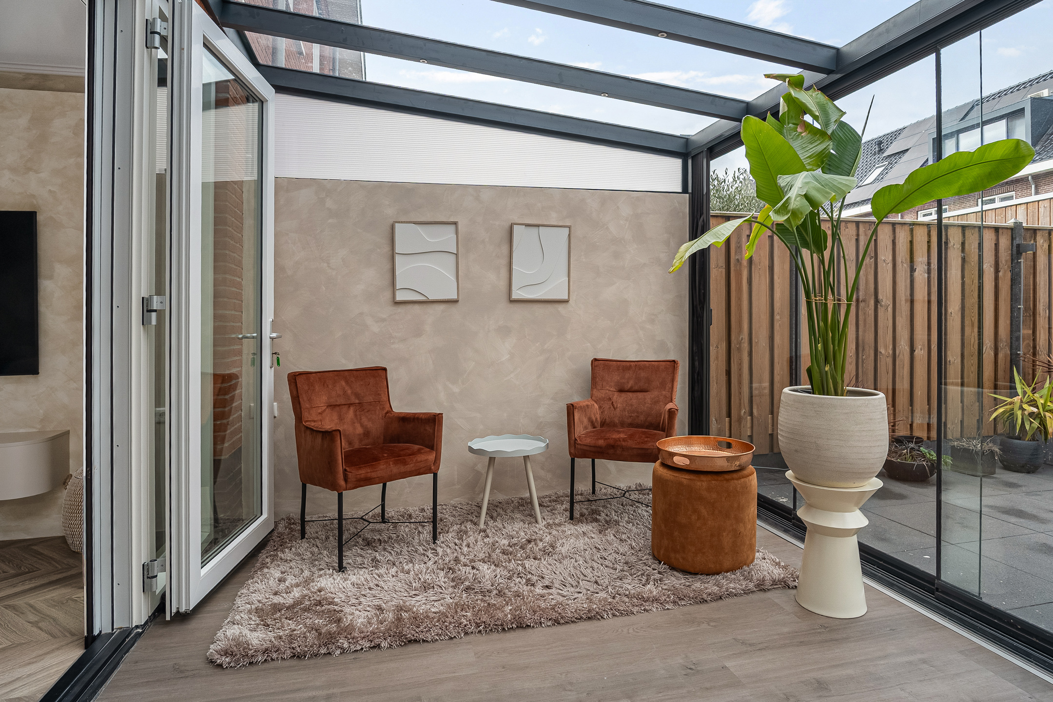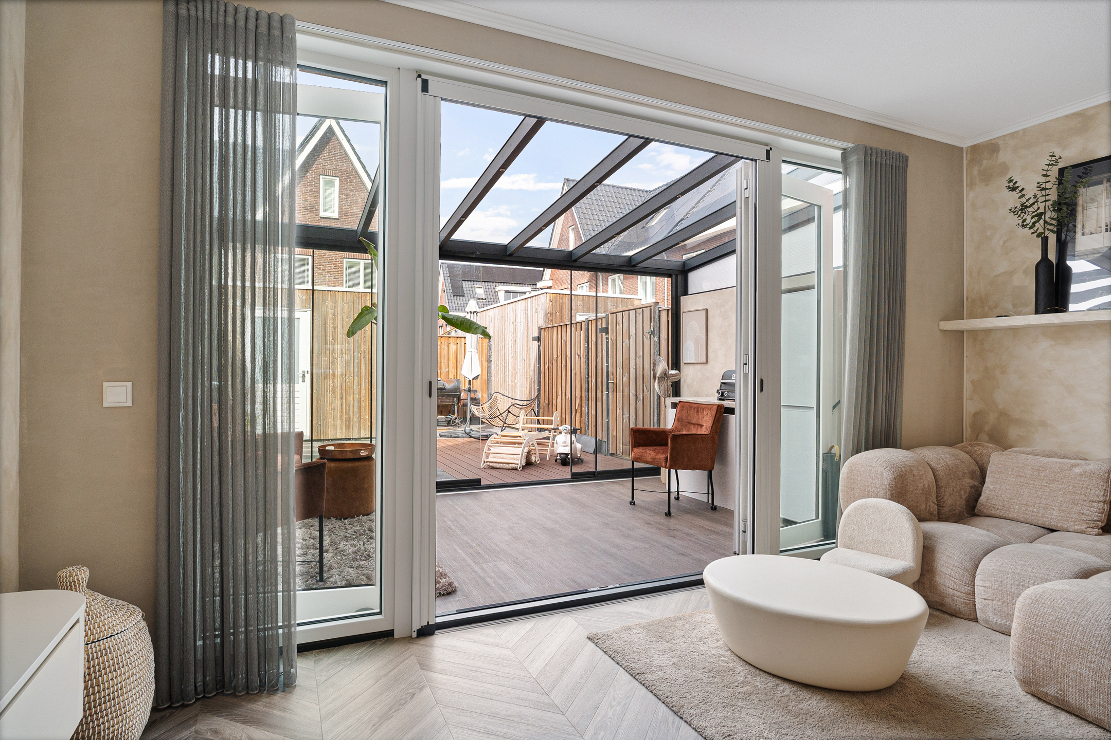 Via deze voortuin bereik je de entree van de woning. Je komt binnen in de hal met toegang tot het toilet, de trapopgang en de woonkamer. De woonkamer is tuingericht en valt direct op door de fraaie visgraatvloer en de strakke afwerking. Aan de achterzijde bevindt zich de glazen uitbouw, die zorgt voor veel lichtinval en een prettige extra leefruimte. Hier richt je eenvoudig een fijne lounge- of eetplek in.