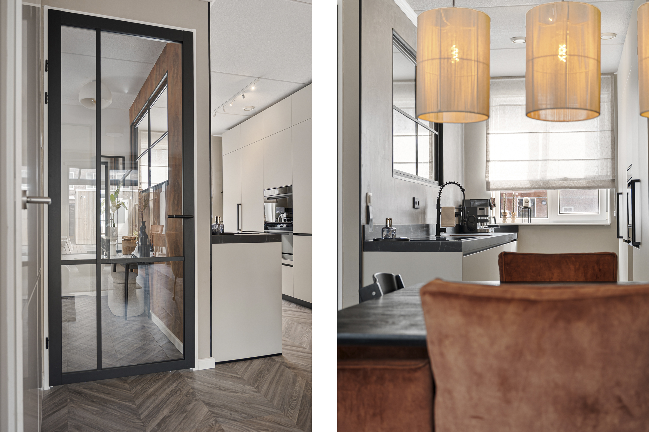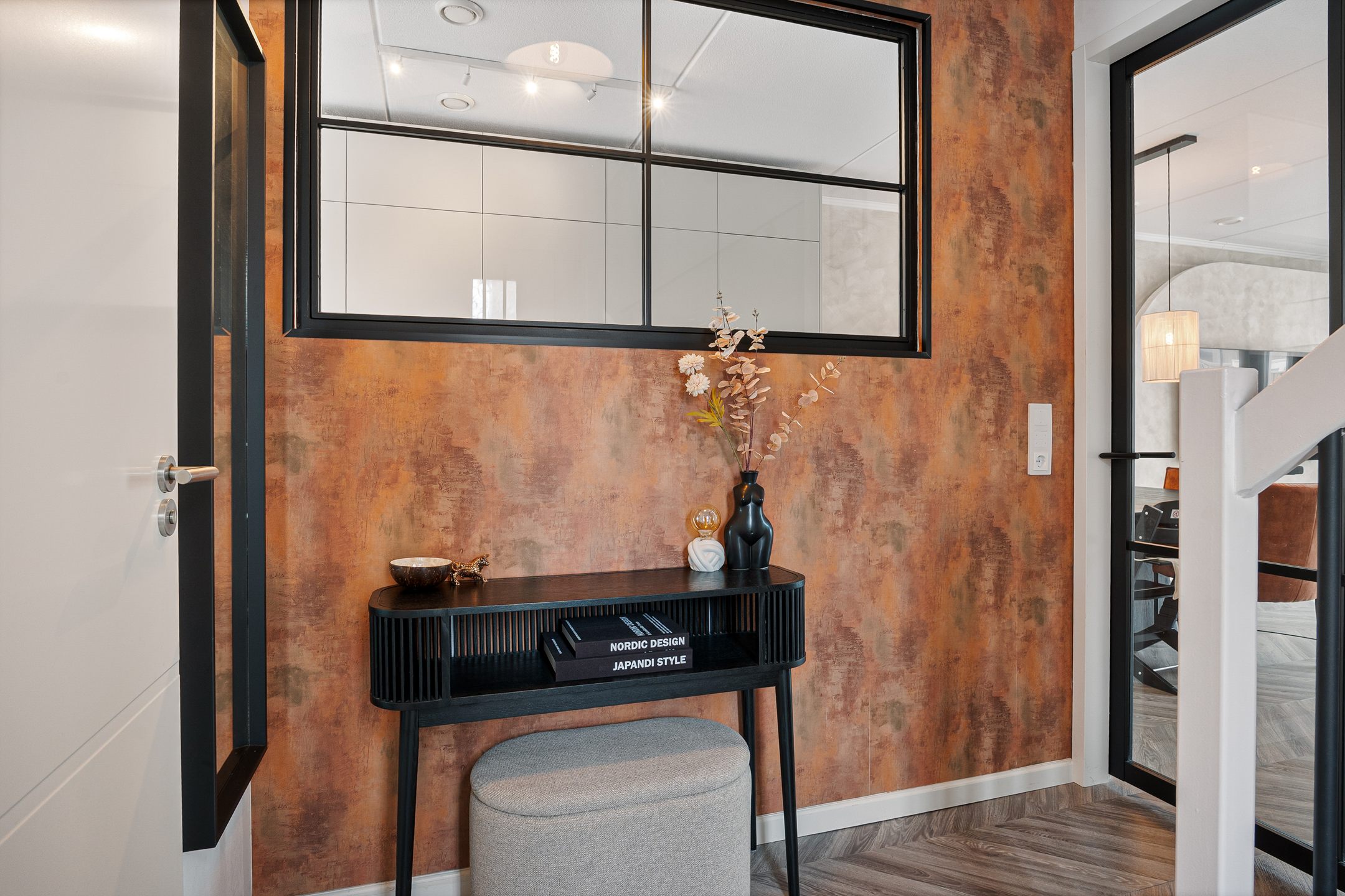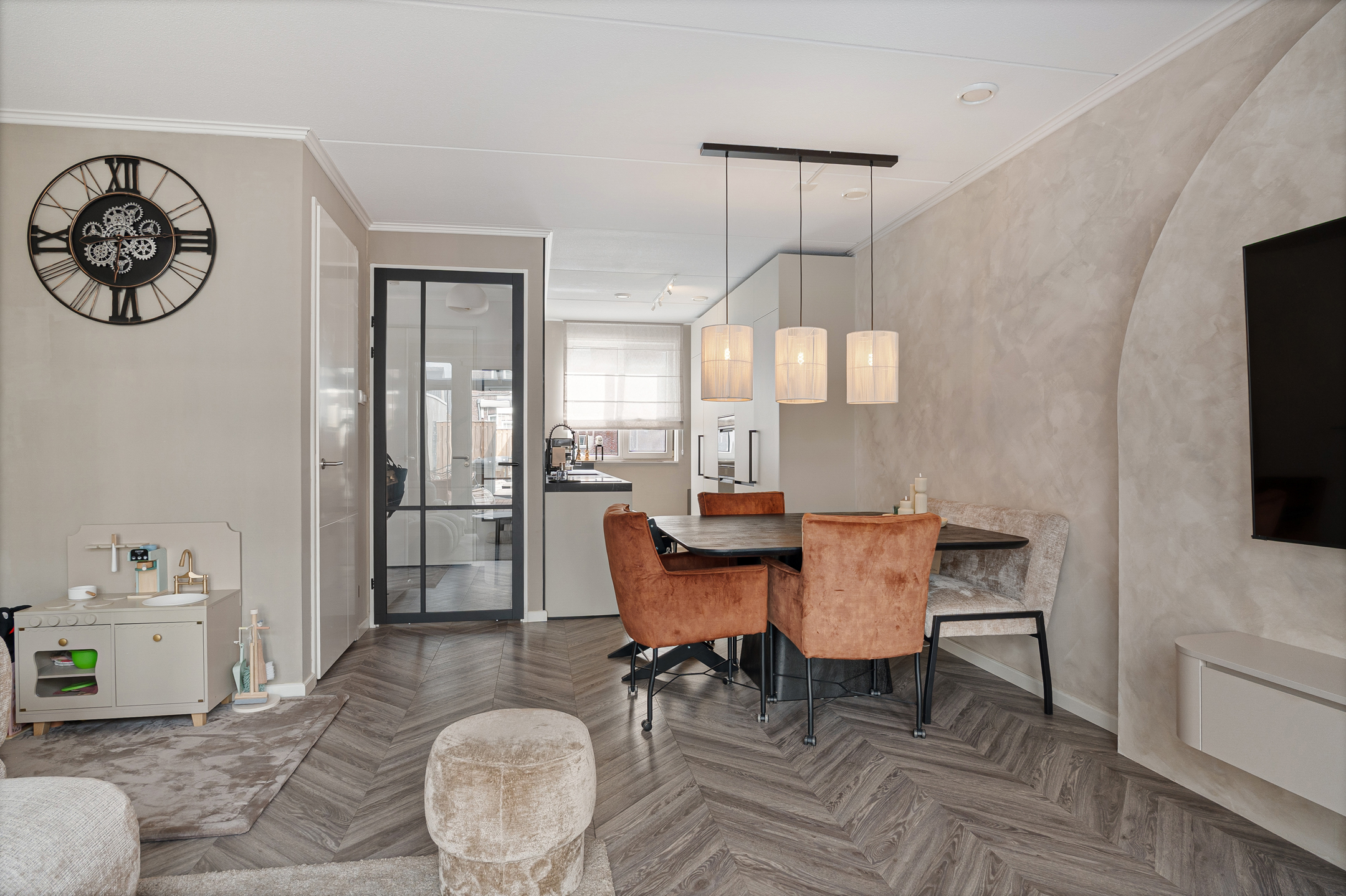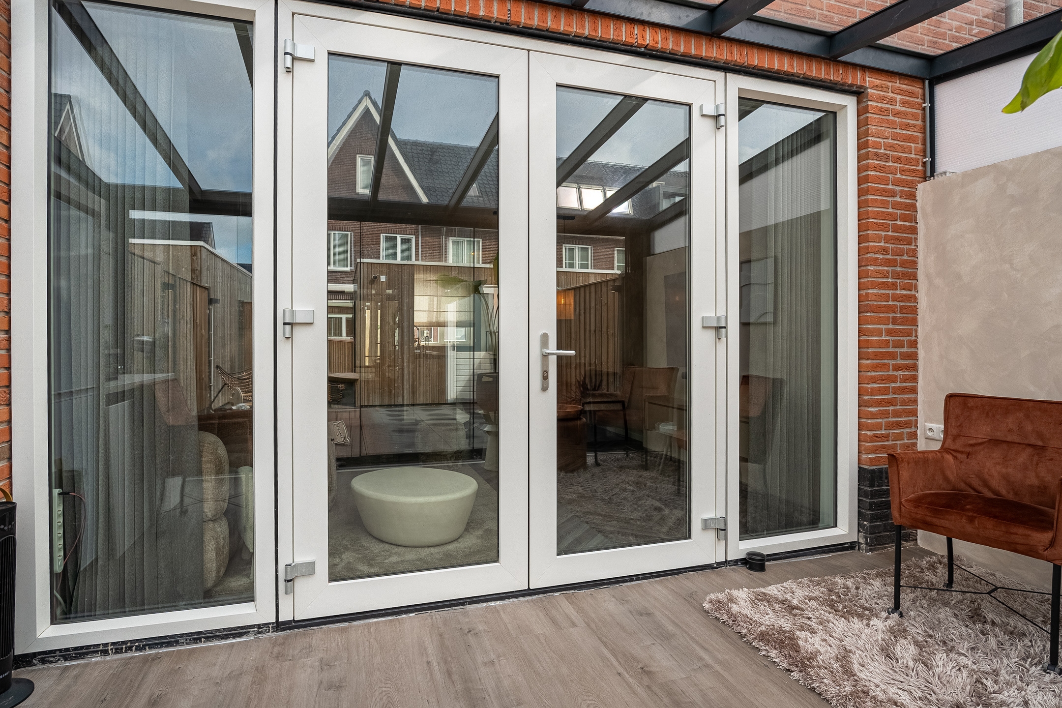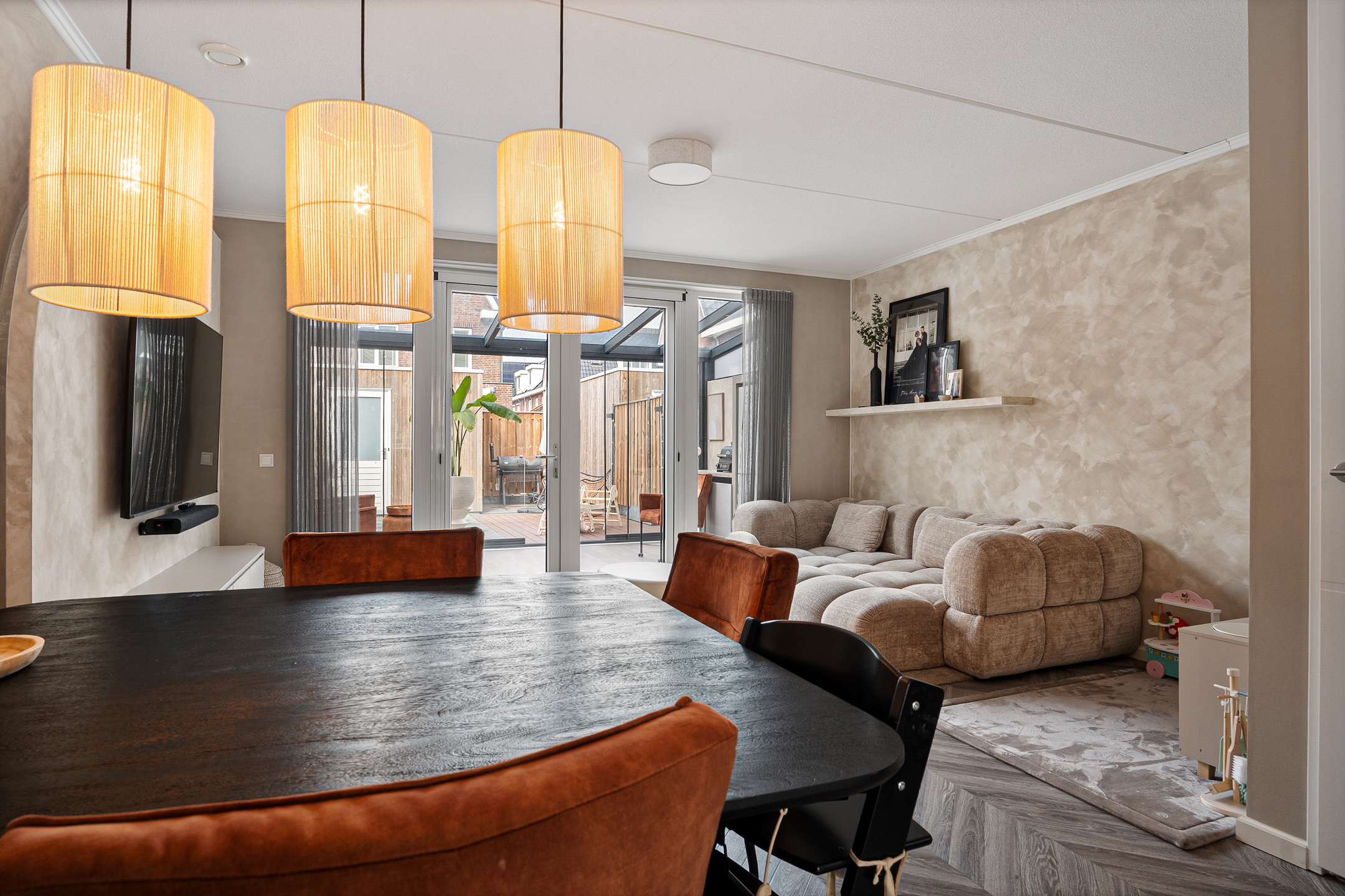 Via deze voortuin bereik je de entree van de woning. Je komt binnen in de hal met toegang tot het toilet, de trapopgang en de woonkamer. De woonkamer is tuingericht en valt direct op door de fraaie visgraatvloer en de strakke afwerking. Aan de achterzijde bevindt zich de glazen uitbouw, die zorgt voor veel lichtinval en een prettige extra leefruimte. Hier richt je eenvoudig een fijne lounge- of eetplek in.
