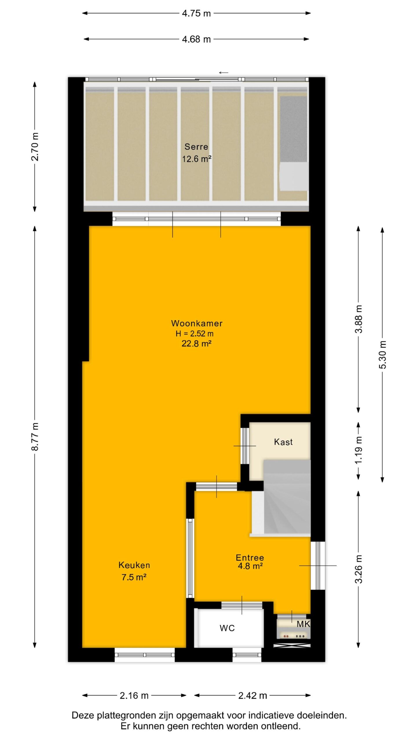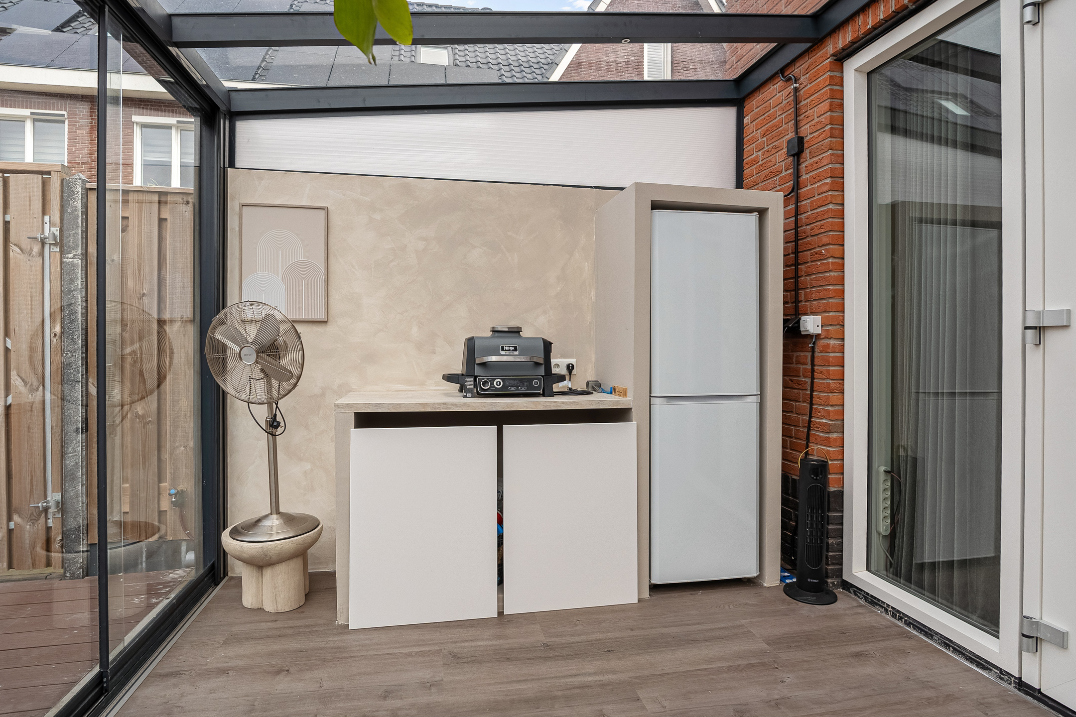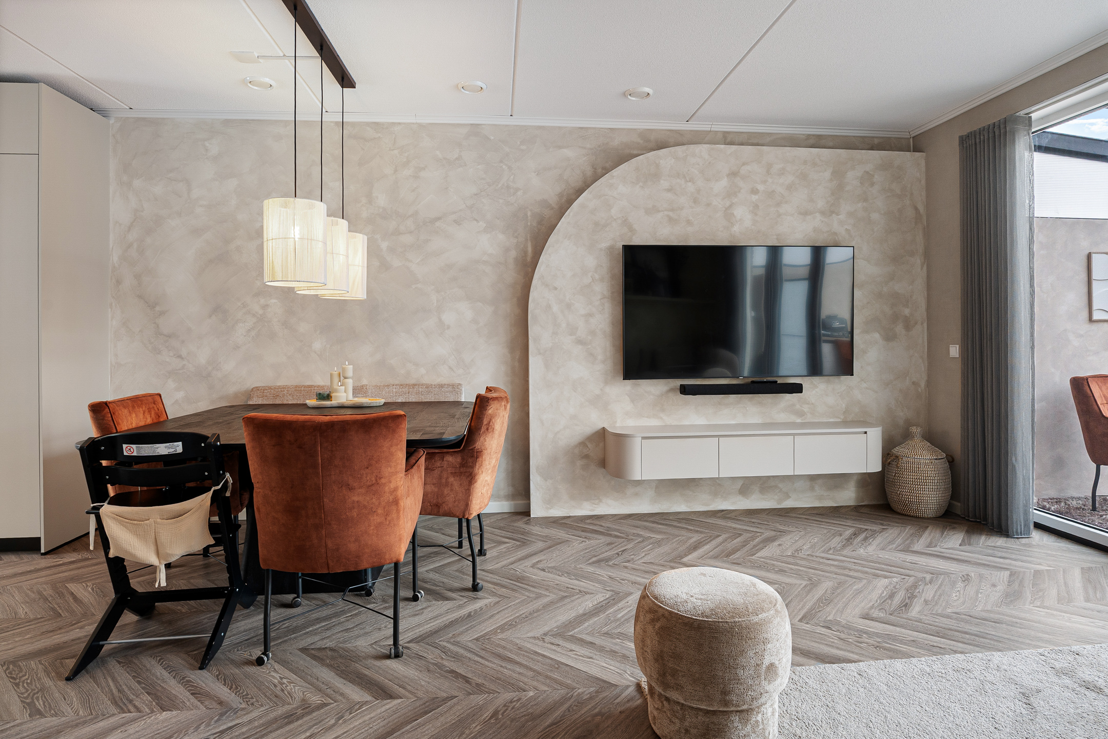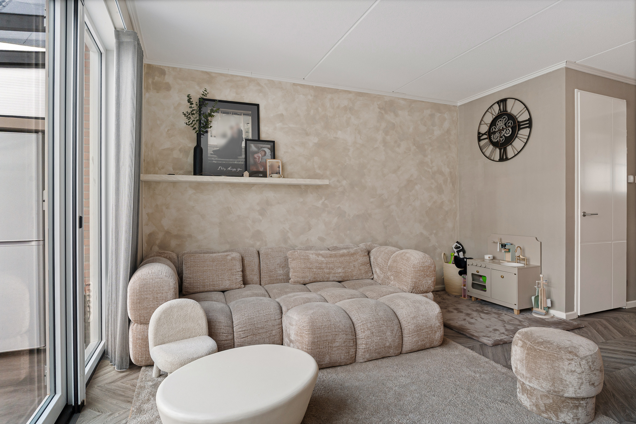Via deze voortuin bereik je de entree van de woning. Je komt binnen in de hal met toegang tot het toilet, de trapopgang en de woonkamer. De woonkamer is tuingericht en valt direct op door de fraaie visgraatvloer en de strakke afwerking. Aan de achterzijde bevindt zich de glazen uitbouw, die zorgt voor veel lichtinval en een prettige extra leefruimte. Hier richt je eenvoudig een fijne lounge- of eetplek in.