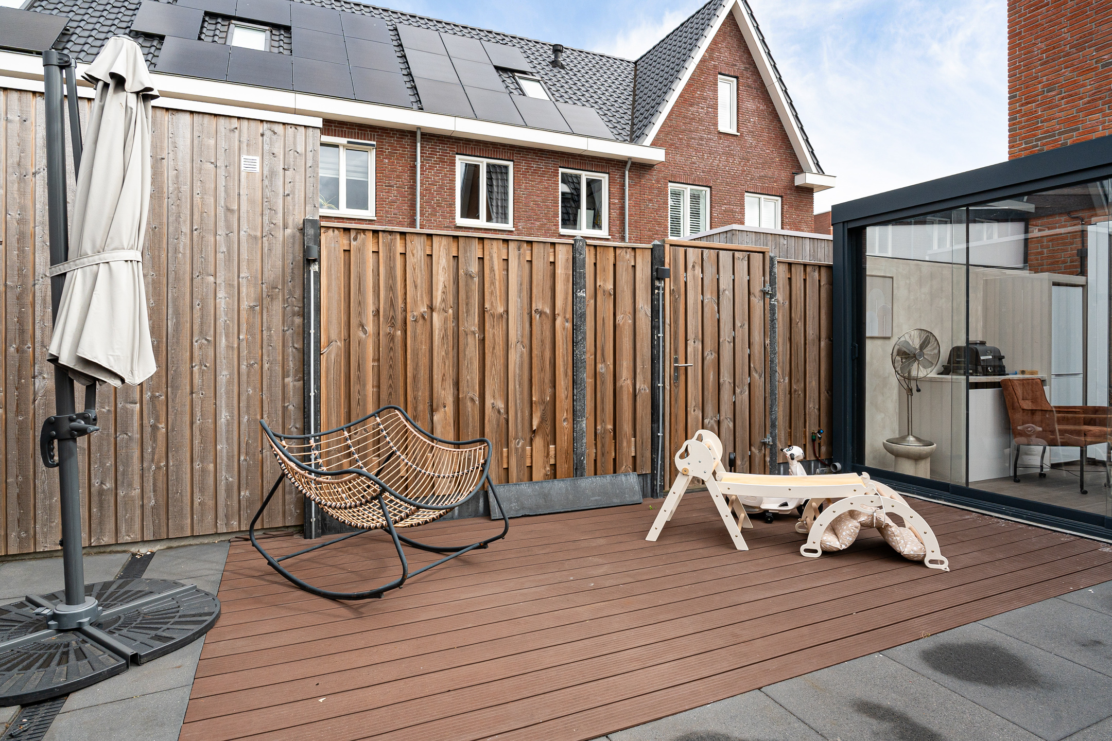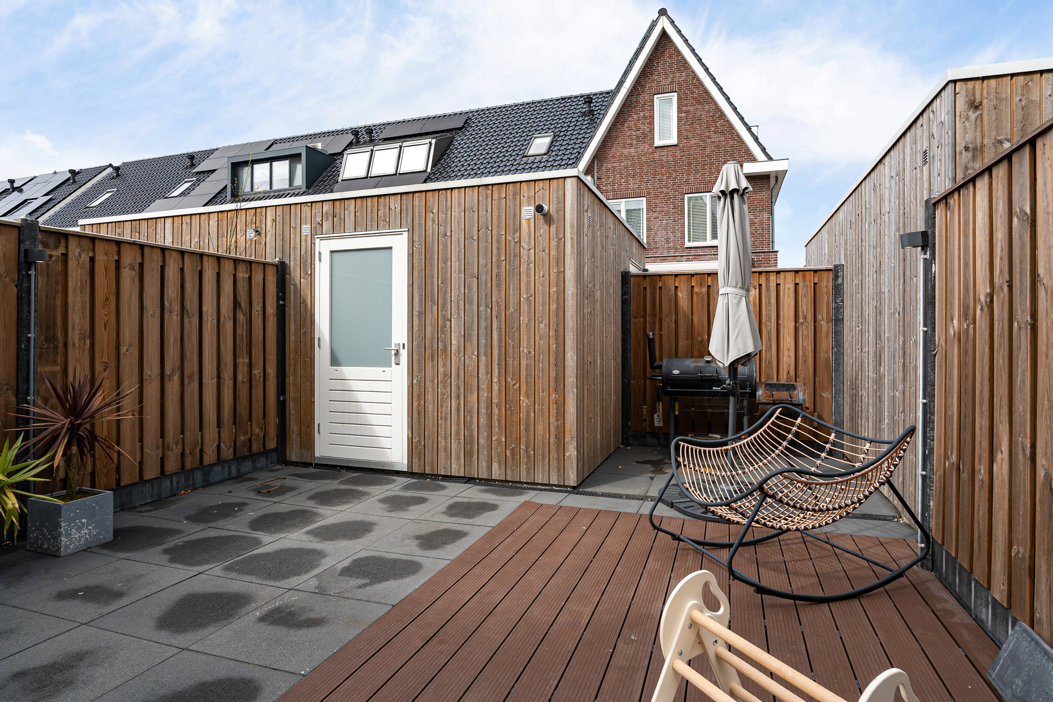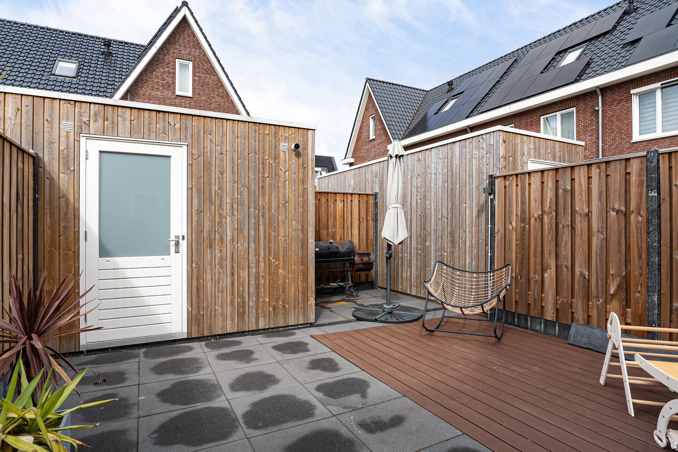 De achtertuin is onderhoudsvriendelijk aangelegd met een combinatie van tegels en een houten vlonder. Achterin vind je een berging en voldoende ruimte om lekker buiten te zitten en te genieten van het buitenleven.