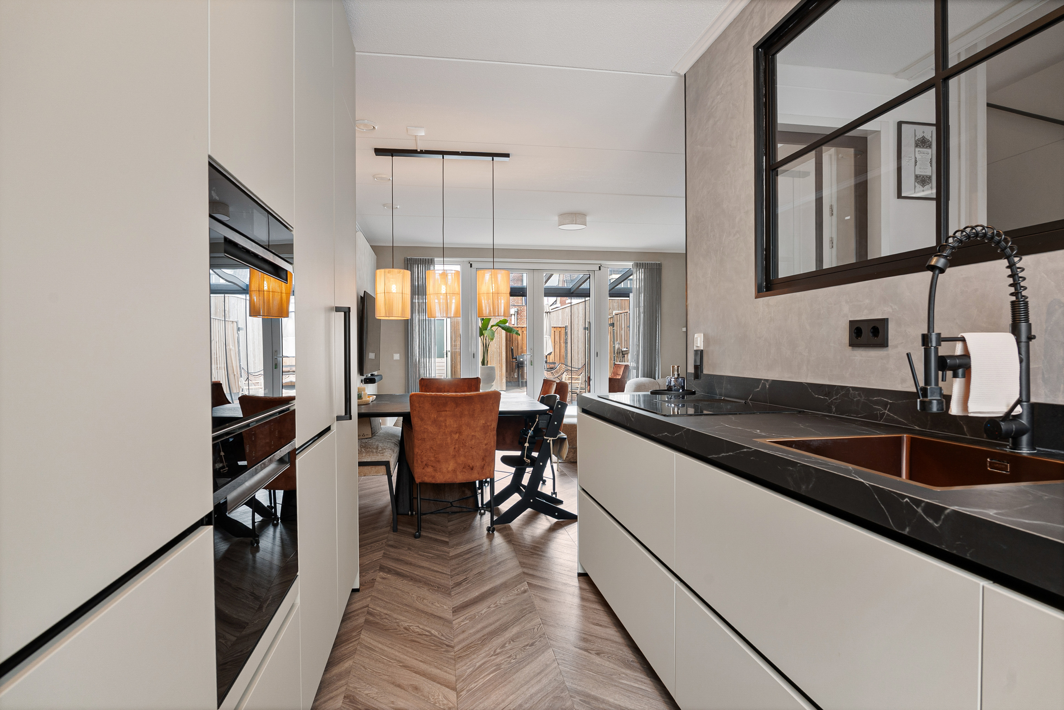 De moderne keuken ligt aan de voorzijde en is voorzien van diverse inbouwapparatuur en een strak werkblad.