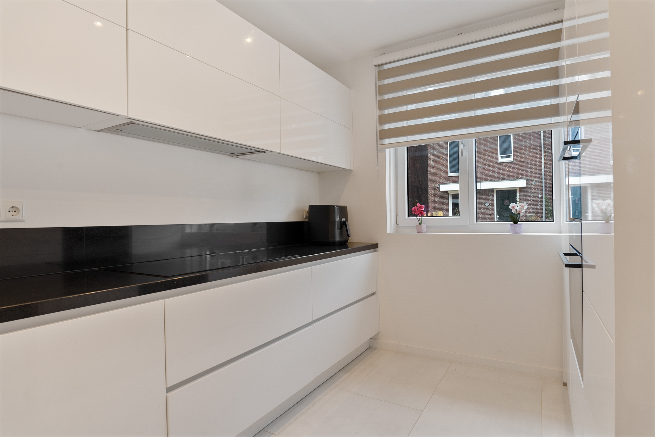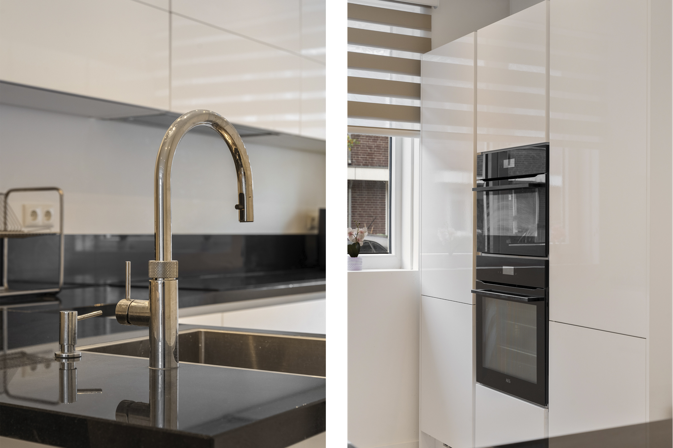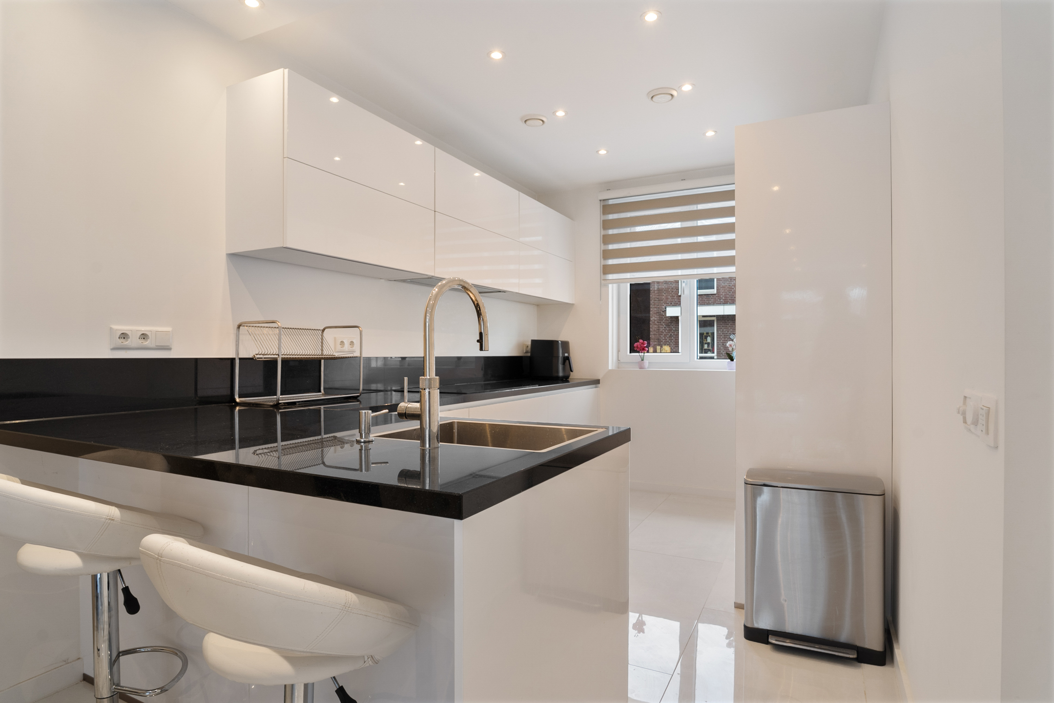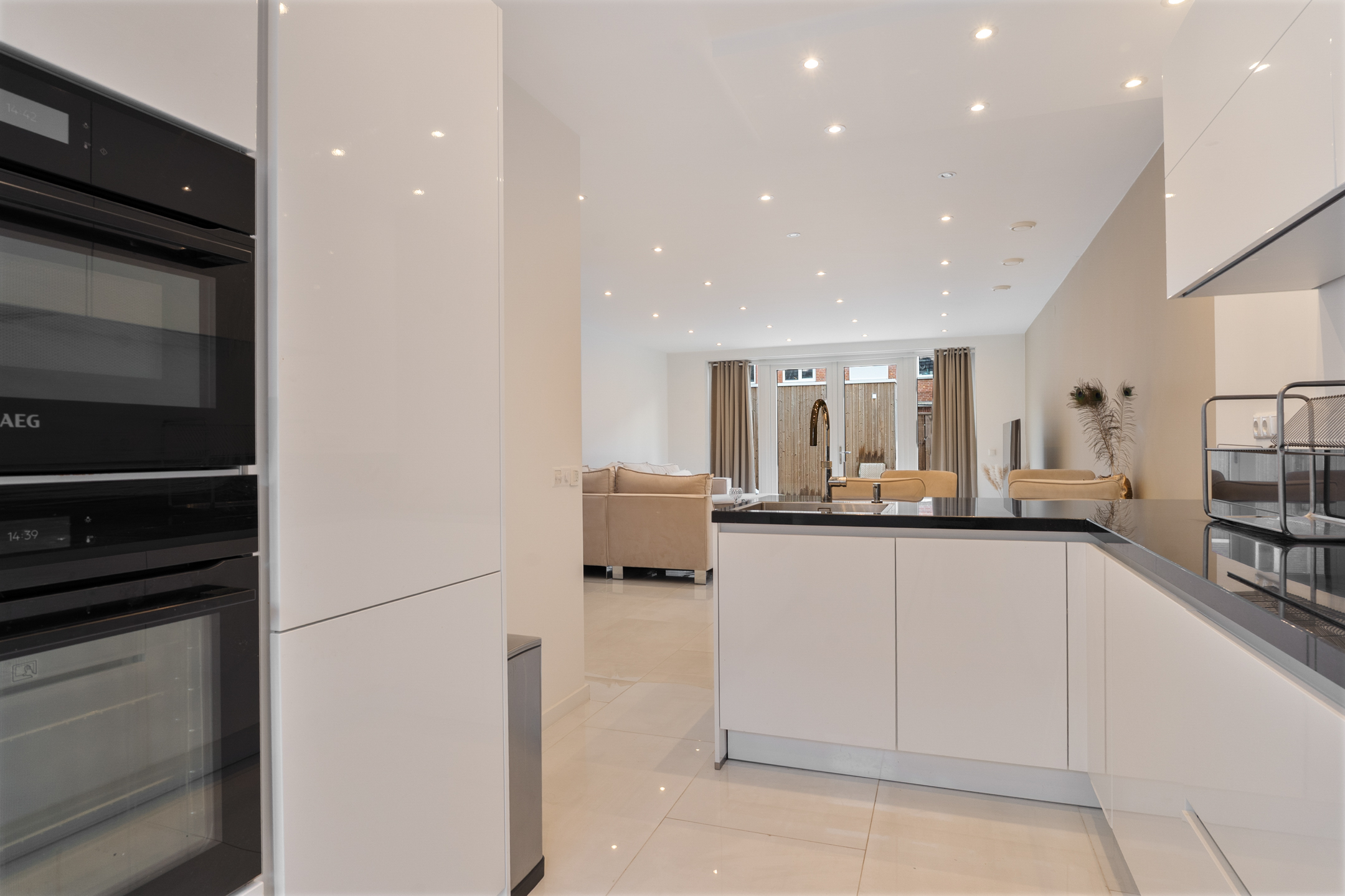 Aan de voorzijde bevindt zich de moderne keuken in L-opstelling met bar. Deze is volledig uitgerust met hoogwaardige inbouwapparatuur, zoals een inductiekookplaat, koelkast, vriezer, vaatwasser, combi-oven, oven en een stijlvolle wastafel met cooker.