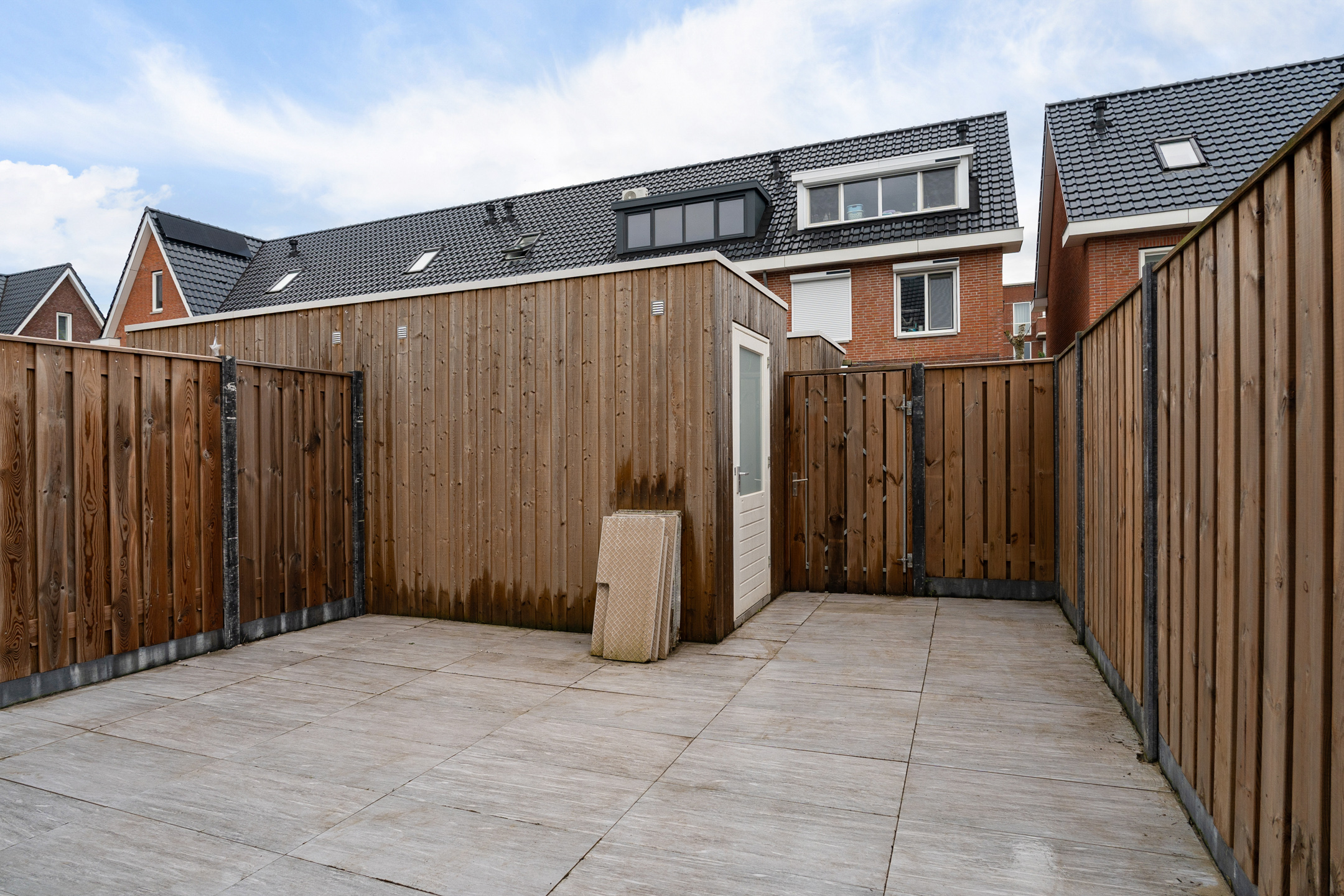 Vanuit de woonkamer bereik je via de openslaande deuren de onderhoudsarme tuin, die op het zuidoosten ligt en volledig is betegeld. Daarnaast is er een praktische schuur aanwezig voor opslag en biedt de tuin een handige achterom, zodat je ook via de achterzijde toegang hebt.