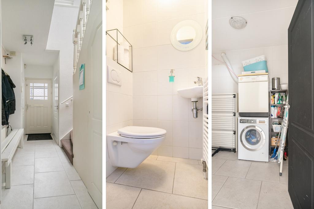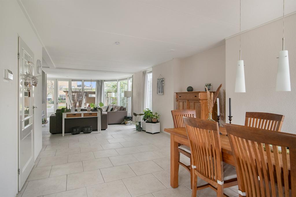 Aan de voorzijde van de woning is er een carport waardoor je altijd voor de deur kunt parkeren. In de hal bevindt zich een toilet, inpandige kastruimte, de trap en meterkast. De hal komt uit in de riante leefruimte voorzien van vloerverwarming en radiatoren. Er is veel natuurlijk licht door de woningbrede raampartij. Vanuit de woonkamer is er toegang tot de bijkeuken, van daaruit is er een doorloop naar de berging en de garage.