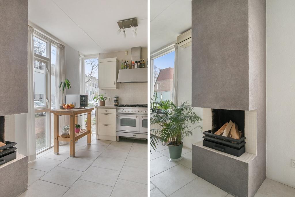 Zowel de woonkamer als de eetkamer beschikken over een open haard. De open keuken beschikt over een gasfornuis en heeft redelijk veel bergruimte voor alle benodigdheden.