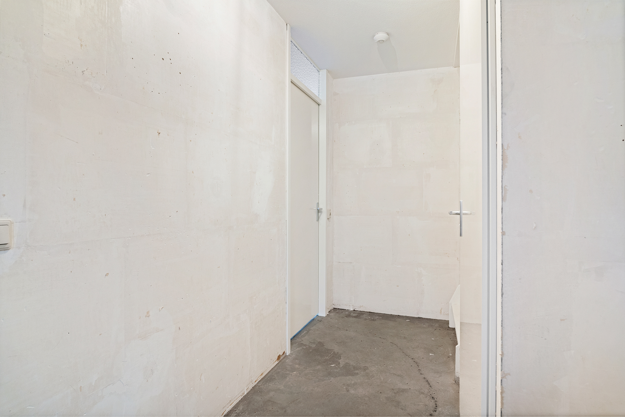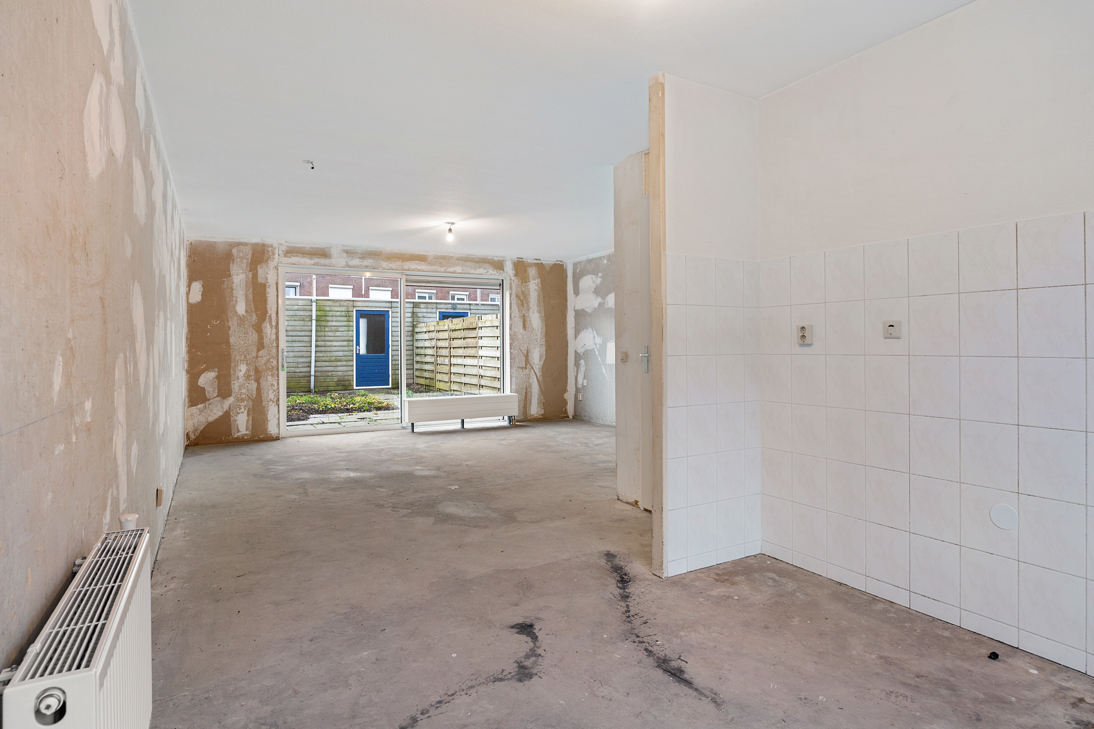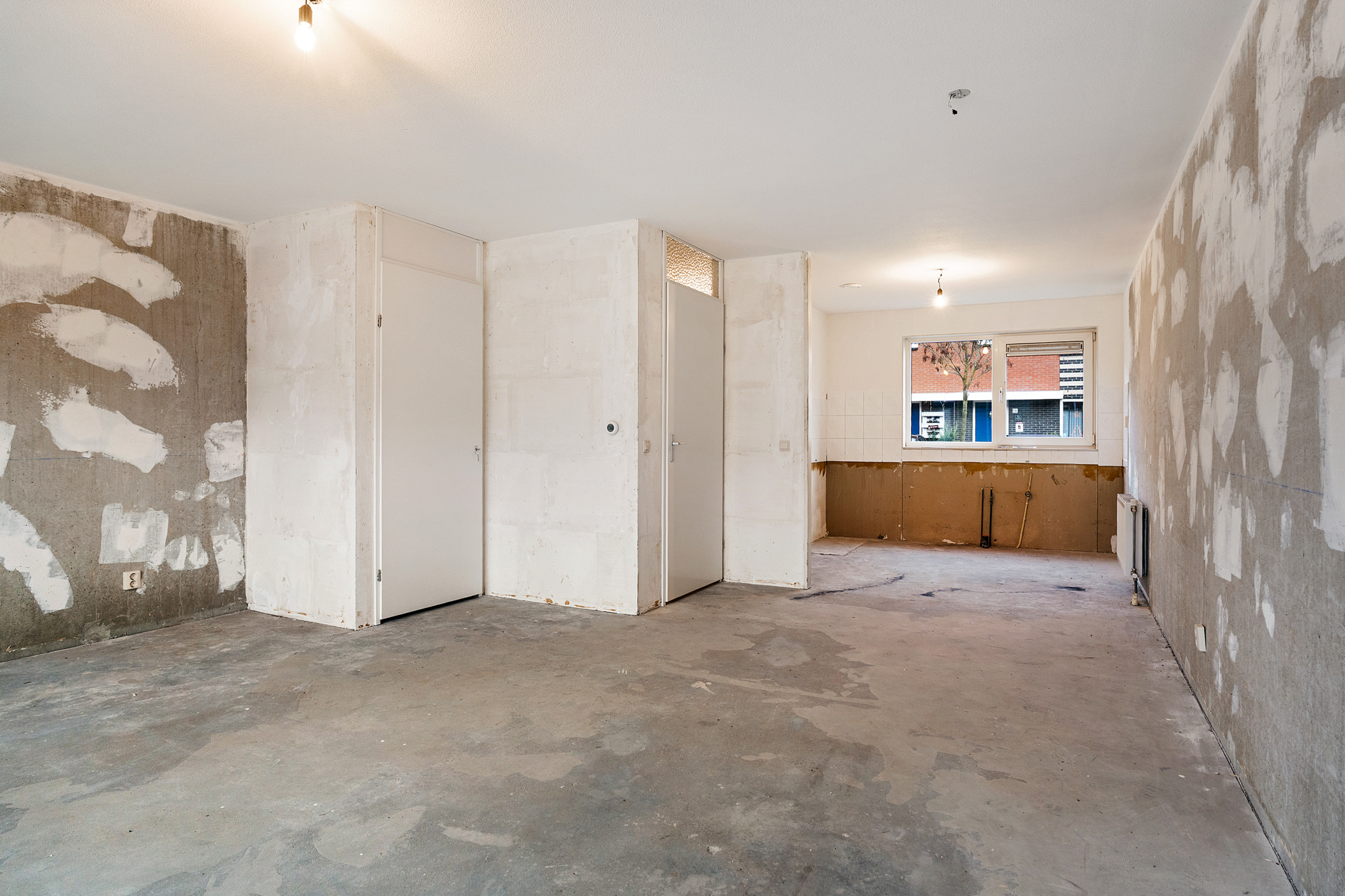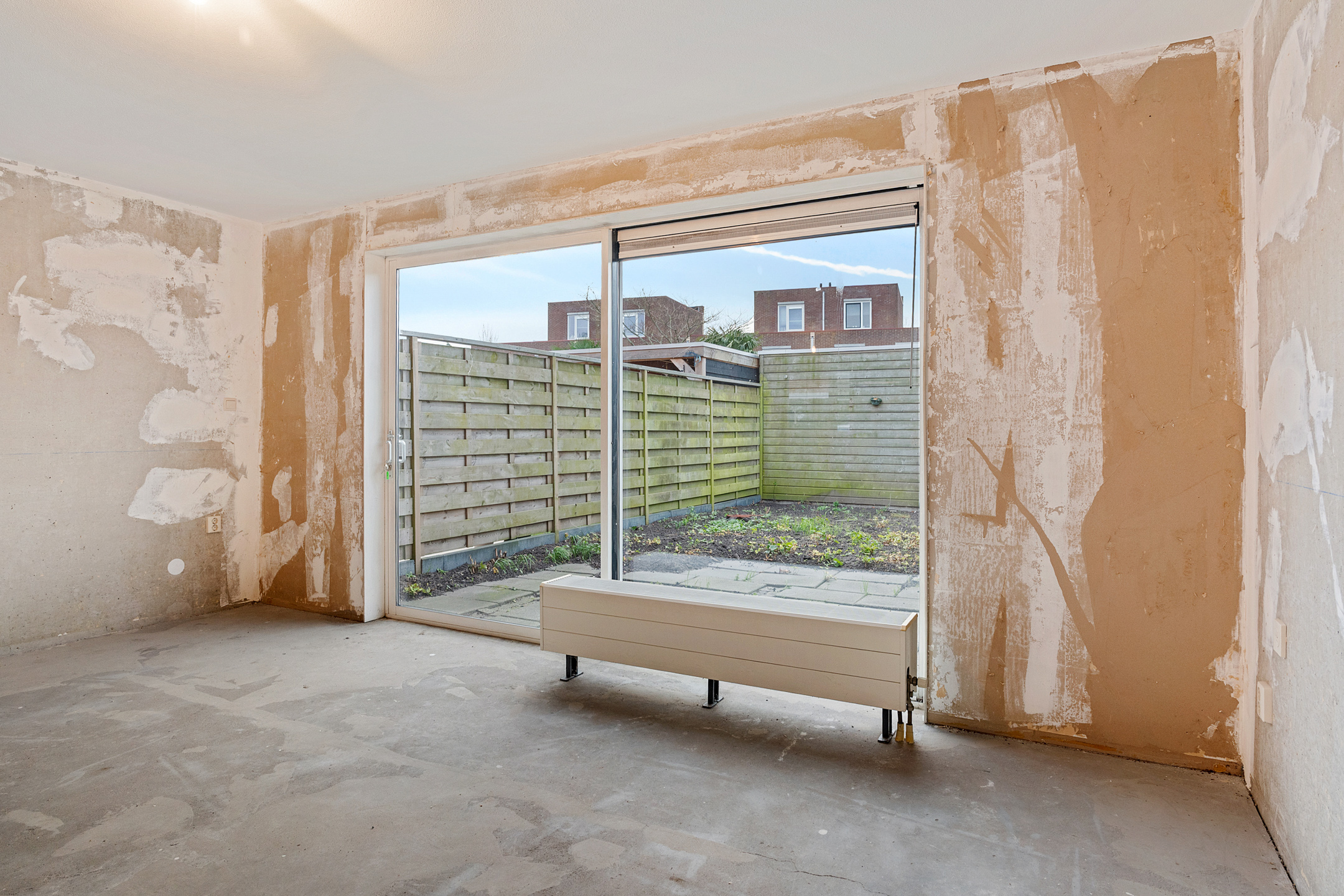 Via de entree betreed je de hal met meterkast en een separaat toilet met fonteintje. De woonkamer is heerlijk licht dankzij de grote schuifpui aan de achterzijde en het extra zijraam, wat de hoekligging extra benadrukt. De rechthoekige indeling zorgt voor volop mogelijkheden om een comfortabele zit- en eetruimte te creëren. Aan de voorzijde van de woning bevindt zich de ruimte voor de keuken; er is momenteel geen keuken aanwezig, waardoor je alle vrijheid hebt om hier een keuken geheel naar eigen smaak en wensen te realiseren. De begane grond is casco opgeleverd en vormt daarmee een blanco basis voor het creëren van jouw ideale woonomgeving.