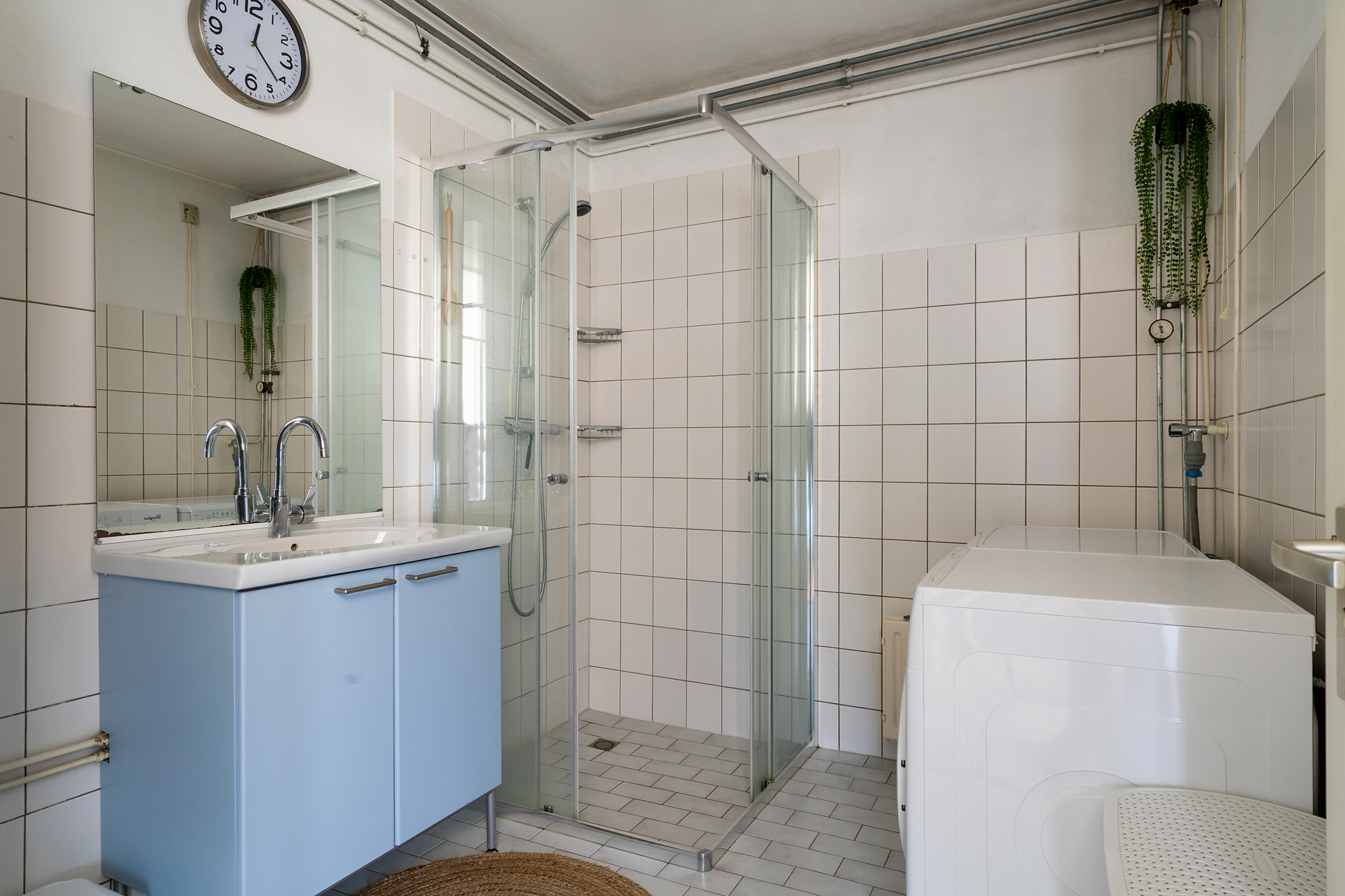 De nette badkamer is praktisch ingericht met een douche, een wastafelmeubel en aansluiting voor de wasmachine.