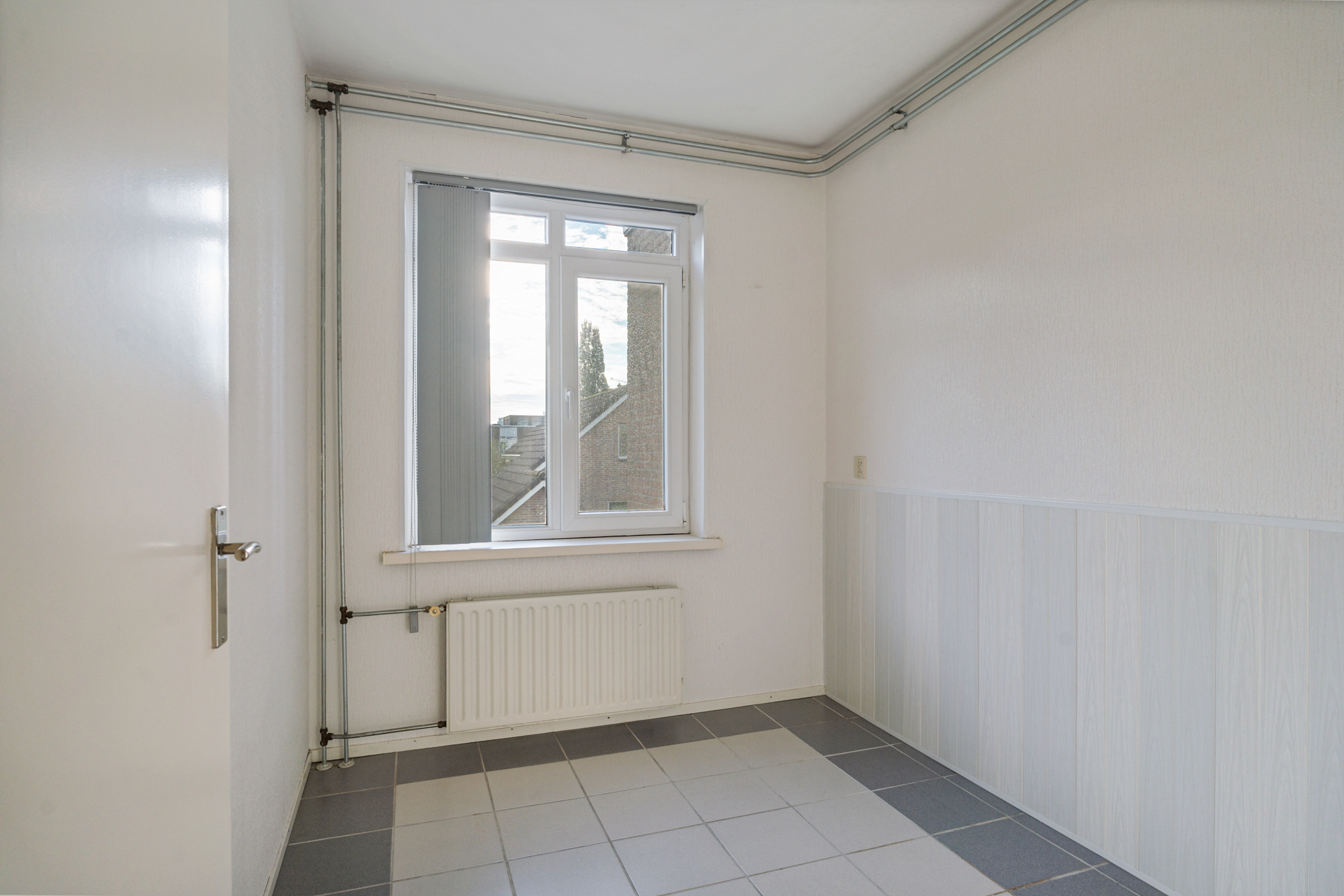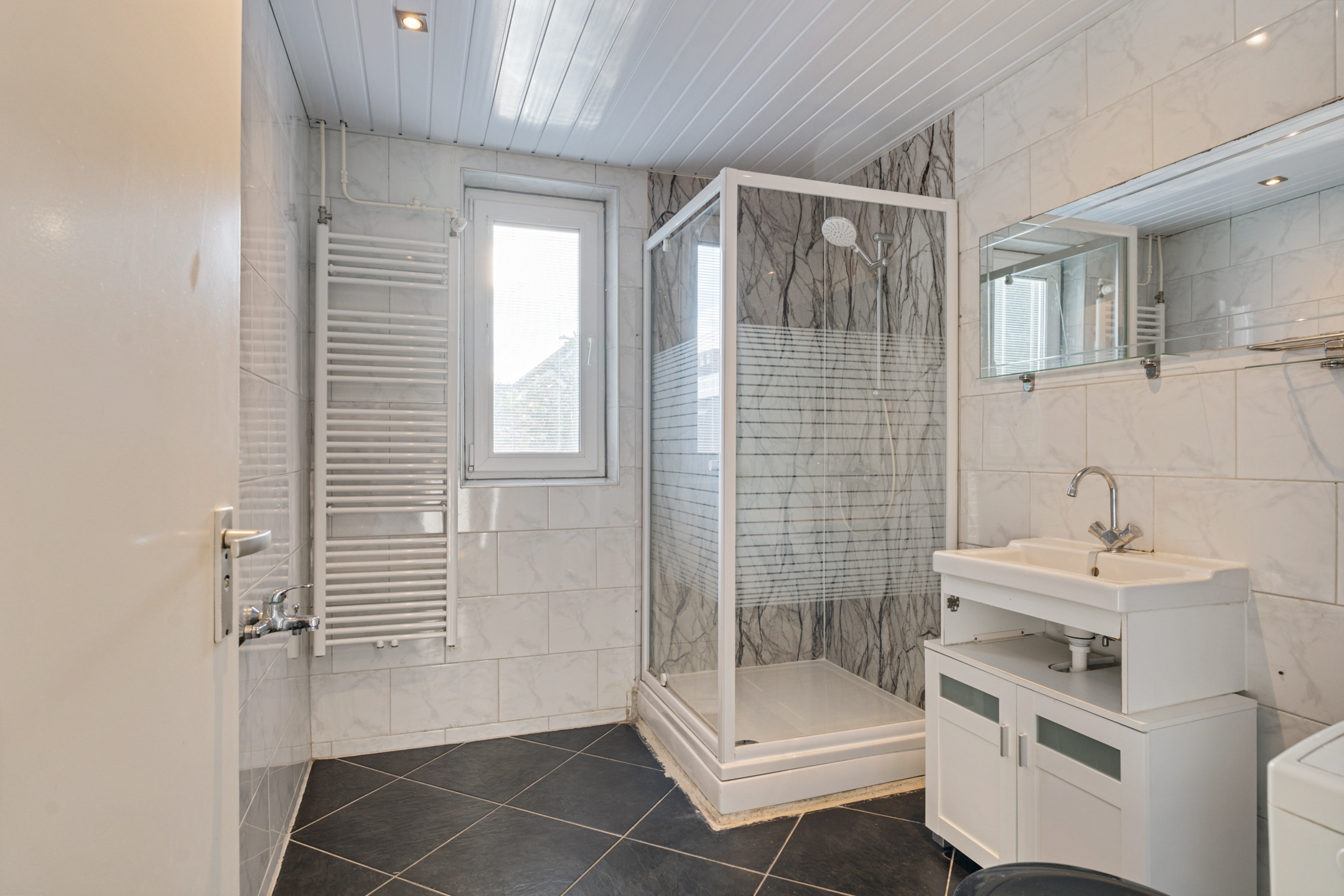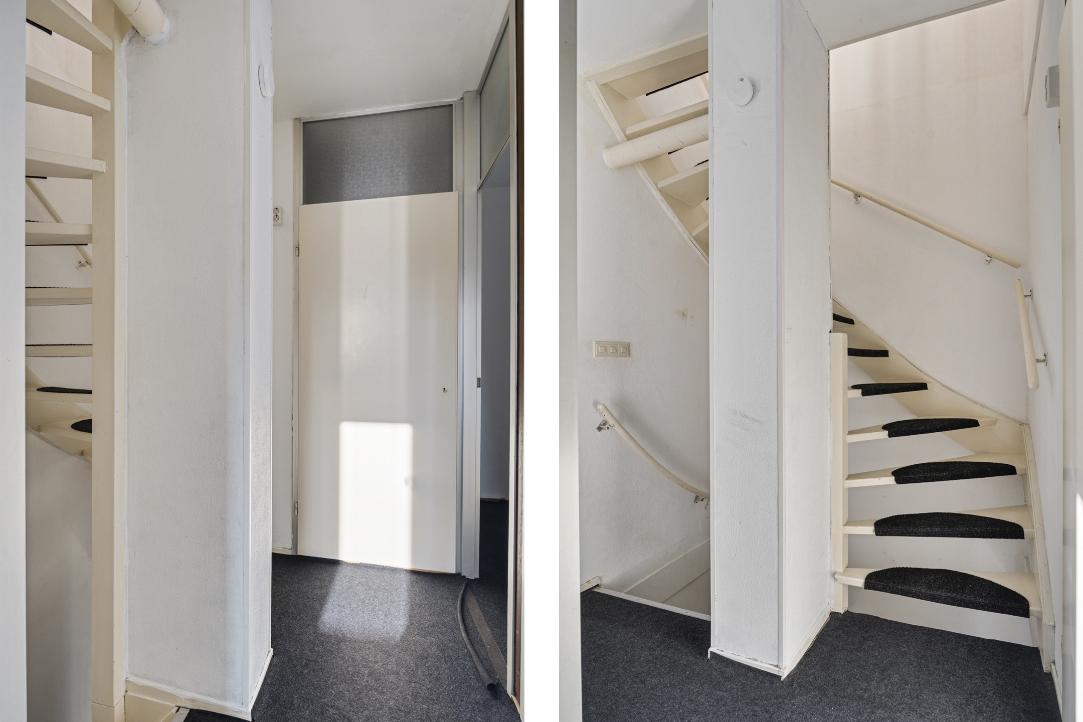 Op deze verdieping zijn twee ruime slaapkamers aanwezig. De hoofdslaapkamer is gelegen aan de achterzijde en biedt voldoende ruimte voor een groot bed en een kastenwand. Aan de voorzijde bevindt zich een tweede, eveneens goed formaat slaapkamer. De volledig betegelde badkamer beschikt over een douchecabine, wastafelmeubel, radiator, toilet en een raam voor natuurlijke ventilatie. Daarnaast is er een handige inpandige berging aanwezig, ideaal voor het opbergen van spullen.