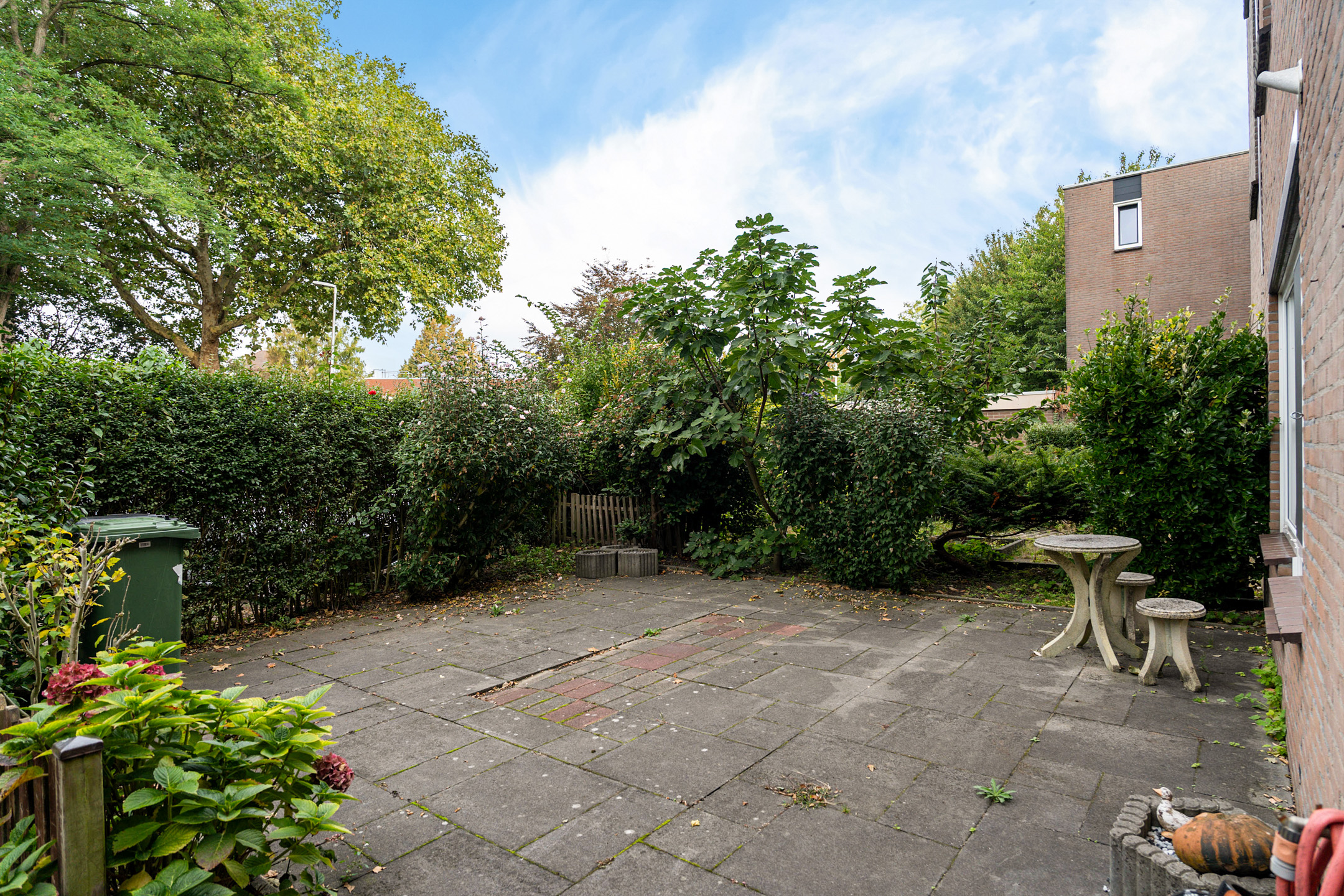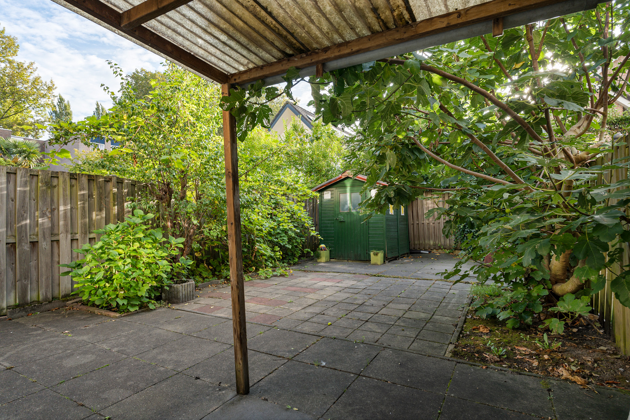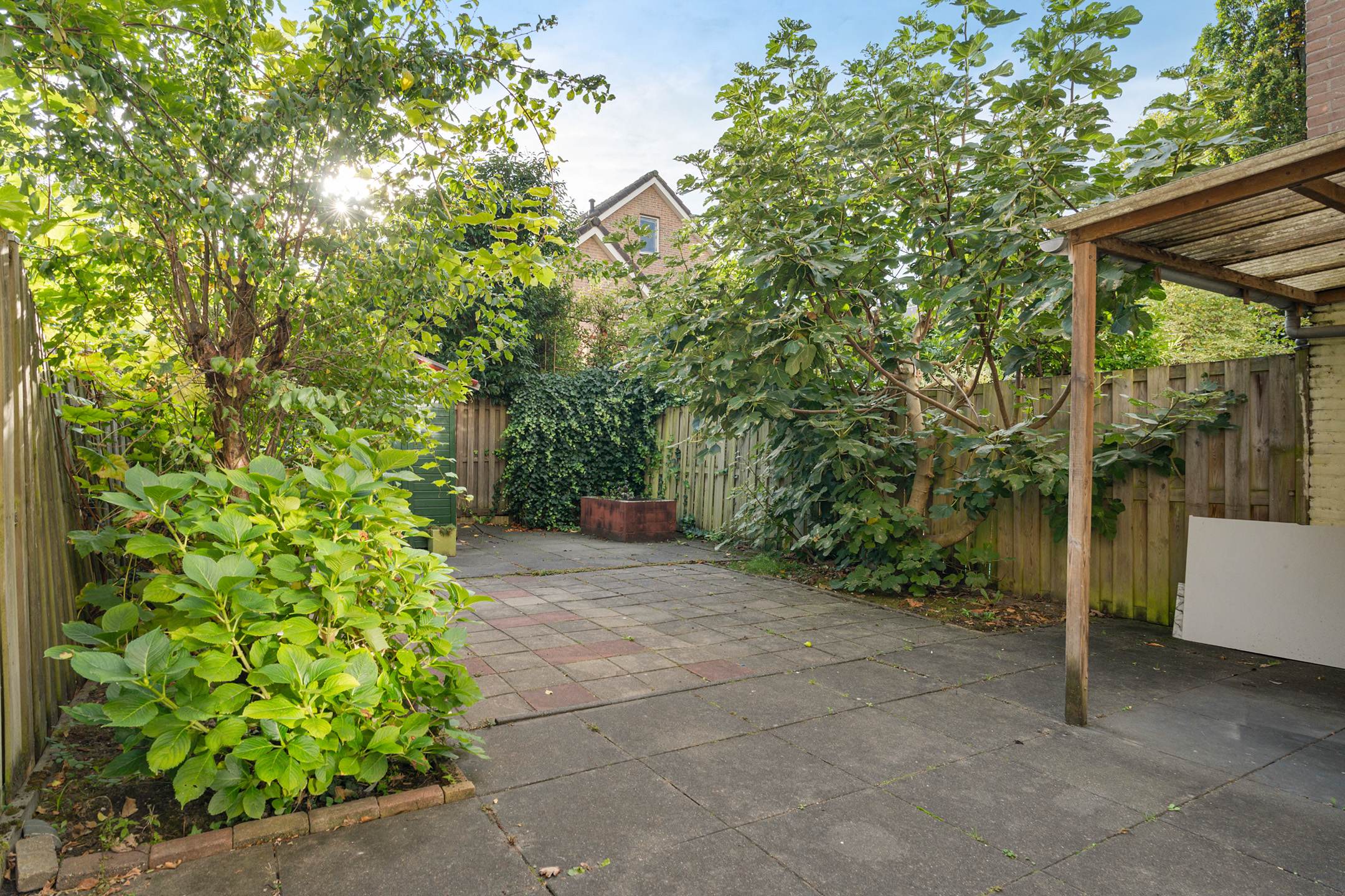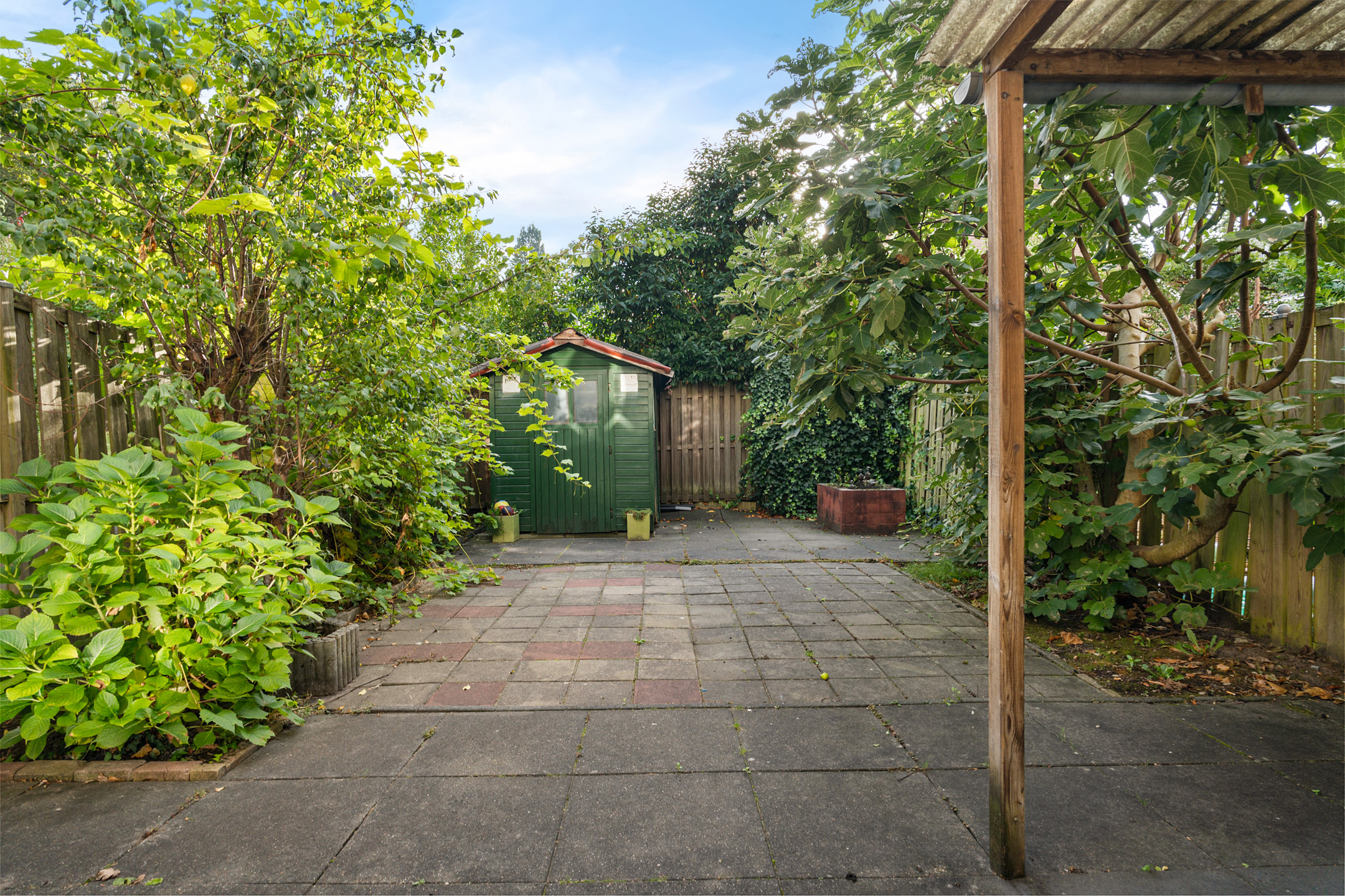 De achtertuin is maar liefst 9,5 meter diep en gesitueerd op het zuidoosten. Dankzij de gunstige ligging geniet je hier van ochtend- tot namiddagzon. De tuin is grotendeels betegeld, beschikt over volwassen beplanting en een vrijstaande houten berging.